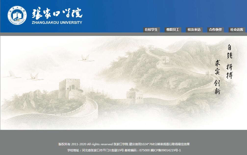 张家口学院是2013年4月经教育部批准设立的一所以教育学、医学和管理学为主干学科,文学、理学、艺术学等多学科相互支撑、协调发展的教学应用型本科院校。学校坐落于2022年冬奥会举办地张家口市西太平山南麓,万里长城蜿蜒穿过校园,堪称中国高校独一景观。现为国家中小学教师培训基地、河北省中小学骨干教师培训基地。学校校园占地656亩,规划占地近1000亩,现有校舍总面积22万平方米。校园依山构建,绿荫叠翠,楼台水榭,错落有致,与雄关美景交相辉映,相得益彰,是读书治学之理想园地。学校现有教学科研仪器设备总值6230万元,建有10个实验中心;拥有附属小学、附属幼儿园各1所,附属医院2所,实训基地120个;图书馆纸质藏书104万册,电子图书304万册。学校现有教育学院、教师教育学院、文法学院、数学与信息科学学院、外语学院、旅游与环境学院、经济与管理学院、护理学院、医学院、临床医学院、体育学院、冰雪学院、美术学院、音乐学院14个二级学院,设有思想政治理论课教研部、医学基础部2个教学部。学校本科专业26个,专科专业13个,主要涉及以培养师资为主的教育类专业、以培养医护人员为主的医学类专业和以培养财会人员为主的管理类及相关专业。现有全日制在校学生1万余人。学校拥有一支素质优良、结构合理、勇于创新的教师队伍。现有专任教师509人,其中高级职称教师229人,教授73人,硕博士学位教师289人,省市级各类优秀教师百余名。学校积极参与国际校际交流与合作,与美国莱特州立大学、新西兰瑞金特国际教育集团建有良好合作关系。学校秉承“自强、拼搏、求实、创新”的校训精神,明确以“人才培养为重、面向基础需要、服务区域发展”为办学宗旨,多年来为京津冀及周边地区培养了6万余名适应经济社会发展需要的优秀毕业生,近几年应届毕业生的就业率均在95%以上,位于全省高校前列。学校秉承历史传统,主动融入“2022冬奥会”“京津冀协同发展”“可再生能源示范区”三大历史机遇,坚持走内涵发展、质量发展、特色发展道路,为实现建设独具特色的区域知名大学而不懈努力!