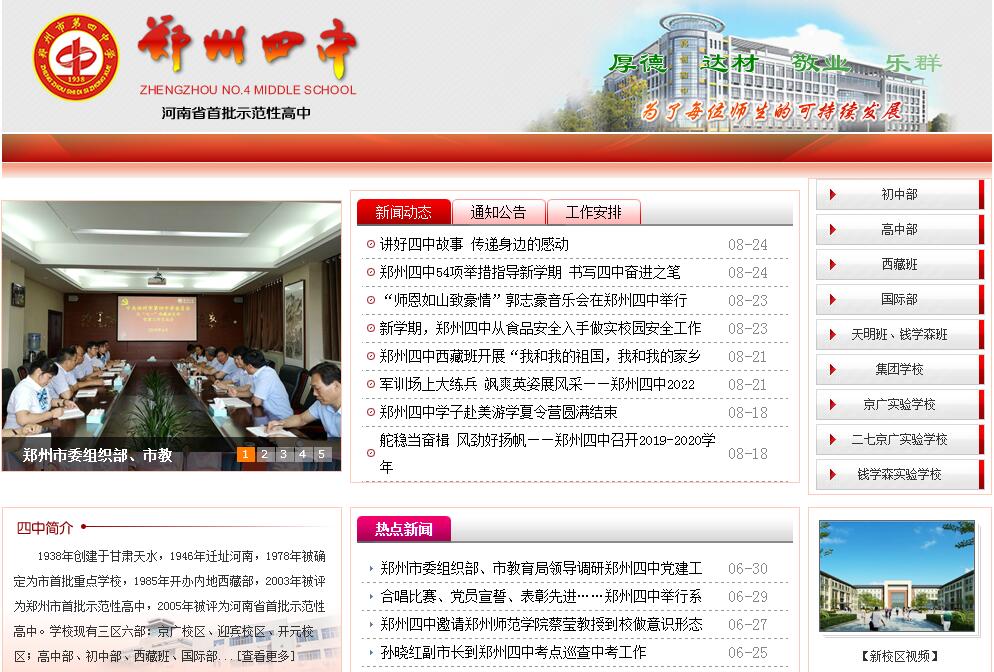 1938年创建于甘肃天水,1946年迁址河南,1978年被确定为市首批重点学校,1985年开办内地西藏部,2003年被评为郑州市首批示范性高中,2005年被评为河南省首批示范性高中。学校现有三区六部:京广校区、迎宾校区、开元校区;高中部、初中部、西藏班、国际部、郑州市京广实验学校、郑州市二七区京广实验学校。一线教师中有研究生或有研究生学习经历的老师147余人;特级教师3人,高级教师110人,一级教师127人;国家省市学科带头人19人、骨干教师50人,省市名师12人,郑州市教研室中心组成员14人(郑州市最多),郑州市“十佳”班主任1人。省市级名师、骨干教师、学术技术带头人占教师人数的三分之一。现有郑州市校长工作室、名师工作室、名班主任工作室各1个、郑州市学科基地2个。高中连续14年、初中连续11年获郑州市教育教学先进单位。先后获得全国教育援藏先进单位、全国艺术教育先进单位、河南省教育系统先进单位、河南省依法治校示范校、郑州市人民满意学校、郑州市创课教育示范校党200余项称号。办学理念:为了每位师生的可持续发展;学校校训:厚德、达材、敬业、乐群;管理理念:每位师生都重要、每位师生都优秀,没有完美的个人、只有完美的团队;办学目标:有文化、有追求、有责任的优质学校;四中精神:向善 向前。2015年高中本部文化课考生368人,一本上线271人,2016年考生412人,一本上线372人,2017年考生406人,一本上线378人。学科竞赛中,2016年共获得市一等奖以上25人次,二等奖40人次,2位同学获高中物理竞赛全国二等奖,1人获高中化学竞赛全国二等奖;2017年获得市一等奖以上的727人次,二等奖52人次。2016年开始,清华、北大开始投放领军、博雅计划。2014年吕啸宇被北京大学录取,2015年刘曹毅被北京大学录取,2017年张瑛、李翰阳被北京大学录取。初中本部毕业生考入省级示范性高中的人数三年增长2.8倍。二七京广实验学校2015年毕业生有77%学生升入省级师范性高中,2016年有90.3%的学生升入省级示范性高中,西安交大少年班提前录取1人,2017年有90.7%学生升入省级师范性高中。学校“以美育人 多元发展”唯特色,美育活动丰富多彩,三年来获省级以上比赛奖励4次,在国内外展演22场,其中在2016年获第五届全国中小学生艺术展演中获一等奖第一名。学校体育工作取得优异成绩,2016年我校乒乓球队获全国学校乒乓球赛个人第二名,团体第四名;2015年全国健身操舞大赛获特等奖;2015年获国家中学生篮球锦标赛第三名,2017年获全国中学生篮球河南赛区女子冠军多名学生获得特招、单招资格。学校社团活动丰富,目前拥有42个学生社团,三年来,获得省级以上创新类比赛奖励82项;省级以上技术设计类比赛成果奖23项;省级以上机器人类比赛获奖25项、创新发明奖3项、全国电脑制作一等奖1项、全国科技创新比赛二等奖1项。社团成员获全国自主招生推荐奖。四中国际部获得三大官方机构认证(美国大学理事会授权AP教学中心,英国最大考试局A-LEVEL授权教学中心,加拿大学术英语水平测试(CAEL)授权考试中心),有中美、中加两个项目。同时,每年接收5—8名外国留学生,通过交流,开阔视野,理解不同文化,增强全球情怀。向善,鸿业远图正当时;向前,鹏程万里扶摇上。走进四中你就走近了高等学府。