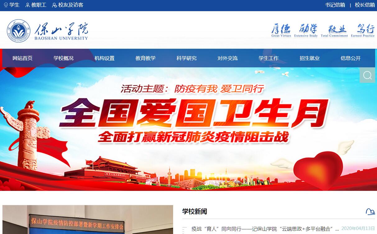 保山学院位于云南省保山市,办学历史可以追溯到1905年创办的“永昌师范学堂”。1978年4月经教育部批准成立保山师范专科学校。2009年4月经教育部批准升格为保山学院,实行省市共建,以省为主的管理体制。升本以来,学校科学谋划、精心布局、不断改革,逐步实现了从专科向本科、从师范向综合的转变,办学水平显著提升。2013年学校通过审核成为学士学位授予单位,2014年学校获选为云南省首批两所 “国门大学”基础能力建设高校之一,2015年学校获选为云南省十所“地方高校转型发展试点改革学校”之一,2016年学校获选为云南省“创新创业改革试点学院”,2017年学校获选为云南省首批六所“应用型人才培养示范院校”之一,2017年学校经国务院侨办批准为云南省两个“华文教育基地”之一。39年来,学校坚持在“边、农、少、山”地区办学,培育形成了“扎根边疆、服务基层、艰苦创业、开放创新”的保山学院精神,走出了一条艰苦创业的发展路子。学校秉承“厚德、励学、敬业、笃行”的校训,为社会输送了近4万名专门人才,有力促进了地方经济社会文化发展,为民族团结进步、生态文明建设和边疆和谐稳定做出了重要贡献。目前,学校占地793.24亩。2017年10月经保山市委市政府研究同意,在保山市工贸园区征用土地700余亩建设新校区。学校现有校舍建筑面积25.20万平方米,教学行政用房面积14.85万平方米,教学科研仪器设备总值6119.64万元,馆藏纸质图书97.91万册,电子图书229.15万册。校内实验实训室153个,校外实习实训教学基地56个。有15个二级学院,35个本科专业,22个专科专业,全日制在校生8521人,其中本科生6716人。在职教职工638人,其中专任教师457人(具有硕士以上学位教师占 67.40%,高级职称教师占38.29%,“双师型”教师占54.49%)。学校还聘任中国“两院”院士戴永年、孙汉董、黄润乾等在内的客座教授72人。学校以地方经济社会发展需求为导向,不断优化学科专业结构,教学成果逐年增加。现有省级应用本科转型专业1个,省级特色专业1个,省级精品课程4门,省级双语课程1门,省级教学团队2个,“云岭教学名师”2人,省级教学名师5人,“兴保人才奖”1人,永昌教学名师2人。省级示范实习实训教学基地1个,省级人才培养模式创新实验区1个,省级“宝玉石特色专业群实习实训基地建设与技术创新服务中心”1个,省级“旅游产品设计与开发特色专业群实验实习实训基地建设与技术创新服务中心”1个,省级创新创业改革试点学院1个。2009年以来,共获省级二等教学成果奖3项,省级教学质量与教学改革工程项目56项。学校坚持学科专业一体化、教学科研相互促进的理念,学科建设和科学研究有力地支撑、促进了教学改革和人才培养,提高了教学质量和水平。现有云南省高校B类高原一流学科(生物学)1个,云南省哲学社会科学研究基地(杨善洲精神研究基地)1个,云南省高校工程研究中心(宝玉石特色产业研究与发展工程中心)1个。学校与云南省科协合作共建“朱有勇院士工作站”,与云南省食品安全研究院合作共建“云南省食品安全研究院保山分院”,与云南省科技厅合作加盟为“云南省地方本科高校(部分)基础研究联合专项资金”理事单位。2009年以来,获国家社科基金项目10项,国家自然科学基金项目3项,国家艺术基金项目1项,省部级项目39项,市厅级项目206项,横向项目20项,获批中央财政支持地方高校发展专项资金科研平台建设项目17项,总经费达3100余万元。出版学术著作65部,主编教材43部;获省哲学社会科学优秀成果奖4项,省科学技术进步奖三等奖1项,市科技进步奖一等奖1项。学校坚持开放办学,加大国门大学建设力度,注重校际合作、校企合作、国际合作。近年来,先后与政府、学术机构、企事业单位围绕产业发展、教育事业和旅游文化提升等领域签订了92个人才培养合作协议。与西安交通大学、首都经贸大学、上海电力学院、云南大学等省内外高校签订了对口帮扶协议。与美国、韩国、印度、泰国、缅甸、马达加斯加及我国台湾地区的16所大学签订战略合作协议,并与马达加斯加图利亚拉大学和泰国暹罗大学共同成立了“中非珠宝产业研究中心”。与缅甸珠宝总商会达成到缅甸合作办学协议,为缅方培养宝玉石专业人才。面向缅甸北部地区培养华文教育师资527人次。2016年成功举办“中缅文化周”,仰光大学等4所缅甸高校和首都经贸大学、云南师范大学等8所国内高校参加了活动。2017年成功举办“滇台高校学术文化交流周”,佛光大学等5所台湾地区高校应邀参加。学校坚持质量立校,深入实施本科教学质量与教学改革工程,人才培养质量不断提高。2008年以来,连续9年获得 “云南省高校毕业生就业创业工作目标责任制考核”一等奖,2015年、2016年荣获“就业创业工作创新奖”和“鼓励大学生自主创业先进集体奖”。近三年,本科毕业生创业率分别为3.53%、1.98%和2.90%。2016年以来,共获省级大学生学科专业竞赛奖励185项,获国家级大学生创新创业训练计划项目29项、省级37项。2016年获第二届中国“互联网+”大学生创新创业大赛全国铜奖1项,云南赛区金奖2项。2017年获第二届中国“互联网+”大学生创新创业大赛云南赛区金奖1项、银奖6项、铜奖7项,在云南省高校中名列前茅。经过多年努力,学校在社会建立起良好的形象。先后荣获“云南省普通高校思想政治工作先