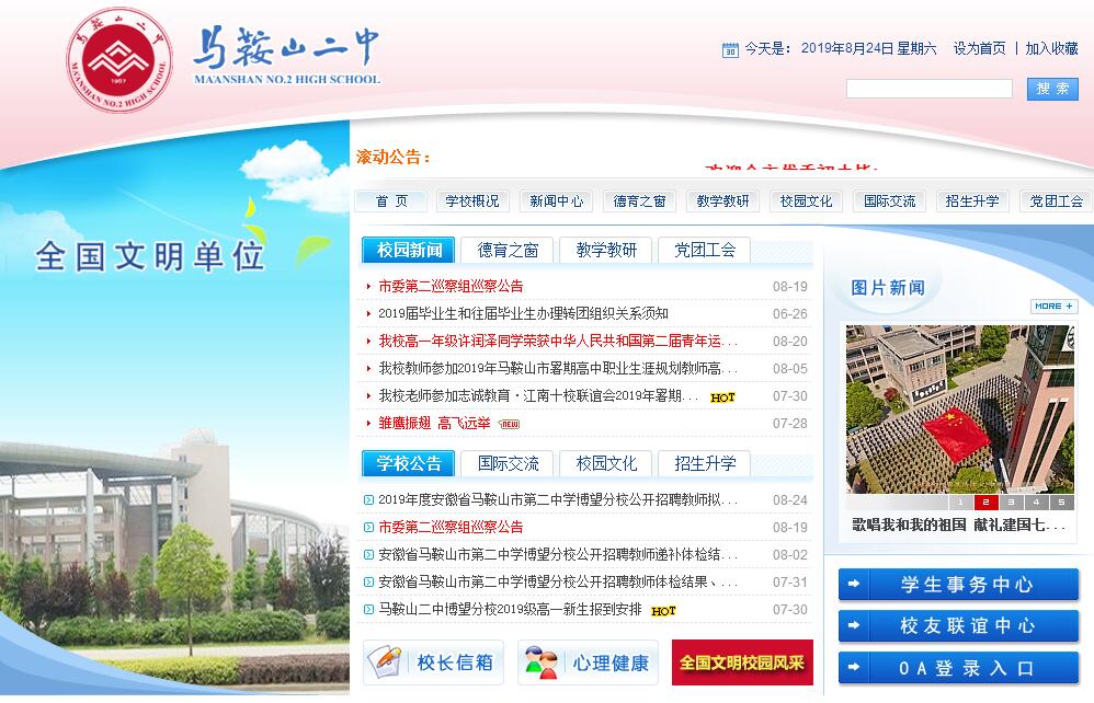 安徽省马鞍山市第二中学创建于1957年,是全国文明单位、全国精神文明建设先进单位、全国中小学德育工作优秀案例单位、教育部全国百所重点联系学校之一、全国绿色学校、全国中小学现代教育技术实验学校、全国消防安全教育示范学校、安徽省重点中学、安徽省首所示范高中、北大“中学校长实名推荐制”推荐资质学校、清华大学“新百年领军计划”推荐资质学校、复旦大学“望道计划”推荐资质学校。学校占地240亩,建筑面积5.3万平方米,现有58个高中教学班。校园环境优美,布局合理,设施先进。学校举办有“创新人才实验班”、“国际班”、开展有AFS项目、新加坡留学项目等对外交流教育项目。学校办学成果丰硕,先后荣获国家级表彰21项和省级表彰20项,被省教育厅赞誉为“城市中学一枝花”。学校培养了大批优秀学生,先后有伍健、王亚伟、秦敏、姜韬、冯沁雪等5位省高考文、理科状元,百余名学生保送进入国内外名校;参加国家、省级学科竞赛获一、二等奖1000多人次,其中有国际奥林匹克金牌和理论特别奖得主周沛;作为省体育传统项目(田径)学校,学生除取得田径类优异成绩外,还多次获得健美操、武术、定向越野、篮球、乒乓球、羽毛球等比赛的好成绩;秉承“厚德、励学、敦行”校训,坚持办好校报校刊《群星报》《雏鹰》、校园电视台、广播站、英语角、中学生业余党校、二中文化讲坛、校园文化艺术节、“感动校园人物(集体)”“十佳教师”评选表彰等一系列活动,形成了丰富多彩的校园文化。独具特色的育人环境使二中学子具有了视野开阔、个性活泼、善于合作、勇于创新的特点。学校拥有一支思想过硬、吃苦耐劳、学识水平高、业务能力强、实力雄厚的师资队伍。他们爱岗敬业,教书育人,用自身的人格魅力和学术素养培养和影响着一代又一代的学生。在职教师中,有特级教师11人,市学科带头人6人,市骨干教师27人,25位教师具有硕士学位。近年来,19位教师先后取得省“教坛新星”称号,10多位教师代表安徽省参加全国中学课堂教学大赛,7位教师荣获一等奖,100多位教师主持和参与了国家和省级立项课题研究。新时期的马鞍山二中正在以“办人民满意的二中”为宗旨,坚持实施人才强校、质量立校、文化兴校等三大战略,积极探索一条具有二中特色的高质量的办学之路,努力把二中办成平安校园、文明校园、和谐校园。