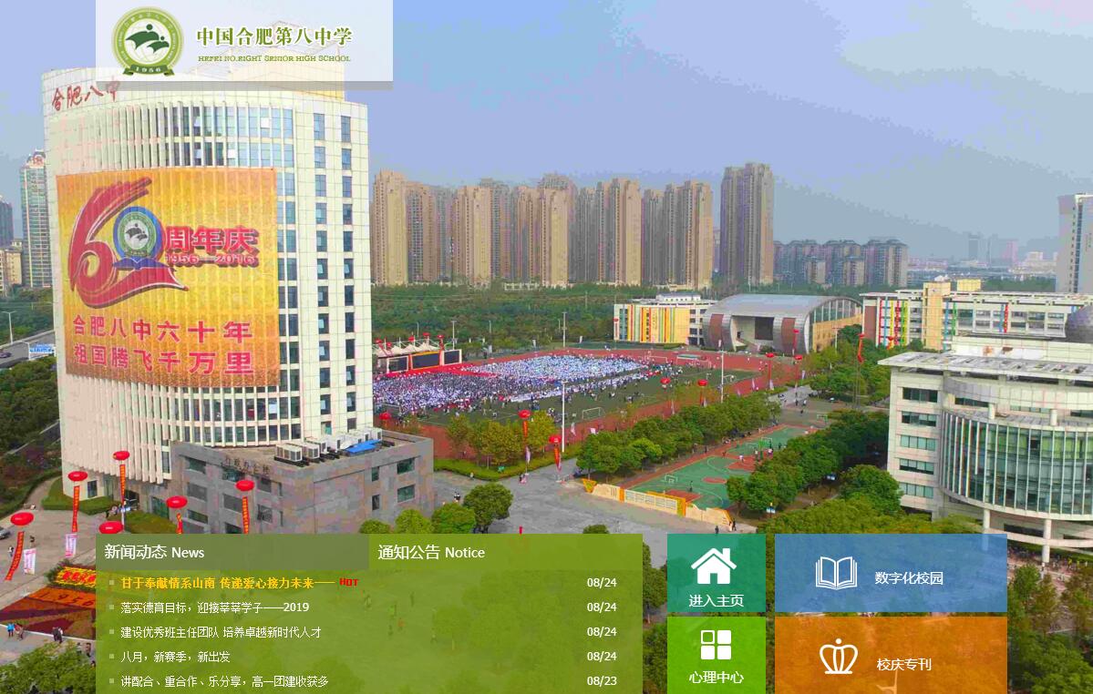 合肥市第八中学,创办于1956年,时为初级中学,1970年开始招收第一届高中学生,成为一所完全中学。1998年高初中分离,成为一所高级中学。1999年被评为合肥市示范高中,2002年被评为安徽省示范高中。学校自创办之初的北油坊巷借地办学开始,到后来扎根于万慈会堂旧址,计五十余年,期间数易其址,直至2008年整建制从桐城路老校区搬迁至合肥市政务文化新区,一所全新的现代化八中自此诞生。学校现占地150亩,建筑面积14万平米,现有100多个班级,5300多名学生;420多名教职工。教学设备先进,师资力量雄厚,先后荣获“国家青少年普法教育先进集体”“普通高中新课程改革先进单位”“合肥市先进单位” “合肥市教学质量综合评价一等奖” “合肥市花园单位”“德育工作先进单位”“常规管理工作优秀学校”等光荣称号。合肥八中校风淳朴、治学严谨,管理规范。建校五十年来,历经风雨坎坷,与共和国共同成长。一代代八中人薪火相继,不辱使命,为祖国的教育事业矢志不渝,开拓进取。学校草创之初,前辈们披荆斩棘,艰苦奋斗,为八中每个阶段的发展打下了扎实的基础。文革期间师生们坚守阵地,坚守信念,执着于教育理想,敢于在逆境中抓教学、抓质量,让人类文明之火始终在八中人手中传承。恢复高考之后,八中迈开大步,领跑合肥教育,声震遐迩,被人们誉为“不是重点的重点”“人们心目中的重点”“无冕之王”。上世纪90年代开始,学校砺志创新,率先在全省施行内部管理体制改革,教育教学质量不断提高,年年被市教育局评为教育教学质量一等奖。2009年,全省文理科第一名同时花落八中,2010年,获市理科第一名,2011年获市文科第一名。2012、2013年高考全市七项指标,我校获六项第一。近三年来高考升学率又进一步提高:三本达线率稳定在98%以上;一本达线率从2013年的55.7%提升至2015年的74.3%,提升幅度达到33.3%。今年再次斩获全省理科状元和文科第五名。学校将学生的自理自律精神的培养和创新能力的锻炼作为教育教学的目标,并为特长生创设发展平台,平等对待每一个学生,把学生的终身发展放在教育的首要位置。莘莘学子源源不断地从这片小小的校园走出,走入社会、走向世界。国务院总理李克强,工信部部长、党组书记苗圩等一大批杰出校友成为祖国政治、经济、文化界的栋梁之才。“人说八中老师好”,这是社会对八中老师朴素而高度的评价。合肥八中拥有一支高素质的教师队伍,特别是一支爱生如子的班主任队伍,他们师德高尚,业务精湛,敬业爱岗,堪为人师。近年来,学校针对年轻老师大量加盟的现实,提出了“老师与学生共同发展”的办学理念,不断强化基础管理,大力开展校本教研和集体备课,努力推动教师专业发展,教师队伍素质不断提高。学校师生和谐,作风严谨,务实发奋,不事张扬,形成了自己的办学特色!我校近年积极推进课程改革,构建了符合八中实际、促进八中特色发展和全面贯彻教育方针的新课程框架,即基础性课程、限定性拓展课程、非限定性拓展课程、研究性课程和实践活动课程。所有课程都围绕学生,相互渗透,相互依存;着眼于培养目标,着眼于创新能力,着眼于个性发展,以满足越来越凸显出来的学生个性化需要,同时,以全面科学的评价模式开展生涯规划教育和信息化教学手段来推动和保障课程的实施,以保证课程质量。让学校走上了特色化发展之路。近年来,学校把国际合作办学作为新的发展战略,引进国际化教育理念,引进国外教育资源,以期培养具有国际视野、融汇各国优秀文化的21世纪的世界公民。学校创办了国际部,开展了中美合作项目、AFS项目活动等。学校还与韩国、日本、法国、英国、德国、加拿大等国开展了广泛的文化交流。校际互动,师生互访,一个国际化的学校正在逐步形成。回眸过去,成绩喜人,展望未来,干劲倍增。新世纪,社会对教育提出了更高的要求。为迎接新世纪的挑战,合肥八中将办学目标定位为:设备先进,师资雄厚,管理科学,质量优异,有个性,有特色的国际化学校。