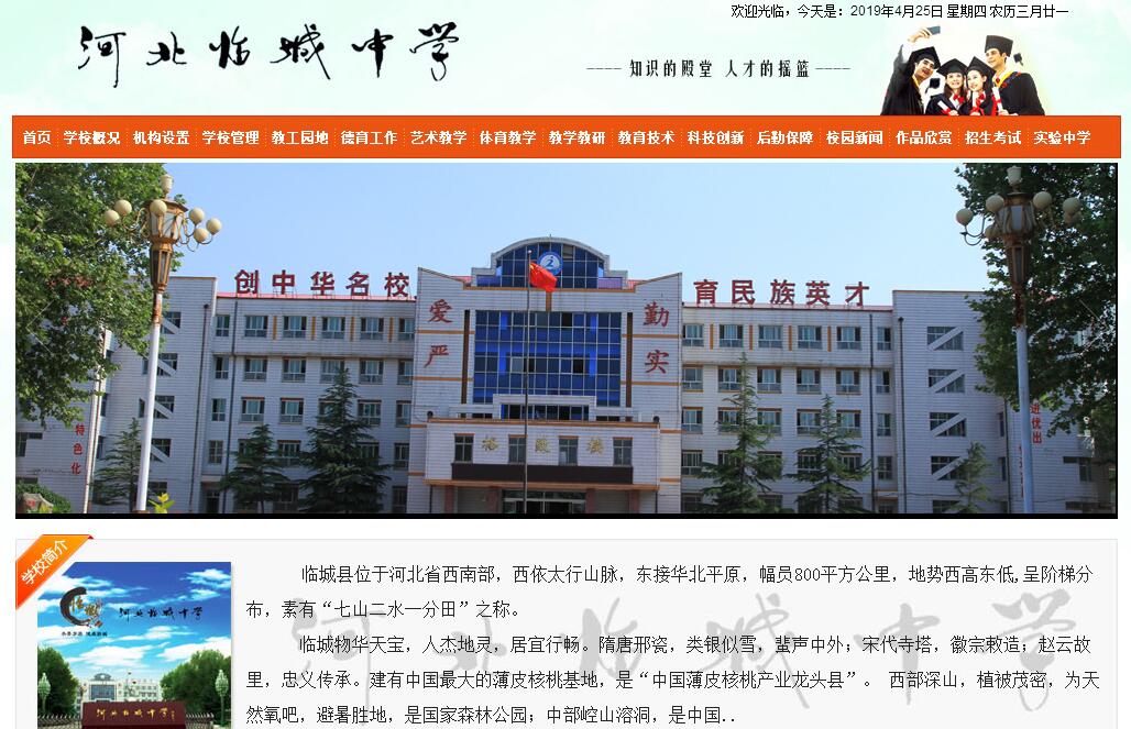 临城是一个仅有20万人口的国家级扶贫开发重点县,教育事业成为行业建设的典范,唯一的一所高级中学——临城中学,是一张靓丽的名片,持续书写着“小县办大教育,穷县办好教育”的绚丽篇章。学校占地213亩,教学班98个,在校生7000余名;教职工500余名。科苑馆按一类标准装备有理化生实验室、通用技术实验室、数字实验室、机器人实验室、软陶制作室、水火箭制作室、计算机室、语音室和科普展室;图书馆藏书达24.9万册,为河北省一类图书馆。教室装有空调和多媒体,实现了教育技术现代化;学生宿舍内建有独立卫生间,安装了空调,住宿条件实现了公寓化。学校始建于1952年,历经艰苦创业、曲折前进、文革十年、拨乱反正、改革复兴、乔迁壮大、稳健提升、内涵发展八个阶段。60多年的文化积淀,形成了完备科学高效的机制。2008年,学校确立了“走内涵发展道路、建优质精品学校”的办学指导思想,坚持“以德立校、依法治校、科研兴校、创新强校”的治校方略,制定了“成才化、名牌化、特色化”的办学目标,实施“高效教学,多元育人”工程,开展教学改革、特长教学、创新教育和综合实践活动;以实现“低进优出、优进高出”的目的。校园文化建设突出文化高雅格调的潜在熏陶功能,整个校园建筑、景观、文化蔚然一体,相得益彰,实现了自然景观之美与校园文化精神的有机融合,为省级园林式学校。学校注重促进教师专业发展,培养出了一批敬业精业的教学精英。有专任教师380人,其中高级教师81人,具有研究生学历230人。获得国家级荣誉称号的教师有8人,获得省级荣誉称号的教师有68人,河北省级骨干教师6人,河北省优质课教师40人,邢台市名师5人,邢台市教坛新秀、骨干教师35人。积极开展教学研究。近两年来,学校教师在国家和省市级报刊发表论文200余篇;教师教育科研课题立项41个,获得省级以上奖励18个;实施校本课程30余种;课例设计及优质课获得市级以上奖励近百人次。在教学上,以优化教学过程,打造高效课堂为重点,努力构建“两案、三步、九环节”高效课堂,调动了学生的积极性,为学生学会学习、自主学习、提高效率、增强素质搭建了平台。在学生培养上实施多样化,拓展培养途径和培养方式。积极开展“四百”、“四进”和“五节”活动,将德育、文体、创新活动和学校课程进行有机整合,构筑了立体化、全方位、多样化的育人体系,使各类学生都能得到全面和充分发展。积极开展特长教学和科技创新教育,组织鼓励学生参加各种大赛。2012-2015年奥林匹克竞赛获得省级以上奖项达976人次,其中,国家级奖项达306人次。科技创新成果丰硕。截至2016年2月,共收到学生创意10000余份,获得国家知识产权局授权500余件,实用新型专利证书487件,是全市乃至全省高中学校专利申请数量和获得授权数量最多的学校之一。在第28-30届河北省青少年科技创新大赛上,11件作品获一等奖,42件作品获二等奖,6件作品获三等奖。在2013-2015年全国中小学信息技术创新与实践活动中,获全国一等奖14个,二等奖68个,三等奖37个,省级一等奖40个,二等奖51个,三等奖42个,获全国、省“优秀指导教师奖”22人次。作为办学实力的集中体现,临城中学的高考成绩享誉燕赵。高考上线人数、上线率连续22年名列河北省省级示范性高中前列,位居邢台各县(市)之首。2015年,高考成绩再创辉煌,1930人参加高考,本一上线461人,本二上线1138人。在高考提前批、本一特殊类型批、本科一批录取中,497名同学金榜题名,403人考取143所名校。其中,51名同学考取 “985”工程大学,148名同学考取“211”工程大学。2016年,高考成绩再创新高,2059人参加高考,本一上线734人,本二以上1764人。在高考本科提前批、本一特殊类型批、本科一批、地方专项计划录取中,598名同学被重点院校录取。其中,3名考生被清华、北大录取,53名考生被“985”工程院校录取,157名考生被“211”工程院校录取,441名考生被其他本一院校录取。在邢台市,清华、北大录取人数、名校录取层次一枝独秀。临城中学在德育工作中实施“综合治理工程”,坚持“活动育人、评比激活”战略,将制度规范、德育活动、安全保卫、依法治校、习惯养成等工作进行整合,实现了德育组织网络化、内容系列化、方法时效化、形式多样化、活动课程化。有利促进了良好校风的形成。自上世纪八十年代以来,临城中学先后被确定为省重点中学、省示范性高中、省现代教育技术实验学校、省课改样本学校、NOC信息化教育实验学校、河北省县区级星级业余体校、河北省体育项目传统学校、河北省高中生涯规划教育实验学校、河北省县区级星级业余体校、国防生生源基地、国家重点课题实验学校、全国校园安全教育重点实验学校;荣获“河北省文明单位”“河北省安全文明校园”“河北省高中课改教育教学研究成果先进单位”“河北省普通高中课程改革先进学校”“全国群众体育先进单位”“全国安全教育重点科研单位”“全国教育科研先进单位”“全国创造教育先进集体”“全国创造教育科研先进集体”“中华百佳素质教育先进集体”“全国校园安全教育工作先进单位”等280多项国家、省、市、县荣誉称号。风雨兼程,矢志磨砺,续写辉煌。临城中学正充满信心,阔步迈向美好未来!