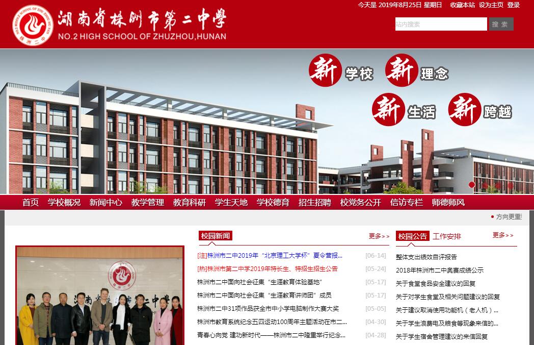 株洲市第二中学始建于1955年5月,是一所全民所有制公立高级中学,1957年被省教育厅确立为省属重点中学,1989年被确认为湖南省首批验收挂牌的六所实验中学之一。1992年成为全省首评估批挂牌的八所省重点中之一。办学六十年,经历两次整体搬迁,原址在株洲市贺嘉路13号。因地少人多,发展受限,1996年整体搬迁至天台路33号。2014年4月,株洲市人民政府为满足群众对优质教育资源的需求,决定将我校整体搬迁至博古山东路728号,并作为政府十大民生实事工程来督办。2014年9月1日,学校顺利迁入新校址办学,目前在校师生3000余人。建校以来,二中人风雨兼程、历经艰辛,始终扛起株洲基础教育的领航大旗,成为株洲市基础教育的窗口,树立了“三湘名校”的优质教育品牌。学校230余名专任教师中,有在岗特级教师7人,正高级教师2人,高级教师102人,硕士研究生40人,株洲市学术技术带头人、市级学科带头人及城区骨干教师63人,全国、省、市级劳动模范4人,全国模范教师1人,全国优秀教育工作者1人,全国优秀教师3人,全国师德先进个人1人,全国优秀班主任1人,各项指标名列湖南省示范性中学前列。硬件设施一流。新校区投资近7亿,按“山水校园,当代书院”理念设计,历时三年精心打造而成,校园占地面积248亩,建筑面积约10万平方米,可容纳72个班,3600余名学生就读。学校配备国际一流的教学设备与生活设施,功能设施完全达到信息化时代学习的各种需求。学校生活区、教学区、运动休闲区分区清晰,环境幽雅,文化气息浓厚。在这里书声朗朗的教学楼与精致灵巧的思源广场交相辉映,装备精良的实验楼与生机勃勃的曦园相映成趣,优雅灵动的艺术馆与清澈雅致的贺嘉湖顾盼生姿,人头攒动的图书馆与现代化的体育馆遥相呼应,清新舒适的师生公寓与功能完备的生活服务中心两两相望,竹木山石、绿树红墙点缀其间,装饰得校园分外美丽。这里有完备的教学设施,所有教室均配备光纤宽带网络,多功能教学平台等;所有实验室均按照Ⅰ类标准配备。此外还装备了生化数字化实验室、物理奥赛实验室、生物组培室等超标准实验室。这里有最完善的功能室,包括“最前沿”的国防创新教育中心,“最珍稀”的生物标本馆,“最国际范儿”的国际多元素质馆,“最超前”的科学探究馆,“最典雅”的国学馆,“最清新”的心理健康活动中心,“最休闲”的教师书吧,“最动感”的地理功能室……能最大限度满足教学和学生社团活动需要。办学业绩辉煌。高考升学率稳定在90%以上,每年600分高分段人数、文理科地区前30名在株洲地区绝对领先,先后培养了45名湖南省、株洲地区高考文理科状元,为清华、北大等名牌高校输送人才逾万。学科竞赛进入省先进行列,每年在全国、省、市获奖人数达500人次,为株洲地区争得了荣誉。创新教育全国有影响,现拥有科技发明成果800多项,在国际、国内发明大赛获奖500余项,40余项发明成果获国家专利;4名学生入选《世界发明家辞典》,11名学生被列入《中国发明家辞典》,被誉为 “三湘名校”、“小发明家摇篮”。学校是教育部科学探究实验基地、教育部全国现代教育技术实验学校、全国首批中央教科所实验学校、国家教委全国首批培养优秀体育后备人才试点中学、国家留学基金会留学预科学院出国留学人才选拔基地、国家级青少年阳光体育俱乐部、湖南省教育厅基础教育学科研究基地、湖南省教育厅体育传统项目学校(足球、田径)、广州军区国防生生源基地、首批株洲市普通高中创新人才培养实验学校。先后被授予全国创造教育先进单位、全国中小学生创造力培养示范学校、全国教育实验先进学校、全国电化教育先进单位、全国劳技教育先进单位、全国创建“平安校园”示范学校、宋庆龄少年儿童科技活动示范基地、全国青少年创新教育示范学校、全国现代教育技术先进单位、“发明家的摇篮”、湖南省模范单位、湖南省文明卫生先进单位、湖南省示范高中督导评估优秀学校等百余项省级以上荣誉称号。回首过去,一代又一代二中人躬耕不辍,弦歌不绝,实践着百年树人的崇高理想。展望明天,二中人将以“追求卓越,只争朝夕”的豪迈气魄谱写更加壮美的教育诗篇!