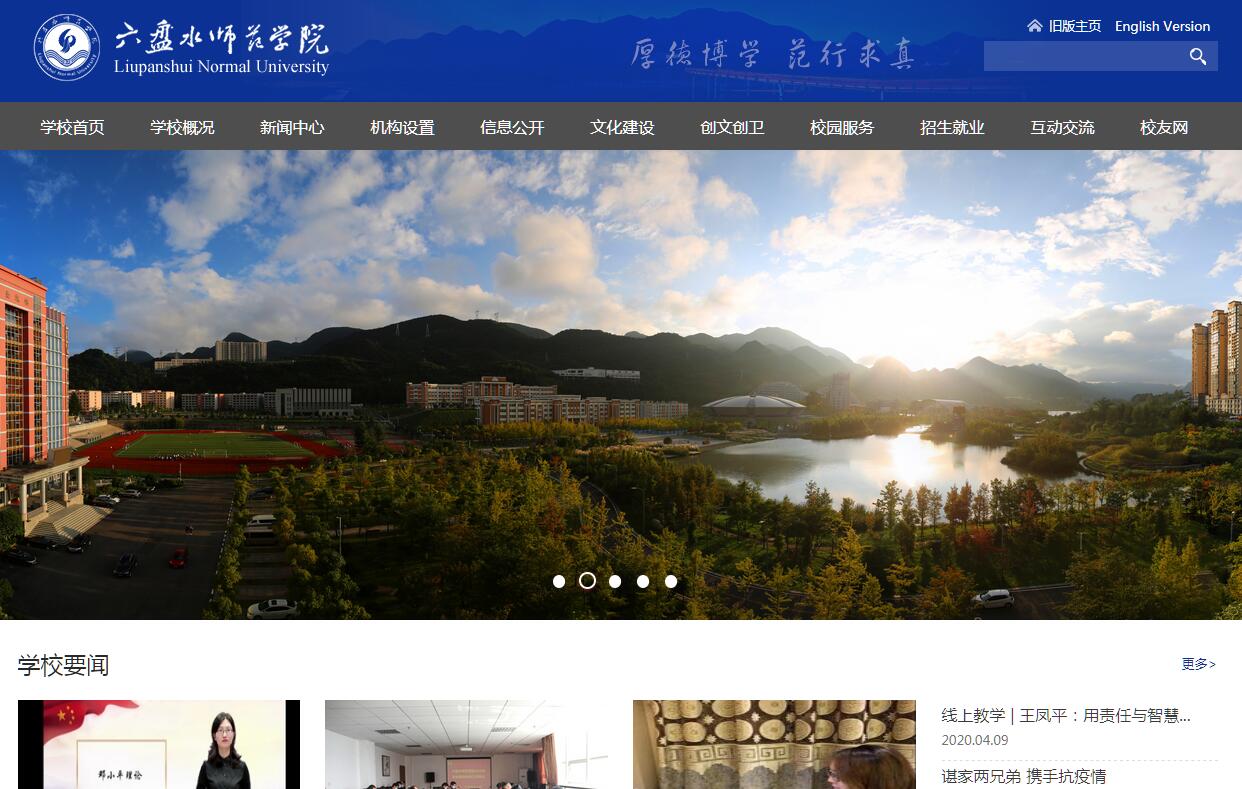 六盘水师范学院地处有“中国凉都”之称的贵州省六盘水市,是“省市共建、以市为主”的全日制普通本科院校。其前身是1978年开始办学的贵阳师范学院六盘水专科班,1985年组建六盘水师范专科学校,1993年更名为六盘水师范高等专科学校,2009年升格为六盘水师范学院。2013年获得学士学位授予单位资格,2015年列为贵州省向应用型转型发展试点院校,2016年通过国家教育部本科教学工作合格评估,并被列入贵州省“十三五”规划期硕士学位授予单位立项建设单位。从2017年开始,与辽宁师范大学联合培养硕士研究生。学校占地面积1310亩,建筑面积357300平方米,与明湖国家湿地公园融为一体,被誉为“贵州最美大学校园”。教学科研仪器设备总值1.03亿元,馆藏图书100余万册,现有教职工757人,其中教授47人(二级教授1人、三级教授1人),副教授227人;博士43人,硕士355人;享受国务院特殊津贴专家1人、省政府特殊津贴专家1人,省管专家1人,市管专家14人;省级教学名师1人,“双师双能”型教师58人。学校设有教育科学与音乐学院、文学与新闻学院、政治与公共管理学院、旅游与历史文化学院、矿业与土木工程学院、化学与材料工程学院、数学与信息工程学院、生物科学与技术学院、电气工程学院、建筑艺术学院、外国语学院、体育学院和继续教育学院等13个二级学院,40个本科专业,涵盖工学、理学、教育学、文学、农学等10个学科门类。面向全国16个省(市、自治区)招生,现有全日制在校学生8000人左右,成人教育学生3200人左右。近年来,承担国家级专业综合改革试点项目1项,省部级教学改革项目42项,卓越人才培养项目2项,获贵州省高等教育教学成果奖7项,省级精品课程2门。在全国大学生各类竞赛活动中,获国家级奖项75项,省部级奖项408项。学校现有省级特色重点学科1个(采矿工程),省级重点支持学科4个(动物学、植物学、物理电子学、矿物加工工程),与六盘水市人民政府、贵州科学院联合组建贵州科学院六盘水分院;建立了贵州省煤炭绿色发展2011协同创新中心、有贵州省煤炭资源清洁高效利用科研实验平台、贵州省矿山压力与岩层控制工程研究中心、贵州省矿山装备数字化技术工程研究中心、贵州省煤系固体废弃物资源化利用特色重点实验室、贵州省特色农业种质资源开发与利用重点实验室、贵州省煤炭绿色开采及矿区生态环境保护科技创新人才团队等一批科研平台。近年来,承担各级各类科研项目1015余项,其中国家级科研课题15项(国家自然科学基金项目8项,国家哲学社会科学基金项目6项,国家艺术规划基金项目1项),省部级项目160项,地厅级项目357项。教师发表学术论文4000余篇,其中核心期刊发表论文700余篇,被SCI、EI、ISTP、CSCI、CSSCI等检索工具收录100余篇,获国家授权专利640余项,独立完成专著、编著61部。学校生物标本馆2016年获贵州省“我最喜爱的科普教育基地”称号。学校坚持开放办学,积极推进校地互动、产教融合、校企合作,成立了乌蒙山发展研究院、中药材研发中心、“三线”建设文化研究中心、“三变”改革研究中心、布依文化研究中心、翻译研究中心等学术研究机构,依托富士康、黔桂天能、水城矿业、盘江煤电等企事业单位建立了105个产学研合作基地和实习实训基地,与上海工程技术大学、辽宁师范大学、大连大学、贵州大学、台湾地区大叶大学、德国德累斯顿应用技术大学、泰国清迈大学等20多所国内外高校建立了良好的合作关系,在提高应用型人才培养质量、服务地方经济社会发展中发挥了重要作用。学校是贵州省省级教师发展中心、省级专业技术人员继续教育基地和省级非物质文化传承人群研修研习培训基地。学校坚持“以需求为导向,以学生为中心,以质量为根本”的办学理念,秉持“厚德博学,范行求真”的校训,弘扬“艰苦创业,自强不息”的办学精神,倡导“团结实干,创新超越”的校风,“勤勉治学,立德树人”的教风,“勤学善思,健体强能”的学风,大力加强校园文化建设,校史馆是贵州省优秀文化育人基地。2017年,学校被评为“贵州省文明校园”。站在新的历史起点上,学校将坚持以转型发展为主线,以内涵建设为核心,以改革创新为动力,大力实施质量立校、人才强校、特色兴校、开放活校四大战略,认真履行人才培养、科学研究、社会服务、文化传承创新四大职能,以建设区域性高水平应用型本科院校为目标,着力培养教师、工程师等应用型人才,构建多科性学科格局,为建成一所特色鲜明、部分学科在同类高校中有较大影响力的地方性应用型普通本科院校而不懈努力。