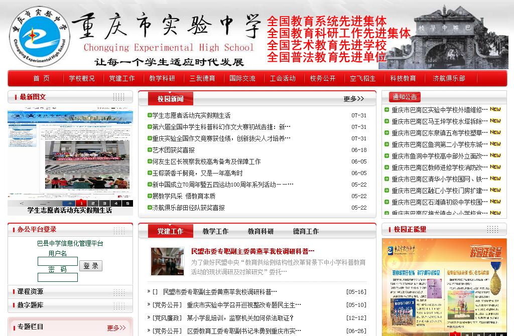 重庆市实验中学(重庆市巴县中学)创建于1907年,是原四川省首批办好的重点中学,重庆直辖后首批重点中学。 2011 年11月22日,经市教委批准,学校正式更名为重庆市实验中学校。学校位于重庆市主城巴南区鱼洞,占地100000多平方米,在校师生6000余人,教师队伍中研究员5名,特级教师9名,中高级以上职称教师200余名,30余人获国家级荣誉称号,近百人获得省市级荣誉称号……学校校园环境优雅,教育设施设备一流:拥有标准足球场、50米游泳池及体育馆、健身房;建有400米和250米橡胶田径运动场各一个,室内篮球场4个;拥有7000平方米的学生食堂和25000平方米的学生公寓;拥有藏书20万余册的图书馆;拥有国家双Ⅰ类标准的理、化、生实验室;作为全国科普教育基地,拥有数十个科技创新、通用技术、综合实践活动功能室。重庆市实验中学(重庆市巴县中学)凝聚着厚重的巴渝文化,有着光荣的革命传统和骄人的办学业绩,是重庆市最早的市立中学之一,是重庆府(市)闻名遐迩的历史名校。志士仁人曾纪瑞、周莲舫、朱必谦、文伯鲁、沈懋德、张筱门、肖华清、赖向农、龚鵷、童庸生、漆南薰、张闻天、萧楚女、吴玉章、恽代英、邓仲夏、文幼章(加拿大)、余时亮等先后在此执教讲学;这里,还走出了胡子昂、周贡植、廖伯康、周钦岳、向宗鲁、饶钦止、彭伯通、胡甫臣、邱万兴、秦运文、丁伟杰、周复昌、吴精华、吴小平、文熙元、吴复兴、祝家麟、阎侗有、孙同川、王洪华、严琦、杨维才、 陈猛等一大批知名人士。重庆市实验中学(重庆市巴县中学)以“让每一个学生适应时代发展”为办学理念,秉承“苦学力行、求是求新”的校训,弘扬“尚公、明耻、图强”的校风,发扬“尚道、精业、修身”的教风,营造“尚学、明理、力行”的学风,坚持走文化立魂、基地奠基、师资兴教、课程育人、质量靓校的科技教育特色学校建设路径,致力于培养具有运动爱好和强健体魄,具有良好心理品质和健全人格,具有中华优秀传统文化和现代科技素养,具有创新精神和终身学习习惯,能适应学习型社会需要的具有国际视野的现代化人才。学校以科技教育为办学特色,先后被命名为全国百强特色学校、全国科普教育基地、重庆市首批科技教育特色学校、首届重庆市科普工作先进集体。学校成立有创造发明协会、摄影社、济航环保社团、天文社、机器人工作室、计算机协会、历史学社等八十多个学生社团;在每年10月的科技活动月,学生根据兴趣选择参与相关科技活动项目,深化在科技校本课中所学的内容;通过“大手拉小手”、“请进来、走出去”、建立校外社会实践基地等多种形式开展了丰富多彩的科技创新活动。教师倾心指导,学生踊跃参加,学校科技教育成就斐然:科技竞赛指导教师团队“‘1+1’创新工作室”被评为2010年重庆市杰出青年群体;学校师生参加全国及市区各类大赛先后获得多项大奖,科技发明和专利成果名列全市前茅,仅2011年我校就获得了“中华人民共和国国家知识产权局”颁发的专利证书136项。学校是重庆市教育国际交流协会基础教育专委会会长单位。经国务院外专局批准,学校取得了直接聘请外国专家的资格,常年聘有外籍教师住校执教。学校与英国、德国、匈牙利、韩国等多个国家的学校结为友好学校并进行交流互访。美国、加拿大、芬兰、澳大利亚、新加坡、意大利等国学者先后来校学习交流。学校是全国中学生篮球分会、田径分会副主席单位,是全国部分重点中学、实验中学联合体成员,重庆重点中学联谊会副会长单位。同时,学校还被市教委确定为新课改实验样本学校,与市内外7个学校结为帮扶对子、捆绑式发展学校、领雁工程学校等,促进了基础教育的发展。近年来,学校办学规模不断扩大,教育教学质量名列全市前茅;学校艺术节、英语周、文学社、运动会、夏令营、科技活动月活动异彩纷呈。重庆直辖以来,学校先后荣获“全国教育系统先进集体”、“全国群众体育工作先进集体”、“全国全民健身活动先进集体”、“全国艺术教育先进学校”、“全国贯彻体育卫生工作条例先进单位”、“全国教育科研工作先进集体”、“全国绿化先进单位”、“全国国防教育先进单位”、“中国走向新世纪特色学校”、“全国‘五·四红旗团委’”、“第一批全国中小学中华优秀文化艺术传承学校”、“重庆市首批‘健康校园’、‘人文校园’示范学校”、“首届重庆市科普工作先进集体”、“重庆市文明单位”等荣誉称号,并入选《中华人民共和国发展大典》(教育卷)。学校是“全国科普教育基地”、“国家级绿色学校”、“全国现代教育技术实验学校”、“全国培养体育后备人才(女篮、田径)试点校”、“全国体育传统项目学校”,被教育部、公安部、解放军总政治部确定为重庆市唯一的“空军飞行学员早期培训基地”,被成都军区批准为中国人民解放军成都军区国防生源基地,被重庆市教育委员会、重庆市科学技术协会命名为首批“重庆市科技教育特色学校”。忆往昔,百年岁月峥嵘,耕耘硕果累累;看今朝,传承百年历史,走向重庆实验。种好改革创新“试验田”,当好科学发展“排头兵”,重庆市实验中学(重庆市巴县中学)正昂首阔步,走在质量立校、特色办校、仁德理校、依法治校、科研兴校、名师扬校的道路上,致力于师有特点、