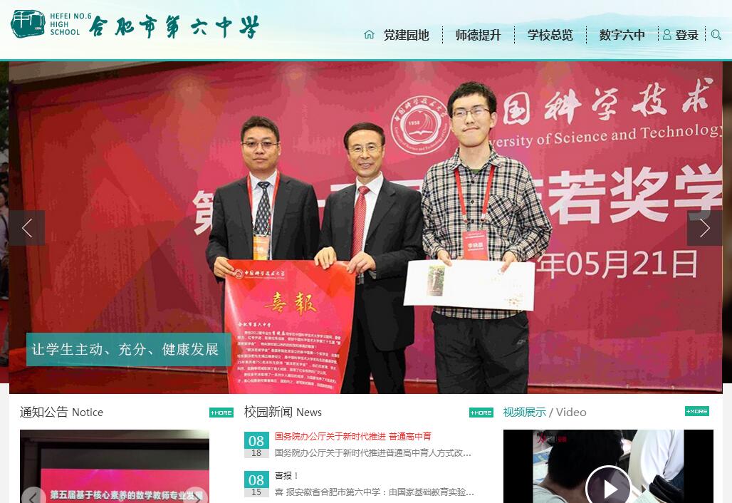 合肥市第六中学创办于1954年,1978年定为合肥市重点中学,1980年成为25所首批安徽省重点中学之一,2000年成功评定为首批安徽省示范高中。作为一所有着深厚教育文化底蕴和优秀办学成果的老牌示范高中,办学优势明显:秉持并践行“办有尊严的学校、做受尊重的教师、育有未来的学生”的发展理念。遵循学生的成长规律和教育教学规律,注重学生社会道德、责任感、价值观、人生观的形成和发展,激发学生潜能,研究学科教学规律、课程建设规律,创建适合师生主动、充分、健康发展的环境。学校名师云集。在职在岗特级教师5人,省级教坛新星12人,市专业技术拔尖人才和学科带头人10人,市级骨干教师24人。高级职称的教师占教师比例50%,居全省最前列近三年,教职工获国家、省、市级表彰80余人次。基于“多元化、特色化”国际办学的理性思考,为进一步彰显国际教育是名校办学的附加值,2016年,合肥六中引进两个高端国际办学项目:北美国际课程中心(引进了美国纽约州最受高校欢迎的高中之一的马丁路德高中全套课程体系,以及该校的教育管理体系和升学规划体系)、剑桥A-level/AP国际课程中心——这是安徽省首家引进的剑桥Alevel国际学校。作为一所“省内一流,全国知名,面向世界,高度开放”的学校,近年来,六中已经陆续与美国、韩国、澳大利亚、新西兰、德国、英国等国家及台湾、香港、澳门等地区的学校结为友好学校,定期开展师生互访,拓宽了师生的视野,促进了国际文化教育的交流合作。学校每年都为“985”“211”等一流高校输送大批优秀生源,高考本科达线率一直在省内名列前茅。截至2016年11月,学校先后获得全国民族团结进步模范单位、国家级语言文字示范化示范学校、全国职工书屋、安徽省女教工工作先进集体、安徽省家教名校、安徽省红十字模范校、合肥市高中教育质量综合评价等奖(连续7年)、合肥市文明单位、合肥市双拥合格单位、合肥市卫生先进单位、星级教工之家、平安校园等称号。