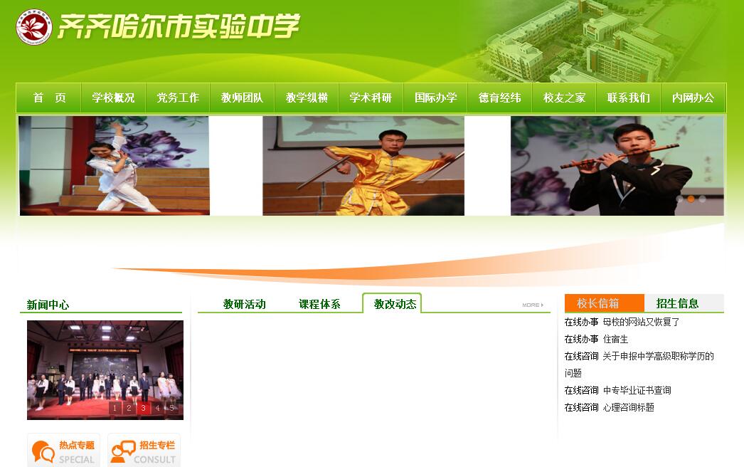 齐齐哈尔市实验中学,始建于1950年,是黑龙江省第一所面向全省招生的高级中学,是全国教育战线百面红旗单位、省首批重点中学、省首批示范性高中。建校六十五年来,学校以悠久的历史文化、先进的办学理念、务实的教风学风,为党和国家培养了以世界著名数学家堵丁柱、神州飞船动力系统总设计师张柏楠等为代表的数万名优秀人才,为祖国发展建设作出了突出贡献。学校现有67个班级,学生3600人,教职工268人;占地面积近13.5万平方米,环境幽雅古朴,文化氛围浓郁;拥有现代化的实验室、多功能网络教室、精品录播教室、学术报告厅,教师人人配有笔记本电脑,各班全部配齐班班通,拥有先进的万兆校园局域网网络系统,搭建了初具规模的现代信息教育平台,是一所现代化花园式学校。近年来,学校坚持以发展的眼光审视思考新时期的育人目标和办学方向,紧抓“谋、育、建”研究型学校建设行动纲领,以“谋学生终身之发展,育中华未来之英才”为理念,以“建设具有深厚人文底蕴、严谨科学精神、浓郁研究氛围、强烈创新意识,能够引领黑龙江高中发展,达到国内一流水平的研究型高中”为目标,以“一体两翼”(即以普通高中教育为主体、以艺体教育和国际教育为两翼)办学模式为载体,不断致力于基于全人教育、终身教育的育人模式改革,加速了学校由传统型高中变身研究型高中的转型提质发展,为广大学生成长、成才创设了优质条件,为学生终身发展奠定了坚实基础。实施“基于人的发展”的管理模式。构建科学现代、务实高效的管理平台,打造智慧和谐的管理团队,采取发展性评价管理策略,完善人人参与的民主管理体系,营造充满人文情怀的管理氛围,引导师生牢固树立了“多元兼容、研究创新、团结协作、追求卓越”的实验中学核心价值观念,把个人生命价值与学校优质发展融为了一体,激发了师生的自觉意识和终身发展能力的提升,为学校优质育人提供了坚实保障。打造崇德尚研师资队伍。加大名校优生引入力度,优化教师队伍结构比例,提高教师队伍整体素质。以师德建设为根本点,以专业成长为着力点,以考核评价为鞭策点,培养出了一支德行高尚、业务精湛的研究型、专家型教师团队。生物等学科成为了全省领先、全国知名学科。优秀教师代表王涤非获2015年全国劳动模范殊荣,现高二学年获2015年全国五一巾帼标兵岗殊荣,现高三学年获市教育系统巾帼标兵岗荣誉称号。坚持“以德为先”育人宗旨。突出抓好德育课程和品牌活动建设,参加《普通高中学生发展指导》国家级课题研究,开设学生生涯规划校本课,开展远足、艺术节、诚信考场、滴水行动、社会实践等德育精品活动,致力于将学生培养成有德行、能自立、勇担当、善共处的合格现代社会公民,为学生实现可持续发展、终身发展引路。创新拔尖人才培养模式。开发了基于研究型学校建设应具备的课程、基于实验中学学生特质应设定的课程、基于新高考改革应实施的课程,逐步构建起了基于需求、引领需求的特色课程体系,为学生提供了多样化的课程选择。深入探索研究型高效课堂教学模式,开展了“英语百家讲坛”、“实验学子观天下”等基于学科特点的研究性学习活动。建成优质高校生源基地,与知名高中强强联合,加大人才培养合力,促进教育教学质量提升。充分利用国际教育师资、课程等资源,面向全体学生,开阔国际视野,让学生在本校就能享受优质的国际教育。加强排球基点校建设,学校女排在历届全国中学生排球联赛中均创佳绩,在第十一届全国中学生排球联赛中获得第四名。开设了数量充足、特色鲜明的艺体校本选修课,收获了学生自主选修艺体课程、人人拥有两项以上艺体特长的育人硕果。建设现代优质育人环境。树立“互联网+”思维,搭建了学校开放式信息管理平台、教育资源整合共建共享服务平台。升级改造校园网,安装录课系统,配备精品课录播教室,开通了网络视频课程、“名师在线”课堂,共享精品课件、教学微视频,实现课堂教学、学生选课、教学评价等教与学系列活动的数字化、信息化、智能化。建设集纸质图书阅览、电子图书阅览、电子书目查询、学生自习交流研讨于一体的多功能学习空间,各类研究型创新实验室以及“桃李园”“生物实验田”等,为学生创设了更优质的学习体验,使学校成为学生研究学习的场馆、创新实践的基地、身心和谐共建的乐园。2015年高考,学校囊括市文理状元、市理科前10名。达到清华、北大录取分数线15人;一本线以上884人,二本线以上1289人。14人获全国奥赛黑龙江省赛区一等奖。其中生物奥赛9人获省一等奖,占全省获奖人数近1/3,2人获国赛铜牌,2人获全国信息学奥赛省一等奖,3人获科技创新国家三等奖。百余名学生在耶鲁青年经济论坛、ASDAN模拟联合国大会、SMT斯坦福数学竞赛、美国高中物理竞赛、全国青少年科技创新大赛等国际性、高水平赛事活动中取得优异成绩。首届国际班有16人赴美国、加拿大、澳大利亚、新西兰、日本等国外一流大学留学深造,146人参加2015年国内高考,其中,15人达到一本线,99人达到二本线,23名艺体特长生以文化课优异成绩通过了艺体特长统一考试,真正实现了国际班学生多渠道、多元化成才发展。多年来,学校综合办学水平不断提升,跻身全省高考、奥赛先进行列,获得了清华大学“