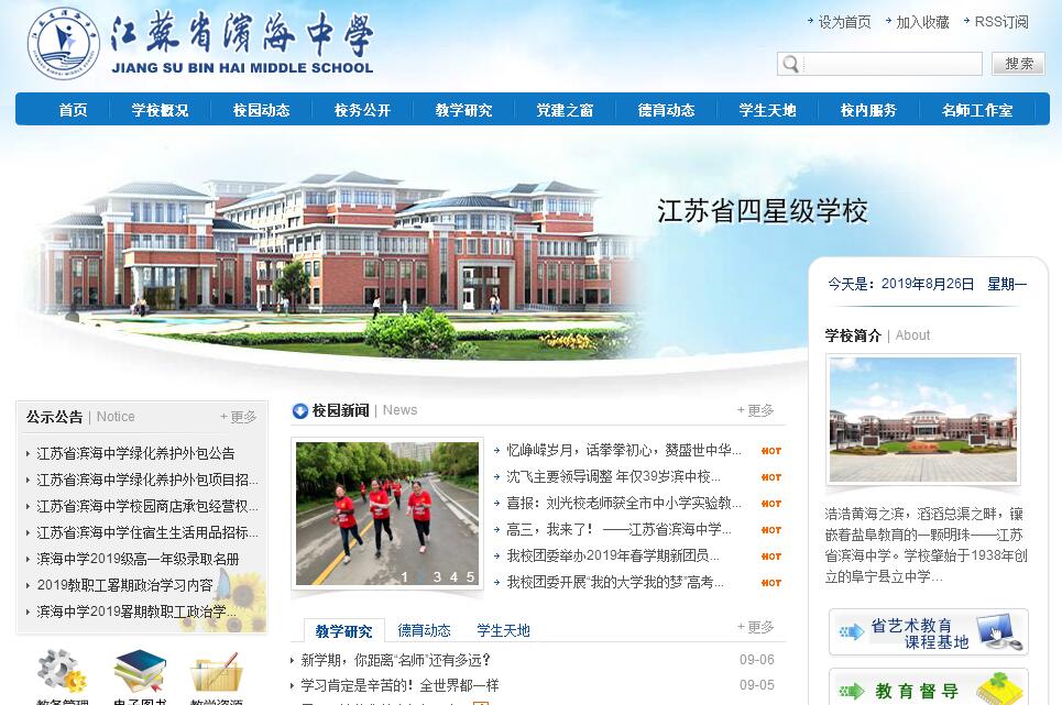 浩浩黄海之滨,滔滔总渠之畔,镶嵌着盐阜教育的一颗明珠——江苏省滨海中学。学校肇始于1938年创立的阜宁县立中学东坎分校。1941年,阜东县政权诞生,翌年9月,遂改名为阜东县立初级中学。1942年滨海县(含现响水县、灌南县部分地区)政权诞生,同年秋创办滨海县初级中学。1949年11月,阜东、滨海两县合并为滨海县。阜东县立初级中学与滨海县立初级中学合并,定名为“苏北滨海初级中学”。1959年,增设高中部,成为一所完全中学,定名为“滨海县中学”。1959年,被省教育厅列为27所重点中学之一。1979年,再度被列为省属重点中学。1993年11月,通过省教委验收,成为江苏省合格重点中学。1996年12月,被命名为江苏省模范学校。1998年12月,通过省标教育现代化合格学校验收。1999年4月,顺利通过国家级示范性高中试评估验收。1999年9月,经省教委批准,更名为“江苏省滨海中学”。2002年4月,成为江苏大学附属实验中学。2003年11月转评为江苏省首批四星级高中。滨海中学在抗日的烽火中诞生,在改革的大潮中崛起,在创业的征程中腾飞。在战火纷飞的年代,校园曾几度搬迁。建校之初,校址设在东坎都天庙,先后迁至陈涛大神簖、坎北徐三层、蔡桥东墩、射阳驳柴港、现东坎镇新农小学等处。1952年搬迁至中市中路68号。2002年学校形成了链条式集团化办学态势,包括附属幼儿园、附属双语小学、附属初级中学、高级中学各一所,当时拥有130个教学班,近万名学生。2010年,按照省教育厅和滨海县委县政府的总体部署,江苏省滨海中学附属双语小学、第一初级中学转为公办学校而独立办学。2010年8月滨海中学迁至现址(中市北路288号)。现校区占地300余亩,建筑面积8万多平方米,校园既具民族风格又有现代气息,是一所设计新颖、功能齐备、设施一流、绿化配套的花园式、生态型学校。拥有4幢教学楼,1幢行政楼,1幢综合楼,1幢图书馆,1幢体艺中心,1座餐厅楼,3幢学生宿舍楼。体育活动区里有400米塑胶田径场、塑胶篮球场、排球场和网球场。建有千兆主干校园网、教育教学信息资源库,所有教室都配备了多媒体教学平台,现代化的设施设备为教育教学质量的提升打下了坚实的基础。目前,学校83个教学班,5000余名在校学生,392名在职教职工。历经半个多世纪的风雨,一代又一代滨中人在滨海这片充满希望的土地上前赴后继,艰苦创业,铸就了学校赖以生存和发展的精神支柱,即协作、进取、敬业、奉献的“滨中精神”,形成了“笃志、博学、求实、创新”的校风,“唯严、唯谨、唯真、唯实”的教风,“不厌、不馁、不疏、不嬉”的学风。七十载春风化雨。滨海中学桃李满天下,向社会输送了4万多名高中毕业生,为国家培养了数以万计的优秀人才。他们中有中共十二届、十三届中央委员,十三届中央书记处书记,第八届全国政协常委,原中共上海市委书记芮杏文;中共十五届、十六届中央候补委员,原国防科学技术工业委员会副主任、党组副书记兼国家原子能机构主任张华祝;中共十七届中央候补委员,广东省委常委,深圳市委书记王荣;参加了中国第一代压水堆型核动力装置、第一座脉冲反应堆、乏燃料研究堆等工程研制,获国家重大贡献奖及金质奖章的中国工程院院士于俊崇;广西壮族自治区党委委员、常委,广西壮族自治区军区政治委员、少将李文潮;总装备部921工程(国家载人航天工程)办公室副主任、神州七号新闻发言人、少将王兆耀等。九十年代以来,学校进一步端正办学思想,明确办学方向,推行教育教学和内部管理体制改革,大力推进素质教育,开创了前所未有的崭新局面。“十一五”以来,学校以科学化、精细化管理为抓手,抢抓机遇,锐意改革,确立了“放眼新世纪,奏响主旋律,走进大课堂,追求高品位”的办学思想,通过加强“六大系统”即以滨中精神为指导的师生理念系统、以“三风”建设为风范的师生行为系统、以素质教育为主线的办学特色系统、以现代化学校为目标的教育发展系统、以优美壮阔为特征的育人环境系统、以示范高中为标准的示范辐射系统建设,来进一步定准办学方位,完善学校形象,推进整体提高。积极推行内部管理体制改革和教育教学改革。在内部管理体制改革方面,改革学校用人制度,实行了领导干部竞争上岗制、年级部管理制、教职工全员聘任制,有效地激发了办学活力;改革内部分配制度,着眼于岗位工作量、绩效,实现了多劳多得、优质优酬,调动了全体教职员工的积极性;改革后勤运作方式,努力实现服务对象、经营方式、资产使用、人员调配等方面的社会化。在教育教学改革方面,构建了素质教育的目标体系、组织体系和运作体系。创造性地提出了“新时期德育工作的十大转变”,逐步形成“按类别要求、分层面施教;小活动运作,大目标疏导;近距离沟通,远方位收效”的德育特色。“三五”教学管理工程和“五杯”课堂教学竞赛,推动了课堂教学效益的提高,学科课程、活动课程、环境课程三轨运行的复合型课程体系,完善了学生的知能结构。近5年来,学校先后荣获20多项省、市级表彰,被评为省绿色学校、省模范学校、省首批和谐校园、省德育工作先进单位、省艺术教育示范学校、省标教育现代化合格学校、省电化教育先进学校、省群众体育先进集体、省贯彻体育条例先进单位、省爱国卫生先进单位,连续四次被评为江苏省文明单位,被命