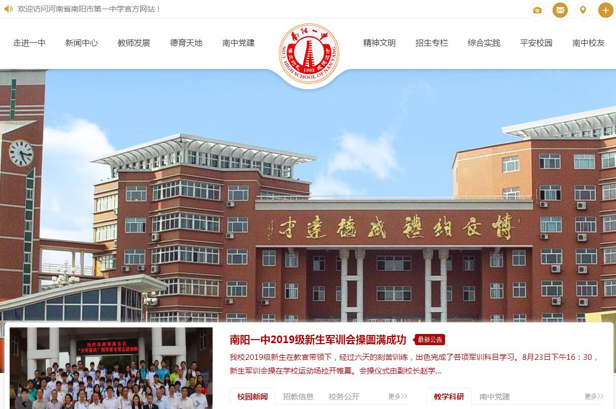 南阳市第一中学校的前身是始建于1335年的宛南书院, 1903年改书院为学堂。建校百余年来,学校先后为国家输送了数以万计各类人才,赢得了社会各界的广泛尊重和高度认可,被誉为“中州师表,教育渊源”。1959年和1978年,学校两次被确定为河南省重点中学;2005年成为河南首批省级示范性高中,并被评为全国精神文明建设先进单位;2005年以来连续六届被评为“中国百强中学”;学校同时获得北京大学“博雅计划”和清华大学“新百年领军计划”推荐资格。百余年来,南中名师荟萃、硕儒云集。20世纪初豫省教苑“北李南张”之张嘉谋首任宛南中学堂总教习,著名教育家、南阳知府杨鹤汀曾任监督,著名考古学家郭宝钧曾任校长,甲骨学大师董作宾先生也曾在此执鞭。抗战时期,避难内乡,教育家高维昌主校,徐玉诺、张子静等名师大家汇集。解放初期黄廷珦任校长,中原名师米至亭、段雅亭、胡耀庭、黄懋德(人称“三亭一德”)等齐聚南中。20世纪70年代以来又涌现出了以邓桦、王天莲、方玉琼、汪君让、姚国铸等为代表的一批特级教师、教育教学专家。他们博雅方正,气度超凡,宛地才俊广受教泽,南阳中学因之不衰。百年南中,英才辈出、桃李满天下。从南中走出的数万名优秀学子中,有以袁宝华、郭树言为代表的政界精英,以丁声树、张勇传、张国伟、余永富院士为代表的杰出学人,以金涛、曹诚、张天为代表的军界翘楚,以王德炳、吴云鹏、张成吉、赵世超为代表的大学校长;还有以姚沁(世界机器人大赛第二名)、王越(新概念作文大赛全国第二名)、聂云飞(“中国科协主席奖”“英特尔英才奖”获得者)为代表的青年才俊,社会名流、教授专家、行业模范,不胜枚举。近年来,学校持续深化课堂教学和管理改革,稳步提升教育教学质量和办学层次。2016至2018年高考,学校共有刘凯翔、刘云鹏、勾艺霖等三名同学摘取河南省第一名桂冠;2018高考,学校一本上线1654人,应届一本上线率89.6%,874人升入“211”“985”院校,占全市1/4,再次被南阳市人民政府荣授“集体二等功”。今天的南阳一中正站在一个新的历史起点上,全体南中师生将继续在市委、市政府和市教育局的领导下,秉承“博文约礼,成德达才”的南中校训,落实立德树人的教育根本任务,大力推进课堂教学和管理改革,以出色的办学业绩为南阳教育事业的发展、为中华民族的强国之梦,再建新功。