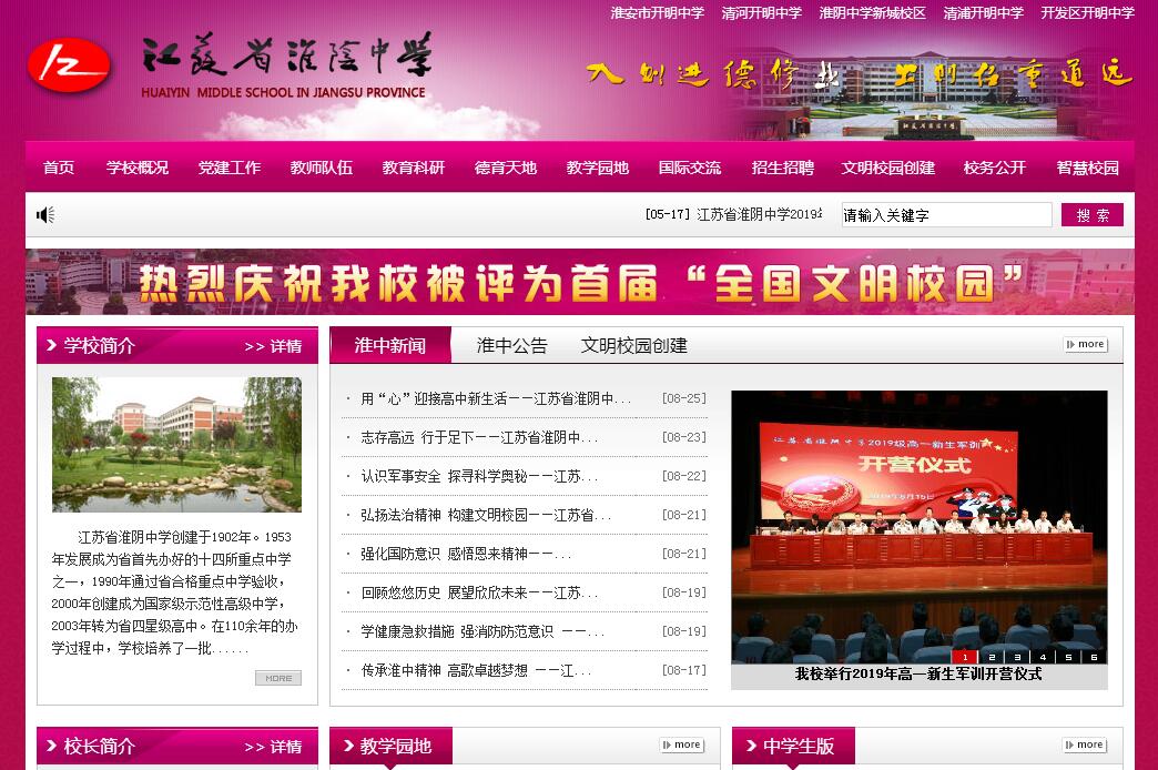 江苏省淮阴中学肇始于1902年创办的江北大学堂,建校伊始遂立“弘毅笃行,进德修业”之校训,承“运河之都”文藻翰墨之运势,薪火相传至今已百余年。在首届毕业生、著名教育家李更生先生倡导的“竖起脊梁担事”精神的指引下,学校虽历经变易,但踔厉奋发,为民族和国家培养了数以万计的杰出人才。新中国成立后,学校逐步发展为完全中学,1953年被确定为江苏省首先办好的十四所重点中学之一,1990年首批通过江苏省重点中学验收,被评为江苏省模范学校。进入新世纪,学校深化教育改革,推进素质教育,聚焦创新人才培养,稳步迈进在优质发展、特色发展、全面而富有个性发展的办学之路上。学校以优越的办学条件、优良的管理策略、优秀的师资队伍、优异的教育质量,顺利通过国家级示范高中评估,成为江苏省首批四星级高中、首批优秀特色课程基地、首批创新人才培养试点学校,成为北京大学、清华大学等全国五十多所一流高校的优质生源基地,并连续三次荣膺全国文明单位,被评为“全国教育系统先进集体”,被中国航空学会授予“全国航空特色学校”称号,获得“全国百强中学”、“全国高中教育50强”等荣誉称号。 2017年被中央文明委评为“首届全国文明校园”。学校不断丰富办学内涵,努力追求“教育不忘、终身受益”的精品教育,以“成就每一位师生的卓越追求”为教育理念,形成“教人成人、教人成己”的教风和“动心忍性、知行合一”的学风,培养了一批批高素质毕业生,教育质量稳居全省最前列,被誉为“受人尊敬、令人向往”的教育沃土。