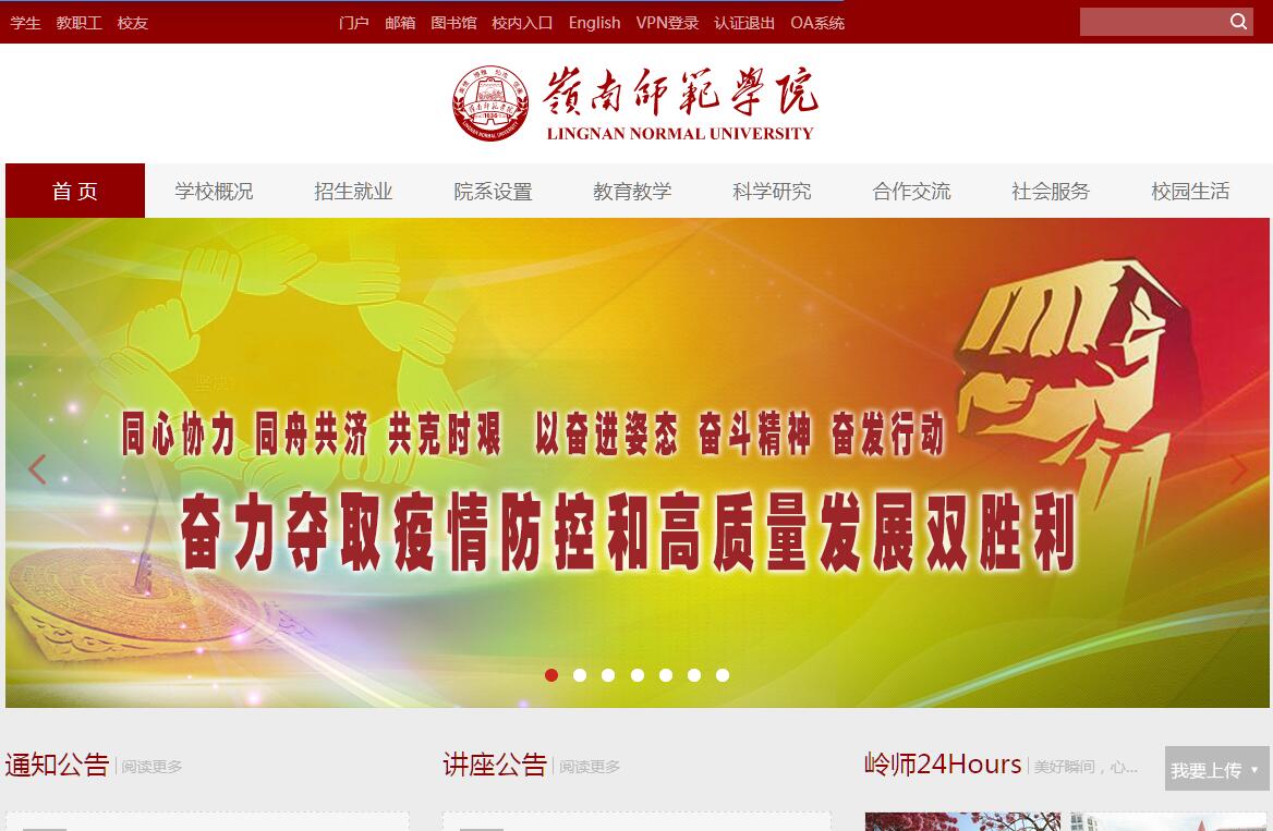 岭南师范学院(原湛江师范学院)是一所具有百年师范教育历史的广东省属普通本科院校,坐落在中国大陆最南端的美丽港城湛江市。学校1904年始设师范科教育,1978年更名为雷州师范专科学校,1991年升格更名为湛江师范学院,2014年更名为岭南师范学院。在百余年的师范教育历程中,学校肩负兴学育人的办学使命,凝练了“崇德、博雅、弘志、信勇”的校训精神,坚持“师范性、教学型,地方性、应用型”的办学定位,培养了大批优秀教师、教育工作者和社会应用人才,为粤西地区乃至广东省的教育文化事业和经济社会发展做出应有贡献。学校2000年成为全国第一所通过教育部本科教学工作合格评估的师范院校,2007年在教育部本科教学工作水平评估中获得优秀等级,2010年被列为广东省新增硕士学位授权立项建设单位, 2016年列入广东首批普通本科转型试点高校、省市共建高校和广东省大学生创新创业教育示范校,2017年被推选为广东省特殊教育教师发展联盟理事长单位;并先后获得“全国精神文明建设工作先进单位”“全国群众体育工作先进单位”“全国绿化先进集体”“教育部依法治校示范校”“教育部大学英语教学改革示范校”“广东省师德建设先进单位”和“广东省文明校园”等荣誉称号。学科专业齐全,构建完备的教师教育体系。设有18个二级学院,建有省优势重点学科2个(教育学、化学)、省特色重点学科4个(课程与教学论、高分子化学与物理、汉语言文字学、材料物理与化学),校级攀峰学科3个、优势学科6个、特色学科3个以及校院共建学科8个。现有本科专业67个(其中师范类专业33个),涵盖经济学、法学、教育学、文学、史学、理学、工学、农学、管理学和艺术学等10个学科门类;拥有国家级特色专业2个(汉语言文学和化学)、省级特色专业6个。师范专业涵盖基础教育、职业教育、学前教育和特殊教育等培养类别,形成了门类齐全、培养培训一体化的完备的教师教育体系。学校面向全国18个省区招生,全日制在校本科生23000多人。优化办学资源配置,不断改善办学条件。校本部占地面积近1000亩,建筑面积58万平方米,教学科研仪器设备总值近2亿元。图书馆拥有纸质藏书224万册、中外文纸质现期刊1937种、电子图书142.8万册、电子期刊13.29万册。建有“全国重点建设职业教育师资培养培训基地”“全国社会工作专业人才培养基地”国家级基地2个及中小学教师、职业教育师资、幼儿园园长、学前教育师资等省级师培基地4个和省级中小学教师发展中心1个,广东高校教师教育教学技能实训中心、艺术实验教学示范中心和化学教学提高型重点实验室等省级教学平台14个。建有省级智库1个(中国-东盟教育文化研究中心),广东省普通高校哲学社会科学重点实验室1个(特殊儿童心理评估与康复重点实验室),省级工程研究中心8个(广东省热带特色资源植物开发工程技术研究中心、广东省粤西资源化工工程技术研究中心、广东省粤西海鲜资源可持续利用工程技术研究中心、广东省辣木资源开发与利用工程技术研究中心、广东省粤西特色生物制品工程技术研究中心、广东省粤西地区太阳能特色利用工程技术研究中心、广东省清洁能源材料化学工程技术研究中心、广东省粤西机电产品设计与制造工程技术研究中心),省级协同创新培育平台1个(粤台教师教育协同创新发展中心),广东省普通高校重点实验室1个(广东省清洁能源材料化学普通高校重点实验室),省高校工程技术开发中心3个(广东高校新材料工程技术开发中心、广东高校植物工程技术开发中心、广东高校数字化学习工程技术开发中心),省级重点提升平台1个(广东高校新型光电功能材料研究开发中心),广东高校人文社科重点研究基地1个(粤西教师教育研究中心),广东省现代农业科技创新中心1个(广东省热带特色资源植物科技创新中心)、国际暨港澳台合作科研平台1个,广东省实践科学发展观研究基地1个,湛江市重点实验室4个。设有教育研究院、新材料研究院、岭南文化研究院等校级研究机构3个及研究所60个。以优师为本,建设高水平师资队伍。现有教职工1500多名,其中教授150多名、博士320多名,高级职称教师占比约40%,硕士学位以上教师占比约90%;“珠江学者”1人,广东省“千百十工程”培养对象151人,28名教师被聘为兄弟院校硕士和博士生导师,58名教师获授国务院政府特殊津贴、全国“五一”劳动奖章、全国优秀教师、省级教学名师和南粤优秀教师等称号;21人被遴选为广东省“扬帆计划”人才;9人被遴选为广东省高等学校优秀青年教师培养对象;21人被评为省级“强师工程”资助对象。聘有一批国内外知名专家学者为客座教授和兼职教授。创新人才培养模式,培养高素质应用型人才。树立德智体美全面发展的“负责任、强能力、善创新”的高素质应用型人才培养目标。着重推行“教学研做”互动合一,培养具有驾驭课堂的教学力、体验反思的教研力、协同创新的实践力、心志专一的坚持力和为人师表的引导力的“五力型”优质教师。近年来,学生在全国及省级学术科技、专业实验、师范生技能、体育竞技、外语口语、艺术表演和社会实践等竞赛活动中屡获殊荣。毕业生考研录取人数逐年增长,就业率居省内高校前列,毕业生扎根粤西,挺进珠三角,深入京、津、沪、宁、藏等地就业,被国内主流媒