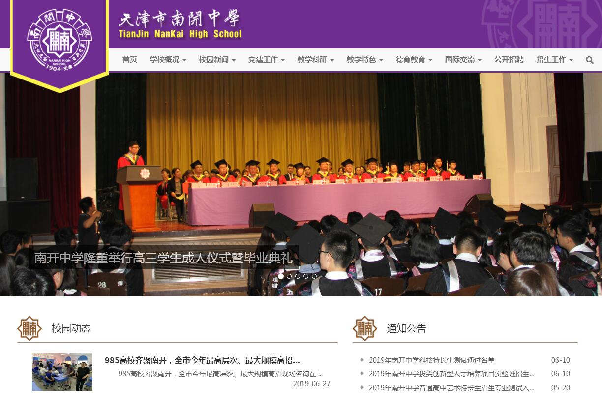 天津市南开中学由著名爱国教育家严修和张伯苓1904年创办。1978年被教育部确定为全国重点中学。1996年被国务院授予国家重点文物保护单位。现为天津市教委直属中学。学校坐落于天津市南开区南开四马路,占地面积115亩,建筑面积60289平方米,绿化面积18000平方米。校园古朴典雅,设施齐全,新老建筑交相辉映,景观独特。截至2016年10月,全校学生3007人。其中高中部52个教学班,2393人;初中12个教学班,488人;国际部7个教学班,外籍学生126人。全校教职工303人。一个多世纪以来,南开人同心同德,艰辛探索,矢志不渝。首任校长张伯苓在任46年。新中国成立后,杨坚白、杨志行等人先后担任校长。2010年,学校实行教育管理体制改革,建立南开中学理事会。目前,孙海麟任南开中学理事长,李轶任党委书记,刘浩任校长。南开中学校训为“允公允能,日新月异”。校歌首句歌词为:“渤海之滨,白河之津,巍巍我南开精神。”校色为青莲紫,寓意南开学子应该像莲藕一样,出淤泥而不染。校徽呈八角形,寓意南开学子来自四面八方。南开中学特别注重对学生进行爱国主义教育。正如何炳棣先生所说,“南开中学是世界近现代史上笃笃实实最爱国的学校。”同时,学校从建校之初就十分注重校风建设,梁启超曾经称赞南开中学“校风之佳,不仅国内周知。即外人来参观者,亦莫不称许”。由校父严修亲自制定并书写的“容止格言”在南开学子心中打上深深的烙印。“春华起南开,秋实献九州。”在南开精神的感召下,南开中学一百多年来桃李广植。培养出以杰出校友周恩来为代表的一大批党和国家的领导者、科学家、教育家、文学家、艺术家,培养出6万余名普通劳动者、合格公民。当今南开中学坚持传承南开精神,高举改革创新大旗,与时俱进。学校有着优良的德育传统,坚持“以周恩来为人生楷模”的教育主线,形成南开特色的德育实施网络。学校打造“三个中心、一个论坛”(即体验创意中心、艺术中心、奥林匹克体育中心、南开公能讲坛),形成独具特色的素质教育平台,开拓学生视野,让学生体验科技前沿和艺术体育魅力,促进综合发展,培养创新潜质,助力学生成才。学校十分重视教学工作,优质教育硕果累累,多名学生曾在国际中学生学科奥林匹克竞赛中摘金夺银,一大批学生在学科竞赛中获得国家级奖项及天津市一等奖。每年均有大批优秀毕业生考取和被保送到牛津、剑桥、加州伯克利、清华、北大等国内外著名高校。重点本科上线率和考取“985”院校人数占高考学生比例一直位居全市领先地位。重视体育也是学校的教育传统。张伯苓作为中国奥运先驱,首倡中国举办奥运会;学校始终坚持“健康第一”的思想,通过举办“五虎杯”篮球赛、“三六杯”足球赛等传统体育活动,形成良好的体育锻炼氛围。校园社团文化活动丰富多彩,为学生提供展现各方面才华的舞台,男子篮球队、话剧社、民乐队、合唱团、舞蹈团、交响乐团等社团具有较高水平,多次在全国和市级比赛中取得佳绩。学校不断增强与世界各国基础教育单位的交流,与英国伊顿公学、唐桥中学、希腊雅典中学、德国博登湖中学、法国巴黎德萨伊中学、加拿大萨迪斯中学、新加坡华侨中学、台北复兴中学等20多个国家和地区的中学建立友好交流关系,成为中外基础教育相互借鉴和交流的桥梁。在天津市委、市政府和学校理事会的正确领导下,当今南开人继续坚持“南开道路”,秉承“南开品格”,弘扬“南开精神”,在高起点上向更高水平迈进,努力创办富有中国特色、具有世界水平、符合时代要求、适合未来人才成长需要、让人民满意的优质中等教育,续写南开教育事业的崭新篇章。