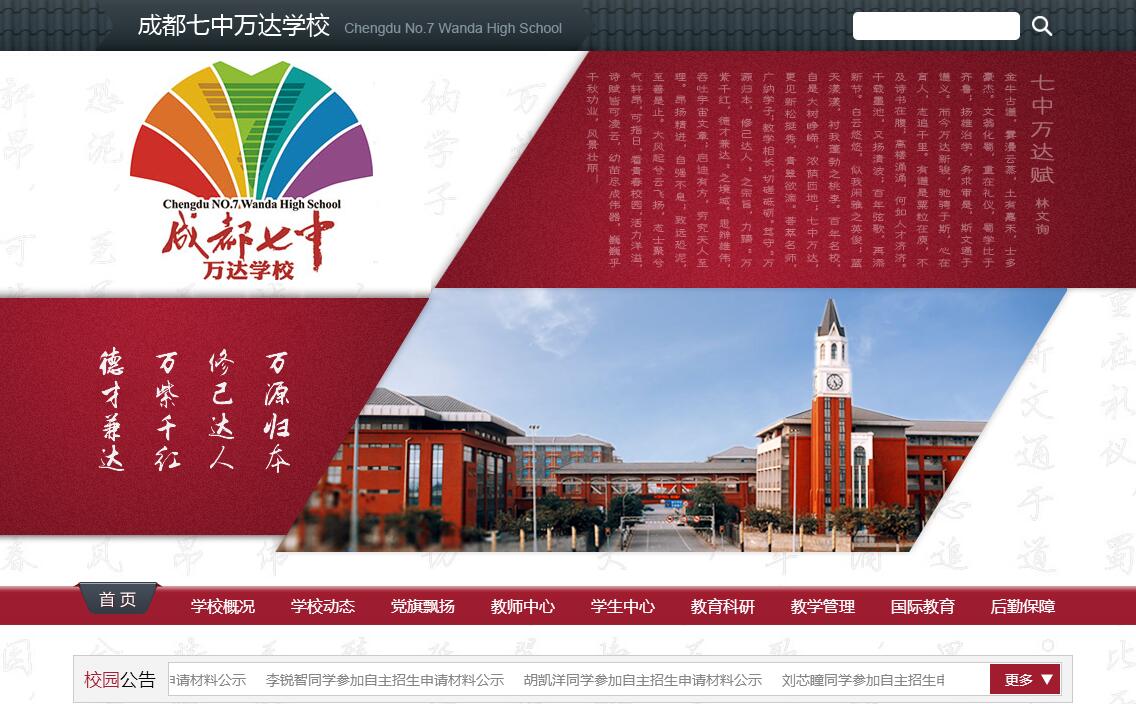 成都七中万达学校是2011年由万达集团与金牛区政府共同出资兴建、金牛区政府举办、成都七中领办的寄宿制公办高完中。学校以“万源归本、修己达人”为办学宗旨,以“万紫千红、德才兼达”为育人理念,以“身心雄健、情感丰满、精神高贵、智慧卓越”为培养目标;着力践行“让每一个生命绽放最精彩的自己”的教育追求;努力办成成都市质量排头兵、创新示范校。2014年成都七中万达学校首届学子参加中高考,成绩优异。高考各项重要指标仅次于“四七九”等老牌名校,位列全市重点中学第五。金牛区理科前十名独揽7席,文科前十名享有4席,区理科状元、榜眼也花落七中万达。多名学子走向国内外著名学府,陈识远同学被北京大学法学院录取。取得我校最高分(650分)的张晓怡同学,入校时中考成绩为成都市4000多名,三年后高考成绩位居四川省262名。首届初三中考重点率为61.3%。学校完美实现“省重第一,追赶前三”的高中教学质量目标和“金牛第一,完中领先”的初中教学质量目标,兑现了“让优秀者更优秀,平凡者不平凡”的郑重承诺。学校现有教职工270余人,其中特级教师3人,教育专家1人,高级教师40人,全国、省、市、区骨干、优秀教师、优秀班主任、学科带头人96人,具有研究生学历的教师60余人。学校通过专家讲座、实战演练、素质拓展等多种形式的培训推动教师队伍整体水平提高,凭借教育研讨会、师徒结对、外出观摩、青年教师技能大赛等多种渠道促进教师专业素养提升,全力打造一支充满爱心、富有激情、协作进取、技艺精湛的教师队伍。建校不到四年,七中万达教师在各级各类比赛中获奖达430余人次,承担区级以上示范课60余节,赛课、论文获全国一等奖13人。学校充分尊重学生的个性发展需求,经过三年的实践探索,形成了国家课程校本化、校本课程特色化、德育活动课程化的独具特色的课程体系。开设60余门选修课,组建近40个学生社团,每周开课、学生全员参与;启动棋艺、国学等校本特色必修课,传承经典、弘扬传统文化;独创“5+15”特色小课堂,欣赏名曲、陶冶性情,收看校园节目、开阔视野;构建德育大课堂,搭起技能学习、体验参观的平台。学校每年春季举办文化艺术节,包括国学诵读、英语剧、课本剧、“七万好声音”、器乐比赛、红歌比赛、书画作品展等活动;每年秋季举办科技体育节,包括田径运动会、科创作品展、啦啦操、科普读物推荐、科普知识竞答等项目;此外不定期举行学科活动、知识讲座,如诗歌朗诵比赛、英语歌曲大赛、寒假作业展、青春期心理健康知识讲座等。活动内容丰富、形式多样、参与面广,为学生提供了展示才艺、提升自我的舞台。学校提出“健康是生命最基本的素质,体育是七中万达第一课程”的理念,创新体育工作:实行体育课程走班制,设置了篮球、排球、乒乓球、羽毛球、啦啦操等选修模块供学生自主选择;注重大课间、体锻实效,实行“四段制”和“三赛一练制”;从2014年秋季入学的新生起实行“体育毕业证”,开展了“三年600公里长跑”活动,引起全国极大反响,专家认可、师生支持、家长赞誉。立德树人是教育的根本。学校组织开展了形式多样的德育活动,让学生的心灵得到感动和启迪,提高精神境界,促进人格健全发展。如定期开展心愿卡存放仪式、植树、新生军训;创办学生业余党校、团校、干部学校;成立志愿者协会,开展关怀老人、食堂服务等行动。学校每周一进行的升旗仪式由班级承担,主题不一,成为一大特色。学校以人为本,在细节之中融入温情,关爱每一位学生,关怀每一位老师,让来自五湖四海的老师、学子在校园中感到如家的温暖。如教师生日时食堂精心准备长寿面和生日蛋糕,托管生元旦晚会中师生一起包饺子、写贺卡,举办教职工迎新晚会、联谊球赛等。学校将以珍惜和敬畏生命的赤子情怀,以尊重生命规律的科学精神,以服务生命发展的无限激情,唤醒生命自觉,激发生命潜能,启迪生命智慧,提升生命品质,努力使每个生命都得到发展,赢得尊重,获得幸福!