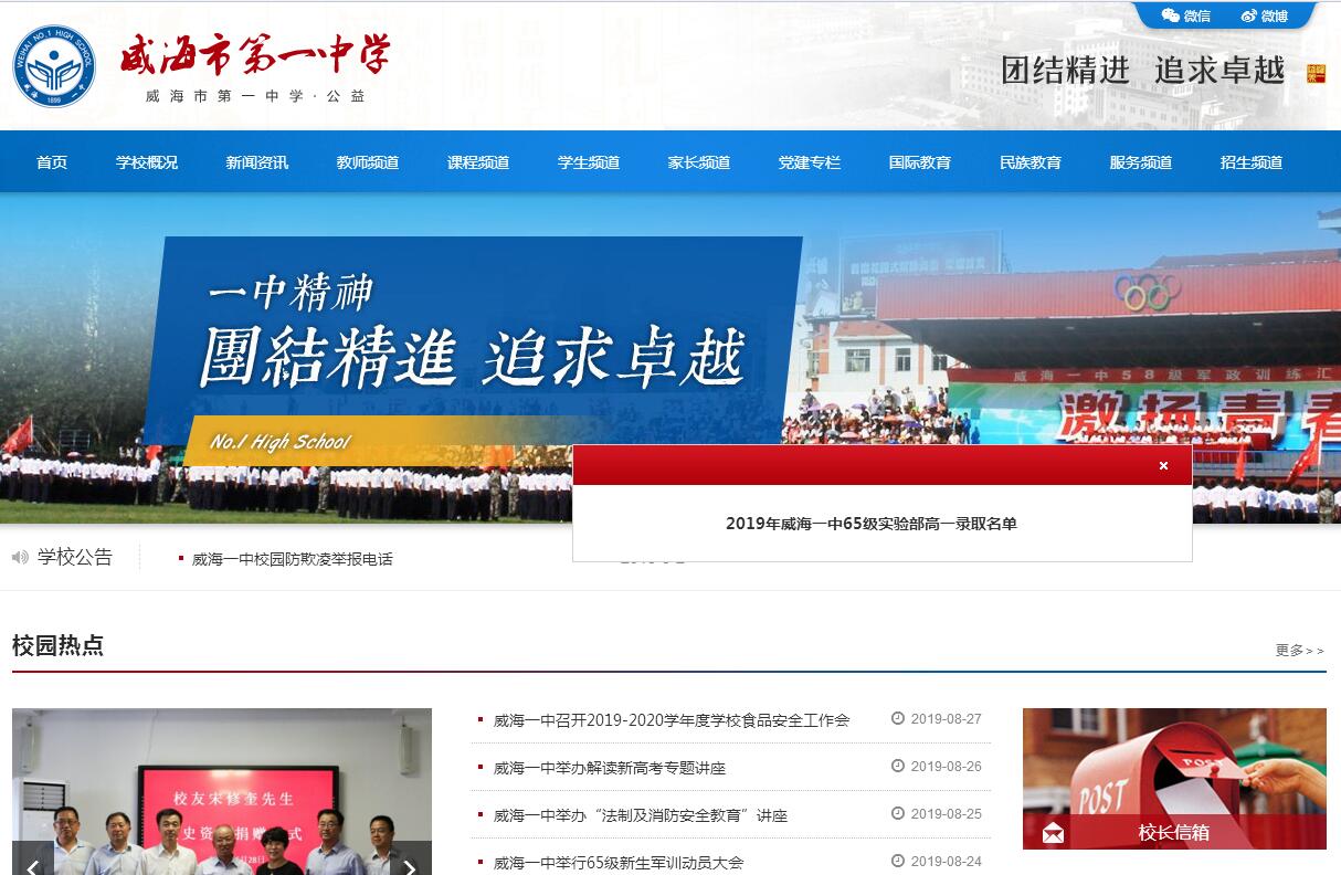威海一中始建于1899年,是一所具有120年办学历史、底蕴丰厚的省级规范化学校。学校位于威海市文化中路75号,占地15万平方米,建筑面积9万多平方米,在校学生3600多人,教学班75个,2005年开始承办内地新疆高中班,2013年开始承办青海海北班。文化氛围浓厚,校园文明和谐。学校建立了以“惟一唯美”为核心,涵盖办学目标、培养目标、校训、班级文化、办公室文化、主题文化、环境文化等系列内容的校园文化体系,潜移默化地影响师生的思想情感与价值追求,师生共同营建了文明有序、积极向上的良好校风。学校整体布局科学合理,校园环境优雅,设施设备先进,文明平安和谐。办学条件先进,师资力量雄厚。学校建有设备先进、功能齐全的各类文体活动场馆和学科教学专业教室,实现了学校管理和教育教学的数字化、信息化、智能化;学校在职教职工423名,获得市级以上荣誉称号的教师171名,特级教师、高级教师占36%,中级以上教师占79%。学校设有教师专项培训经费,定有《教师三年发展规划》,通过“青蓝工程”“名师引领工程”“团队建设工程”以及“高校与高中联合育人工程”等各类教师培训工程,推进教师专业化发展,为教师施展才华、绽放人生光彩提供机会和舞台。管理科学规范,育人个性多元。学校建立了以《章程》为核心的现代学校制度体系,坚持依法治校,实施民主管理,学校政事通达,人心和顺;推行全员育人导师制,保障学生身心健康和谐成长;实行学生自主管理,成立学生社团,使学生各施其能,各展其华,指导学生“做最好的自己”。教育质量一流,办学特色鲜明。面对山东省高考综合改革,学校建立了一体多维的课程体系,启动了FTF(面向未来)科技创新和NTL人文两大课程基地建设,开设“科技教育、心理健康教育、生涯教育”等特色课程,普及实施“研究性学习”课程和社会实践课程,为学生构建开放的学习环境、多元的成才渠道,让核心素养培育落地生根。学校先后荣获“全国教育系统先进集体”“国家级绿色学校”“全国青少年校园足球特色学校”“省教学示范学校”“省级规范化学校”“省级心理健康教育特色学校”等20多项省级以上荣誉称号。