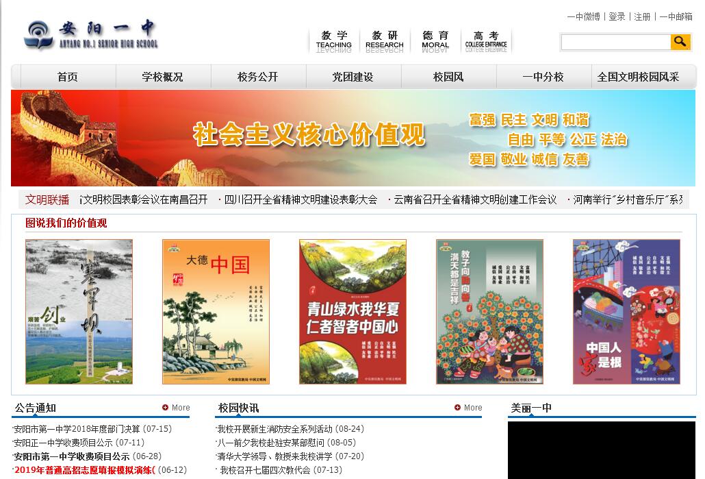 安阳市第一中学于1946年创建于太行革命老区,原名“漳滨中学”,是一所具有光荣革命传统的学校。两度被确定为河南省重点中学,是河南省首批示范性普通高中,首批河南省普通高中多样化发展示范校,首批全国文明校园。安阳一中现有42个教学班,教职工197人,在校学生2400余名。学校占地9.6万平方米,校舍总面积达5.6万平方米,绿化面积为6万平方米,绿化覆盖率60%。建有3000平方米的体育馆;室外体育场2.52万平方米,有400米标准塑胶跑道、人工草坪足球场和室外游泳场,10个羽毛球场,40个乒乓球台。图书馆建筑面积2680平方米,藏书15万余册;学生阅览室配备有400余种报刊杂志,有900个座位。学生餐厅设有25个窗口,可提供150余种菜品,同时容纳2300人就餐,是河南省中小学一级食堂。安阳一中在开齐、开足国家课程的基础上,自主开发了六十余门校本课程,培养学生的创新意识、创新能力,促进学生全面发展。在安阳市分配生比例达70%的情况下,安阳一中大力开展“必修课程选修化”实践,采用分层次、走班式教学,为入学成绩较低、学业有困难的学生提供及时的帮助,有力保障了教育教学质量。近年来,在全体教职工的共同努力下,安阳一中高考成绩不断提升,2013-2018年,共有76人考入北大清华。其中,2018年有19人被清华北大录取,一本上线率达94.62%。在数学、物理、信息学等学科竞赛方面,安阳一中也有长足进步。在第34届全国青少年信息学奥林匹克竞赛(NOI2017)中,安阳一中2015级学生张瀚文荣获金牌,并入选国家集训队,也是河南省2017年唯一的一枚信息学全国奥赛金牌。多年来,安阳一中始终把“办安阳人民群众家门口的好学校,让孩子在父母身边成长”当作不变的追求,自觉坚持市区范围内招生,不到其他地区特别是安阳市管辖的各县招生,不打破生源平衡,自觉维护本地的教育生态,有力促成了安阳市区和各县(市)教育发展基本平衡的良好局面,提振了安阳地区老百姓对本地教育的信心。2013年以来,安阳一中荣获第一届全国文明校园、省级文明单位标兵、河南省教育系统先进集体、河南省多样化办学示范学校、河南省中小学德育工作先进集体、省级平安校园、河南省文明学校、全国中小学心理健康教育特色学校、河南省依法治校示范校、省级卫生先进单位、河南省五四红旗团委、河南省教师发展学校、河南省园林单位、河南省消防安全教育示范学校等称号。2015年3月,安阳一中受到安阳市人民政府通令嘉奖。安阳一中将全面贯彻落实党的十九大精神,落实立德树人根本任务,以培育和践行社会主义核心价值观为根本,不忘初心、砥砺前行,努力办好人民满意的教育。