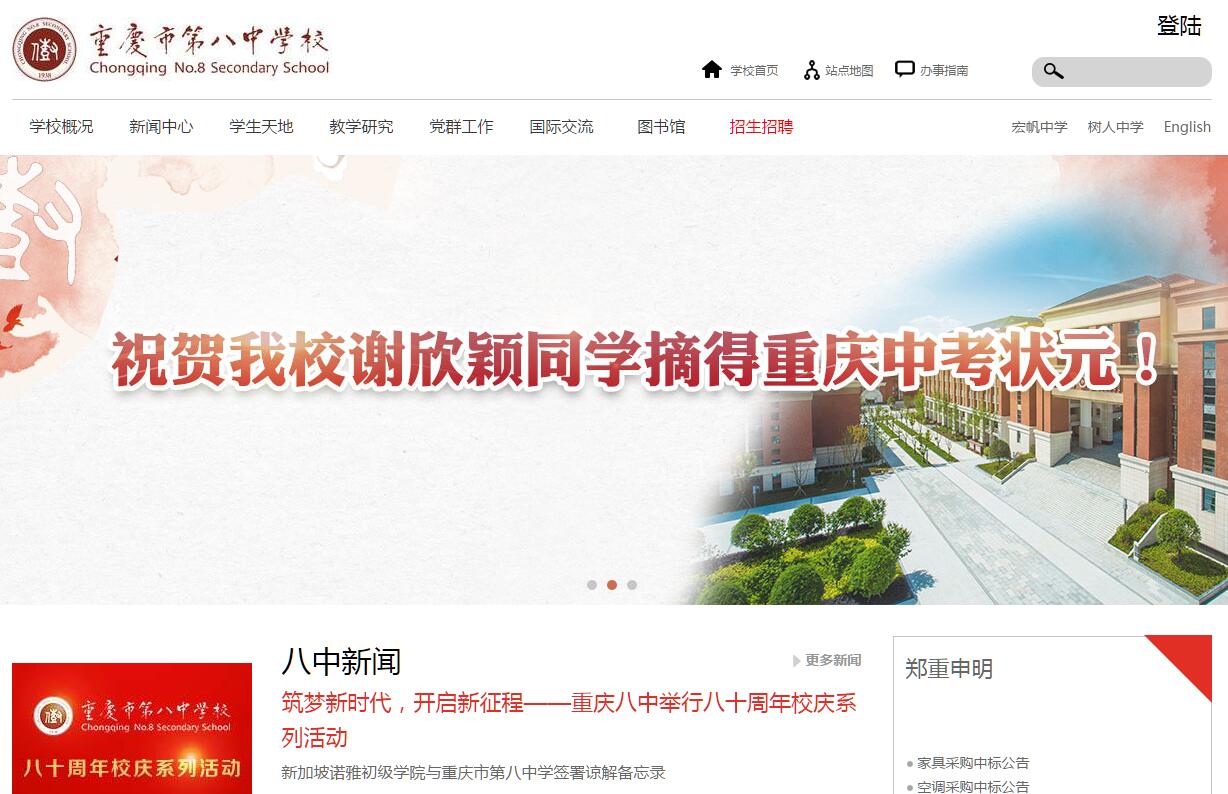 重庆市第八中学校,原名树人中学,创建于1938年, 是重庆市教委直属的首批市级重点示范中学、全国教育系统先进集体、全国十佳科技教育创新学校、全国宋庆龄发明示范基地、全国首批培养体育后备人才试点学校、全国体育卫生先进学校、全国体育传统项目学校、“小平科技创新实验室”创建校、重庆市科技创新培育奖学校、重庆市文明礼仪示范学校、重庆市艺术教育示范学校。学校教师爱生敬业、博学协作、技能过硬。在这支优秀的队伍中,享受国务院政府津贴专家有4人、全国优秀教师、模范教师有9人,正教授级研究员、特级教师有14人。近五年学校教师参与数十个国家级和市级课题,800余篇教师论文获全国、省市级一二等奖;在优质课大赛中获全国一等奖16个,市级一等奖27个,高居全市榜首;2004年在重庆市直属中学优质课比赛中,学校13个学科获得一等奖(共14个学科),重庆舆论为之惊叹,称之为“八中现象”。学校德育工作坚持“人人都是德育工作者”的大德育观,在系列活动的开展中提升学生的思想道德素质,形成了“行动德育,活动育人”的德育特色。学校社团活动多姿多彩、艺术工作独树一帜,成绩卓越。学生组建了话剧社、文学社、书法协会、动漫社等13个社团,开展了丰富多彩的社团活动。近五年,学校艺术活动获国家级金奖、一等奖30余次,获市级金奖、一等奖近30项。学校以弘扬主体意识、创新精神为己任,推行“减负提质”教学改革,构建八中特色课程体系,实施“30+10”高效课堂模式,开设选修课课程,开展专家讲座。初中享有“金牌初中”的美誉,高中连续三年荣获“重庆市高中教学质量特别优秀奖”。高考升学率和重点大学升学率一直名列全市最前茅,近五年被清华北大录取逾百人,数千名学生被全国知名重点大学录取,近百名学生被选送到美国、英国、加拿大、新加坡等留学深造。近五年百余名同学获全国奥林匹克竞赛一等奖,近30名同学进入全国高中奥林匹克竞赛冬令营集训。学校注重学生创新精神与实践能力的培养,创建了科技教育“项目主导型教学模式”。近8年,在省级以上科技大赛中获奖1129个,其中在世界大赛中16人次获金牌、36人次获银牌;在全国大赛中49人次获一等奖,56人次获二等奖;共11名同学获重庆市青少年科技创新市长奖。学校重视学生终身体育意识、良好的体育锻炼习惯的培养,为学生搭建参与体育活动和展示体育才能的宽阔平台。学校开展排球传统项目50余年,为高校和省市、国家队输送400余名排球人才,多次承办全国青少年排球赛,先后五次被评为“全国先进体育传统项目学校”,2009年获中国中学生排球事业“特殊贡献奖”。学校田径自2001年组建以来,获全国冠军4次,亚军3次,市级冠军200余次,35次打破市级记录。学校积极寻求教育国际化,让国际交流服务于教学与学生的素质培养。2009年,学校被国家汉办授予“汉语国际推广基地中学”,常年承办“汉语桥”世界中学生夏令营。2011年,在德国G.E高中设立孔子课堂,两校每年互派高中生开展艺术体育文化等方面的交流,并定期在我校选拨志愿者到德国企业实习。2013年在美国塞马米奇高中的孔子课堂经国家汉办批准成立。学校是首批获准招收国际班学生的项目学校之一,开设AP等国际课程,目前有200余名学生到美国著名高校深造。