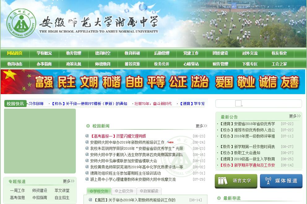 安徽师范大学附属中学是安徽省教育厅唯一直属省示范高中,原安徽省25所重点中学和6所安徽省理科实验班承办学校之一,是安徽省第一所“中国科协青少年科技创新项目实验学校”。学校创建于1903年,前身为育英学堂。学校百年来风雨沧桑,历经沿革,数易其名,几易校址。中间经历萃文书院、安徽省私立萃文中学、安徽省芜湖市第四中学、安徽师范学院附属中学、皖南大学附属中学、安徽省芜湖市第四中学(新四中)、安徽师范大学附属中学等几个办学阶段。1955年被安徽省教育厅评定为第一批省级重点中学,2000年又被安徽省教育厅评定为第一批省级示范高中。学校名流荟萃,桃李芬芳。从这里,走出了革命家、文学家阿英,中国科学院学部委员、院士侯学煜,中国工程院院士宁津生,核科学家赵文彦,著名医学家吴绍青,著名心理学家张侃,原国务院副秘书长、现任中金公司董事长兼董事会主席丁学东,原煤炭工业部副部长濮洪九等。学校大力实施素质教育,积极推进课程改革,贯彻育人为本、德育为先的方针,遵循科学发展、创新发展、和谐发展的思路,坚持“以人为本、多元发展”的理念,秉承“励志、勤学、求是、创新”的校训,确立“做强做精、与时俱进、特色鲜明、追求卓越”的办学目标。高度重视学生创新能力培养,近十年来,共有1400多人次在国际级、国家级、省级的学科竞赛中分获一、二、三等奖。其中杨弋、吴作凡、罗哲正、朱震霆四位同学分别在2007年、2016年、2017年、2018年在国际奥林匹克竞赛中获得国际金牌。彭爽获第17届国际机器人奥林匹克竞赛金牌。高考成绩也是连年节节攀升,2018年高考,唐璇、许雨茜同学分别荣获芜湖市(含四县)文理科第一名,我校文史类一本达线率88.5%,理工类一本达线率94.7%,在安徽省名列前茅,受到江城芜湖人民的好评,圆了芜湖市老百姓“进师大附中,上名牌学校”的梦想。同时附中每年有20多名优秀学子被北大、清华等国内著名高校录取,每年有二十余名高中毕业生进入美国普林斯顿、康奈尔、杜克,英国剑桥,新加坡国立大学和新加坡南洋理工等世界著名大学深造。学校坚持德育为先,在芜湖市率先举办校园艺术节、科技文化节,推行劳动技术教育课和高雅艺术进校园活动等,在全省范围内率先建立心理咨询室——知心屋;学校重视拓宽学生的国际视野,注重培养学生的人文精神、科学素养,学生社团数量众多,各类活动丰富多彩。十多年来,学校通过AFS项目加强国际交流与合作,先后派出了12名学生赴德国、挪威、意大利、捷克、美国留学深造,接待了来自意大利、冰岛、丹麦、巴西、美国、德国、挪威、多米尼加共和国等国家留学生16人来校学习。学校还与美国、澳大利亚、爱尔兰、英国一些学校有密切交往,从而为莘莘学子搭建了与世界互动的广阔舞台……学校目前正在积极实施“双轮驱动,两翼齐飞”发展战略,朝着“省内领先、国内一流、有一定国际影响力的名校”的办学目标砥砺前行。