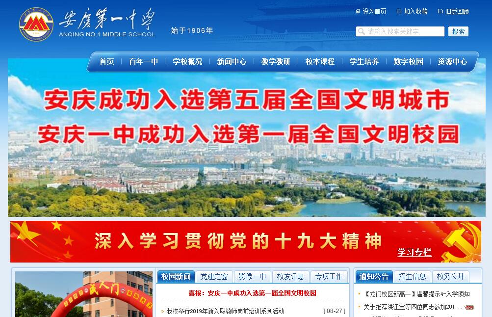 安徽省安庆第一中学,发轫于1906年创办的安徽师范学堂,是联合国教科文组织俱乐部成员、安徽省首批重点中学、安徽省示范高中、安徽省高中理科实验班承办学校。目前,学校共有高中三个年级50个教学班,在校学生2600余人。学校名流荟萃,桃李芬芳。知名教育家姚永概、王星拱、杨亮功、邓以蛰、程演生等先后任校长。著名学者严复、陶行知、胡适等曾为师生讲学。中国共产党早期领导人陈延年、陈乔年,中国工农红军第一军军长、无产阶级革命家、军事家许继慎,中共安徽省委首任书记王步文等曾在我校学习。新中国成立以来,学校毕业生中已有10位获院士称号。学校坚守“诚毅”校训,坚持“高中三年,奠基一生”的办学理念,不断促进学校管理规范化、教师发展专业化、校本课程多样化、学生评价多元化、教育技术现代化、学生发展个性化。教育教学质量省内一流,高考成绩一直居全省前列。新世纪以来,学生三次夺得省理科状元,四次登上省文理榜眼,一本达线率在全省领先。学科竞赛硕果累累,何斯迈、周皓宇分获第29届国际数学、28届国际生物奥林匹克竞赛金牌。国际交流、校本课程、研究性学习、综合实践活动、社团活动丰富多彩。学校多次受到国家、省、市表彰,先后荣获“全国文明单位”“全国文明单位”“全国文明校园”“全国五一劳动奖状”“全国教育实践先进集体”“全国群众体育运动先进单位”“全国绿色学校”“全国语言文字规范化示范校”等称号。目前,安庆一中教育集团一校两区(龙门校区、龙山校区)的格局业已形成,两个校区正秉承优秀教育传统,采用一体化管理模式,协同发展,着力打造“绿色校园、智慧校园、人文校园”,努力创办理念先进、教学先进、管理先进的现代化校园。
