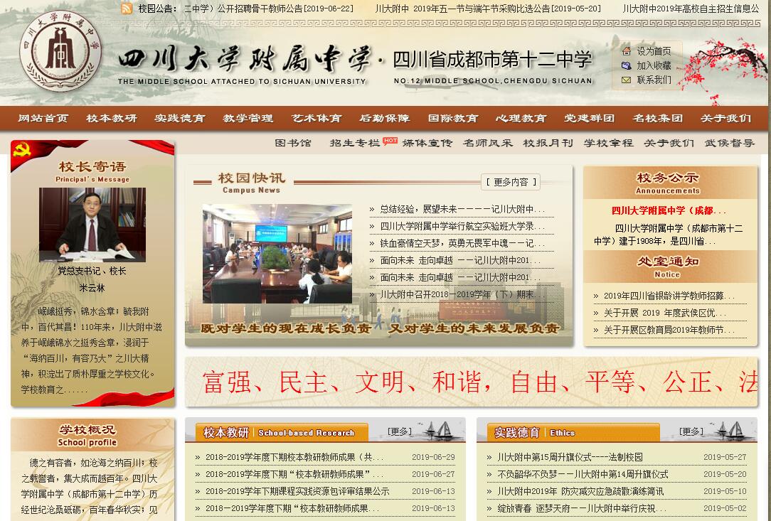 德之有容者,如沧海之纳百川;校之载誉者,集大成而越百年。四川大学附属中学(成都市第十二中学)历经世纪沧桑砥砺,百年春华秋实;见证历史绵延,盛放华彩万千。四川大学附属中学(成都十二中)始建于1908年,为当时的四川省城高等学堂(四川大学前身)附设中学堂。解放后隶属于成都市,1953年命名为成都市第十二中学,后成都市教育局将成都十二中交予四川科分院,改建为“中国科学院四川分院科学技术学校”(简称 “省科技校“) ,后科技校停办,恢复为成都市第十二中学,校址从三瓦窑迁至现在的九眼桥。2003年合并成都二十九中,恢复“四川大学附属中学”校名;2006年学校划拨武侯区直管,于2008年合并成都市五十中。学校坚持始终从四川大学“海纳百川,有容乃大”的博大厚重文化和科分院笃学严谨的科研文化吸取营养,促使“研究”的文化基因在我们附中生根发芽。川大附中人以“有教无类,作育英才”的情怀,以百年育人的心血,在长期办学中积淀形成了“立德树人 笃行两责”的核心理念,形成了“基于全员全程校本教研主流文化,建设‘培养—研究型’现代学校”鲜明办学特色,凝练出“除了奋斗 别无选择”的校风、“潜心研究 仁心育人”的教风和“悉心研习 静心成才”的学风,形成了“全面发展 长于研究”的培养目标和“核心问题的课堂教学、活动体验的实践德育、阳光幸福的心理教育、身心合一的艺术体育、开放多元的国际教育”的五个办学亮点。川大附中人以自己的大爱与担当,为国家和社会培养了大量德智体全面发展的栋梁之材,书写出一部川大附中厚重的“人文滋养,百年树人”历史。“岷峨挺秀,锦水含章。巍巍学府,德沃群芳。”基于学校为社会培育出郭沫若、杨尚昆、王光祈、李劼人、蒙文通等大批人才的历史性贡献,政府和社会给予充分肯定和高度评价,学校是四川省首批办学的重点中学、四川省一级示范性普通高中、空军青少年航空学校、全国中学生英才计划基地校、中央教科院全国骨干校长教师挂职研修基地、中央教科所创新教育实验学校及教改先进实验学校、全国培养体育人才十所示范校、国家级体育传统项目学校、国家奥林匹克教育示范学校、中华百年名校、四川省校风示范校、四川省高中课程改革样本校、四川省校本研修示范校、四川省阳光体育示范校、四川省德育先进学校、四川省心理健康教育实验校、四川省实验教学示范校、成都市拨尖创新人才早期培养基地学校、成都市教师发展基地校等。“全员全程的校本教研”已是得到全校师生深度认同的学校主流文化。多年来学校围绕“核心问题”的教育科研成果显著,硕果累累:继2009年结题的教育部规划课题《基于缄默知识的核心问题教学实践研究》成果获四川省省人民政府第四届教学成果一等奖后,全国教育科学“十二五”规划2011年度教育部重点课题《核心问题教学中的学生深度体验实践研究》再获2013年四川省人民政府第五届普教教学成果一等奖,并荣获2014年全国首届基础教育国家级优秀教学成果二等奖,四川省教育科研资助金项目课题、成都市教育科研课题阶段《促进学生深度体验的核心问题教学评价实践研究》2017年获四川省教科所一等奖。近年来,四川省教育厅和成都市教育局多次在全省、全市推广我们的研究成果。学校课题研究已形成高位发展态势。核心问题的课堂教学有效促进了教师的发展,进而切实提高了教学效率,并且在校外形成辐射引领。百年的厚重积淀,让川大附中深深地吸引了一批批优秀教师在这片热土上辛勤耕耘、无私奉献,挥洒青春与汗水,展示热情与梦想。现在学校高中部(望江校区)在职在岗232位专任教师100%达本科及以上学历,其中博士学位1人,研究生毕业85人,正高级教师2人,高级教师97人。特级教师及各级党政表彰的名优教师191人。近五年来有超过60%的教师承担过市级及以上的专题讲座。近年来,学校切实实施新课改,老师们的教育观念和教学行为进一步得到转变,学校教学质量依然稳步提升。2016年高考,本一率为76.1%;2017年高考,本一率为82.5%;2018年高考,本一率达91.6%,600分以上人数比例超过40%,两名同学被北京大学录取。2018年,首届空军航空班学生毕业,我校培养出空军飞行员17人,出飞率达42.5%,名列全国16所青少年航空学校第四。百年沧桑绵延华彩传薪火,千秋事业砥砺前行谱华章。附中人必定心怀梦想,扎实耕耘,实现革故鼎新、与时俱进、强化优势、高位突破、铸造品牌的附中梦。
