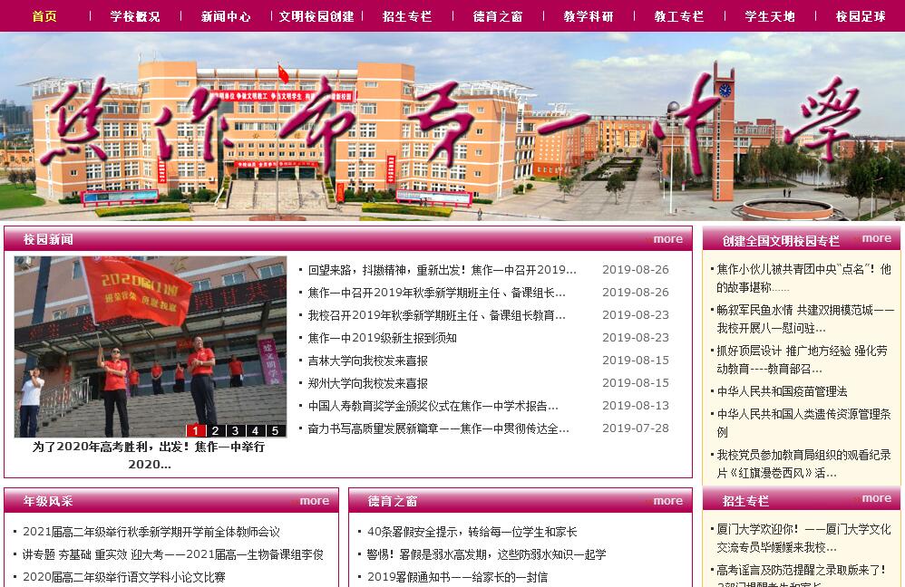 焦作一中原名太行八中,1945年5月创办于山西陵川,同年8月迁至焦作民主路校区,2004年9月迁至焦作市示范区碧莲路1号。风云沧桑,坎坷曲折,杏坛流韵,至于辉煌。1961年被河南省教育厅命名为重点中学。1981年被河南省教育厅确定为首批办好的重点中学之一。2005年被河南省教育厅命名为河南省首批示范性普通高中。自建校到2018年,焦作一中毕业生共计37403人,培养出牛文元、马骧聪、牛济泰、靳尚谊、李超、古兵、刘凯等大批杰出人才,培养出申勇、聂蓓等数十名省市高考状元,培养出刘阳、詹望之等近百名考入清华北大的青年才俊。学校现有教学班78个,在校生近5000人,教职工410人。其中,在编教师334人,特级教师3人,国家级骨干教师4人,省级教育专家7人,省市级名师21人,省高中学科中心教研组成员9人,市高中学科中心教研组成员25人,省级骨干教师50人,市级骨干教师41人,高级职称教师94人,中级职称教师117人。学校占地面积22.5万平方米,建筑面积10.5万平方米,拥有标准化教室84个、实验室18个、微机室3个、报告厅6个、录播教室1个、数学信息化功能室1个;建有天文观测台、图书馆、标准化足球场、标准化环形塑胶跑道、篮排羽毛球场、网球场、游泳场、现代化餐厅、高标准公寓楼等设施。近年来,在市委、市政府的正确领导下,焦作一中紧紧围绕“提高教育质量”主题,奋力拼搏、勇争一流,高考成绩逐年攀升,一本上线人数2013年超过300人,2014年跨越400人,2015年突破500人,2016年一本上线770人,一本上线率达到54.33%,2017年一本上线906人,一本上线率达到63.1%,2018年一本上线1015人,高考成绩再次实现新跨越,再创新辉煌,居全省示范性高中前列。学校先后荣获全国文明单位、全国首批文明校园、全国办学特色先进单位、全国艺术教育先进单位、全国无线电测向重点单位、全国中小学足球传统学校、全国中小学舞蹈教育传统校、省重点中学、省示范性普通高中、省文明标兵学校、省普通高中多样化发展示范校、省新课改样本校、省“一校一品”特色学校等称号。