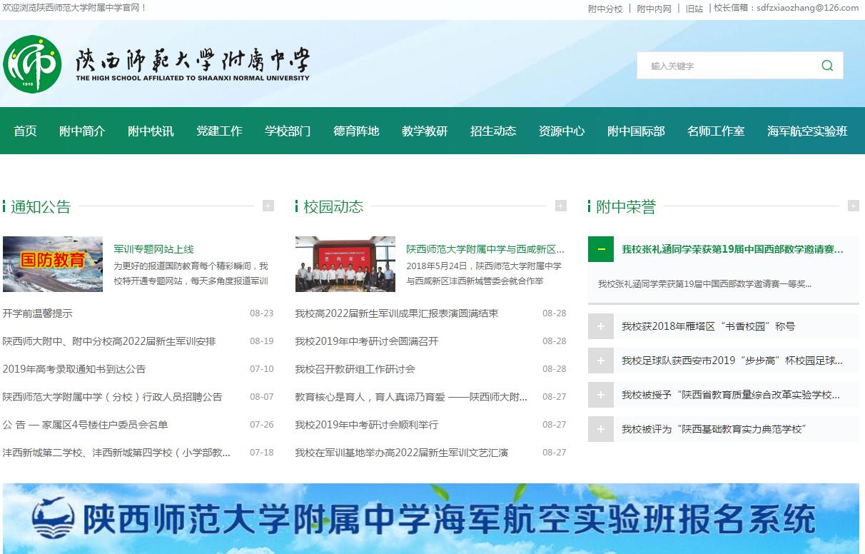 陕西师范大学附属中学始建于1910年,有着百年的办学历史和优良的教育教学传统,人才辈出,桃李天下。中华文化和革命传统的精华铸就了她的风骨,三秦大地的辉煌历史和醇厚民风凝成了她的精神。她的声誉在社会上风行远扬,被誉为“三秦教育之星,万千良才摇篮”。近年来,高考升学率连年攀高,被多所高校授予“生源基地”的美誉,学科竞赛更是枝繁叶茂,硕果累累,在全省名列前茅。近年来,学校获得的荣誉主要有:2008年12月被省教育厅首批命名为陕西省示范高中;2012年3月成为国家教育改革项目学科基地;2012年11月被教育部列为首批信息化试点单位;2014年1月被省委、省政府评为“文明校园”;2014年12月被西安市教育局评为“316工程”先进学校;2016年7月被推举为陕西省校园足球联盟盟主;2017年11月获“西安市雁塔区2017年中小学目标管理考核”一等奖;被西安市评为2017年“全市教育信息化工作先进单位”;被陕西省委、省政府评为陕西省“未成年人思想道德建设先进单位”;被教育部列为“全国中小学心理健康教育特色学校”;由拥有全国近20万精英校长群体的校长会发布的《2017年中国最具影响力中小学百强榜》,附中位于全国中学第47名、西安市第2名。陕西师大附中位于古城南郊,地处曲江新区,紧邻驰名中外的大雁塔,与大唐芙蓉园隔路相望,是人文南郊的基础教育中心。厚重的文化氛围中,紧随着最现代化的浪潮。校园环境优美,绿树成荫。登高远眺,整个校园掩映在一片森森秀林之中,与千年古刹大雁塔所在的慈恩寺和谐统一,成为美丽的曲江新区的一道亮丽风景线。漫步校园,扑面而来的生态人文气息,高处树林阴翳,光影参差;低处绿畦满园,花草竞芳。校园景物整体布局合理、错落有致,先后被陕西省、西安市人民政府授予“园林单位”和“绿色校园”称号。陕西师大附中背靠陕西师范大学,有着得天独厚的师资来源。绝大部分教师由是陕西师范大学各院系严格考察后选留的优秀毕业生构成。教师年龄结构合理,以中青年教师为主体,高、中级职称教师占90%以上,其中高级职称教师超过63%。陕西师大附中始终坚持花大力气培养教师创新能力,提高教师素质,在学校长期的努力下,涌现出了一批在省市有影响的知名教师和学科带头人。学校现有教师217人,其中特级教师9人,博士6人,取得硕士学位152人,国家、省、市级骨干教师30人,学科带头人7人,省、市级教学能手58人,省、市、区名师工作室(坊)19个。2017年附中多名教师在各级各类评选活动中获奖:李涛老师获评“陕西省教学名师”,宋芝君老师获评“省级学科带头人”,李娜、王芳、薛琪3位老师获评“省级教学能手”,江志勇、李红艳老师被评为“雁塔区名师工作室主持人”,董翼等12位老师被评为“西安市教学能手”;杨蓉等5位老师被评为“区级骨干教师或教学能手”;李伟萍等21位老师在各级各类赛教中获得一等奖。学校占地110亩,设施齐全一流,布局有序。校园整体形成了以教学科研为中心的建筑群落,由北向南,依次为运动区、教学区、办公区、学生公寓4大板块。配有设备完善的理、化、生实验室,计算机专用教室,语音专用教室,音乐专用教室,美术专用教室。每个教室都配备了先进的无尘板和多媒体触控一体机教学设备。行政办公室、实验室、图书馆均实现了办公自动化和计算机系统管理。每个教室都实现了冬有暖气夏有空调的目标,配有柜式饮水机,教室全部装配了网络化多媒体教学系统,实现了网络化、信息化教学。学校校园网建设更是走在全国前列,为学生提供了更为广阔的学习空间。学生阅览室每年订有350种杂志和110种报纸,每天中午和下午为学生免费开放,供学生借阅,并配有专职老师组织管理。图书馆近几年新购图书10万多册,实现了电子查询、借阅系统管理。学生公寓宽敞明亮,均装有空调、电话。校园有标准的400米环形跑道,宽阔的足球、篮球、排球、羽毛球和乒乓球场地。校园绿化面积超过80%,处处绿树成荫,青翠依依,校园里一草一木、一砖一瓦都包含着文化元素,处处凸显环境育人的理念。陕西师大附中长期的办学实践中,思考教育、追求真理,最终确立了 “以人为本,愉悦学习,张扬个性,鼓励成才”的 “为学生可持续发展奠基”办学理念。在这一理念的指引下,着重培养学生的“三种能力”,即自学能力、自主能力、创新能力;张扬学生个性,为学生创设愉悦的学习氛围;注重学生良好习惯的养成与可持续发展能力的培养;关注学生的身心健康,创设人文情怀的环境,不仅为学生开设了有利于个性发展的、内容丰富的选修课程,还配备了具有专业资质的心理咨询老师,呵护学生心理的健康,助他们安全、健康地成长,给学生个性发挥创设广阔的平台。2010年“春笋计划”实施以来,附中投资50万元建设了供学生自主生物探究性实验的专门实验室,这一项目的设立在我国西部地区中学尚属首例。参加“春笋计划”的学生在思维建构、科学研究、论文写作等方面都有了明显地提升,先后有十多名学员获得优秀学员称号,十余个课题获得优秀课题,六位教师获得优秀指导教师称号,学校多次获得 “春笋计划”优秀生物基地学校称号。到目前为止,附中“春笋学员”共发表科学研究论文16篇,其中SCI源期刊10篇。校园文化建设是德育建设和素质教育的重要阵地之一。陕西师大附中的校园文化建设
