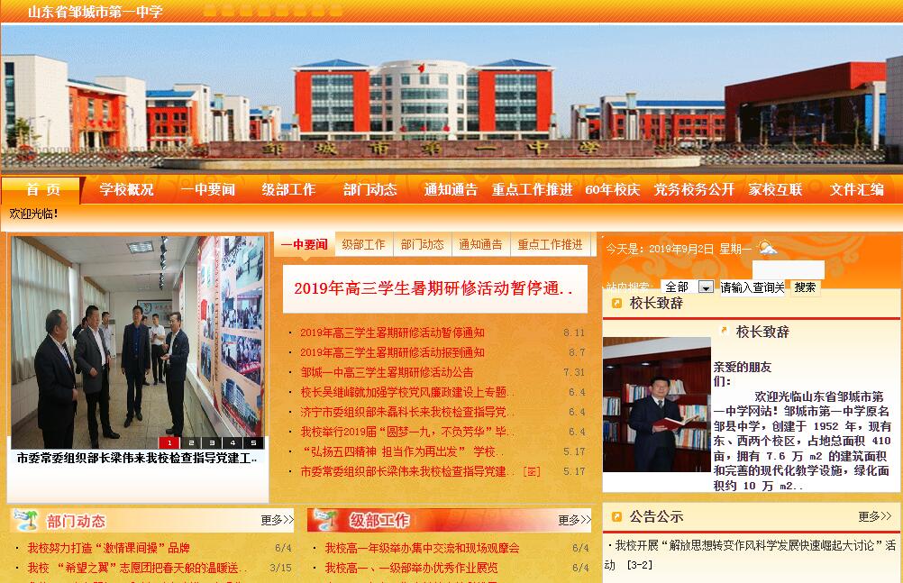 邹城一中始建于1952年10月,原名邹县中学,历经三迁,2001年,新校区迁至现新址—邹城市东城新区太平东路1868号。学校现分为南北两个校区,占地总面积410亩,拥有7.6万平方米的建筑面积和完善的现代化教学设施,绿化面积约10万平方米。现有123个教学班,在校学生6456名。建校59年来,学校拥有国家级、省市级模范教师、优秀教师、特级教师、拔尖人才36人;高、中级教师238人,中青年专家、杏坛名师、“十佳”教师、市级以上骨干教师、学科带头人、教学能手69人。一代代名师弘文励教,培养了三万多名合格毕业生,数以万计的优秀学子成为国家栋梁,近几年教育质量不断跨越增长,成为济宁市教育教学工作先进学校和优秀生培养、艺体生培养先进学校。静谧优雅的校园环境,精美独特的建筑设计,现代一流的教育教学装备,人文科学的学校管理,为邹城一中全面实施素质教育,创建全国家知名高中奠定了基础。学校以素质教育为主线,抓住新课程改革机遇,依据多元智能理论,大力推进实施素质教育;以教师专业发展为主抓手,深入开展“新理念、新课程、新技术”教师培训,建设具有特色的教师文化,想方设法提供平台促进教师专业发展,培养一批学者型、创新型名师;先后投入巨资,加强教育技术装备建设,专任教师每人一台笔记本电脑,装备了5口数字化实验室和120多口多媒体教室,建成了多网合一的现代校园网,实现了学校教学、管理、办公等信息交流网络化管理、多媒体教学班班通目标。以课堂改革为突破口,注重发挥学生的主体作用,实行“自主学习、合作探究”的教学模式,实现课堂三维目标。加强学校文化建设,注重发挥孔孟故里思想文化教育的优势,在实践中积淀特色文化;依据当今世界文化碰撞、优秀文化相融相通的趋势,建设民主科学的校园文化,塑造具有传统美德、现代文明习惯、“博爱、博学、博雅、博才”的学生和“有思想、有专长”施教有方的教师。针对严峻的竞争与挑战,学校以民主管理为动力,实施“质量立校、科研强校、特色兴校”的发展战略, “单项工作争第一,总体工作创一流”,坚持依法治校,以德治校,规范管理,人本管理,把学校事业发展和师生充分全面发展结合起来,构建以人为本的校本管理模式,实现“教师、学生、学校三者一体提升,全面和谐持续发展”的管理目标,促进学校发展提速增效,铸就了“天下为己任,规矩成方圆”的校训、“崇尚科学、追求卓越”的校风。伴随着推进实施素质教育,邹城一中站在历史的新起点,全校团结实干,科学发展,努力把邹城一中建设成为和谐一中、民主一中、阳光一中、生态一中、法制一中、严谨一中、高雅一中、爱心一中、高效一中、专家一中、卓越一中、幸福一中,全社会人民满意的一中。学校作为山东省规范化学校,是全国高级中学校长委员会会员学校、山东大学优秀人才输送基地、第19届全国物理奥赛金牌学校,先后获山东省文明单位、山东省教书育人先进单位、山东省德育工作先进集体、山东省田径传统项目学校、山东省绿色学校、山东省依法治校示范校、山东省校务公开民主管理先进单位、山东省食品卫生A级单位、山东省教学示范学校等殊荣,并与国内外友好学校建立了广泛的联系和交流。