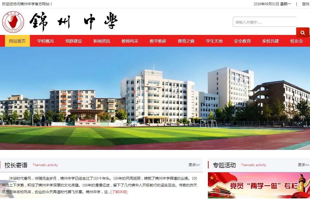 锦州中学坐落于锦州市之东,历史悠久,享有盛誉,始建于1913年,至今已有百余年历史。1948年10月辽沈战役胜利后人民政府接管了学校,正式命名为锦州中学。1960年被辽宁省确定为重点中学,1980年被确定为省首批办好的重点中学。1996年被评为辽宁省首批模范学校。2002年12月接受了辽宁省首批示范性高中专家评估组的评估检查,学校正式步入辽宁省首批示范高中的行列。锦州中学现有60个教学班、2700余名学生,260余名教职工。锦州中学新校区占地159亩,依据功能分区情况为:教学区(东)、运动区(中)、生活区(西)。校内各种办学设施设备基本完善,有教学楼两栋,文体活动中心楼一栋,宿舍楼五栋,学生餐厅一栋,体育馆一个。学校工作的根本任务是教书育人,而一支修养全面、业务过硬、敢于创新的教师队伍是立校之本,决定着学校教育教学工作的品位。因此,该校特别注重培养一支师德高尚、业务精湛、观念超前、科研先导、现代教育技术强的高素质教师队伍。百年来,学校绛帐高设、弦歌不绝、人才济济、星光灿烂;中科院院士、中国地质大学校长赵鹏大和原南开大学校长母国光、中国工程院院士、中科院冶金研究所所长柯伟等从这里起步;清华、北大、哈佛、耶鲁等名校的博士,各行各业的优秀人物从这里腾飞;建国后培养出40000多毕业生从这里奔向四面八方。风华百年,积淀悠远而厚重的文化底蕴,使之以优秀的师资,规范的管理和优异的质量享誉省内外。被誉为英才的摇篮、名师的沃土、科研的基地、辽西辐射的中心。学校在全校师声生共同努力下,形成了“以人为本,以法治校,科研兴校,文化建校”的办学理念;提出了“追求卓越,崇尚一流”的办学口号;“优化教学过程,提高课堂效率”的教学特色更加突出;学校曾获得“省文明单位”、“省模范学校”称号,也曾在国家、省、市各项活动中多次获得表彰。学校以优异的师资、规范的管理和优异的质量确立了自己的社会地位。形成了突出德育、重视智育、发展体育、培养能力、鼓励实践、全面育人的办学特色。提出了“办人民满意的学校”的办学理念。确立了“为培养具有创业精神、创新意识、创造能力、组织才能和合作能力、实践能力的高素质人才打下基础;为重点大学输送尽可能多的基础知识宽厚、思想活跃人格健全可持续发展的具有爱国精神和国际竞争与合作意识的优秀学生;争取在未来中国的一些处于制高点的领域都有锦中毕业的学生”的培养目的。