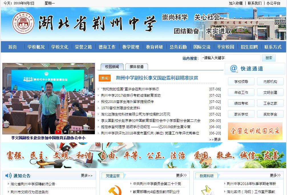湖北省荆州中学是全国文明校园、湖北省第一批重点中学,是省级示范高中。学校地处全国历史文化名城荆州,远望长江,近倚城墙,古杏参天,香樟蔽道,校园内东有贡院状元桥,西有马融绛帐台,校园环境幽雅,文化底蕴深厚。学校历史可追溯到2000多年前,东汉时期的马融绛帐台,其近代教育始于1903年(清光绪二十九年)创办的荆州府中学堂,之后历经了省立第九高级中学、省立第八高级中学、湖北省立江陵中学、湖北省荆州中学等阶段,1953年被确定为湖北省七所重点中学之一。湖北省荆州中学是湖北省基础教育窗口学校、是湖北省新课程改革的样本校,是北京大学、清华大学等60多所“双一流”大学的优质生源基地。荆州中学坚持“科学教育与人文教育并重”的教育理念,同时学校逐步完善校长负责制、党委领导下的民主监督制和教代会民主决策制的“三制”管理模式,逐步走上了师生和谐、特色鲜明、成果显著的良性发展道路,并形成了“自主创新专业化,多元培养个性化”的独有办学特色。2005年1月,学校成为湖北省首家通过ISO9000质量管理体系的基础教育学校。荆州中学是湖北省的百年老校、百年名校,拥有一流的师资、一流的学生和一流的管理。学校现有60个教学班,在校学生3558人。全校专任教师223人,其中在岗特级教师4人,全国优秀教师4人,国培计划培训专家7人,全国优质课获奖教师9人,湖北省优秀教师41人,湖北省优质课获奖教师138人次,荆州市拔尖人才6人,荆州市青年岗位能手8人次,荆州市明星教师、骨干教师100多人次。雄厚的师资队伍和现代化的教学设施为创建一流名校提供了可靠保证。悠久的办学历史、深厚的文化底蕴、先进的教育理念,科学的管理机制,优良的办学条件,使荆州中学的办学质量不断提高,社会影响日益增强。1978年以来,学校四次夺得全省高考文理科状元;考入北大、清华、中科大等三大校共计561人;学科竞赛获得省赛区全国一等奖以上178人次(其中国际金牌一枚、银牌两枚、铜牌一枚;亚洲金牌一枚);至2015年,荆州中学共为国家培养了4万余名各类人才,毕业生遍布海内外。涌现出国家科协副主席中科院院士张启发,工程院院士官春云、熊远著,前北京大学方正技术学院副院长、现“长江学者”阳振坤,国家“973”计划计算机存储系统研究项目首席科学家冯丹,世界著名植物分类学专家文军,我国第一个古生物学博士彭善池,著名经济学家张风波,著名医学专家宋善俊、洪光祥,身残志坚、勤奋成才的书法家、作家李超洪、世界名模游天翼等一批批栋梁之材和杰出校友。近些年荆州中学的办学质量不断提高,社会影响日益增强。国家教育部、国家公安部、国家体育总局、国家科协、国家绿化委员会、中国教师发展基金会先后表彰学校为“全国中学贯彻《学校体育工作条例》优秀学校”“全国消防安全教育示范学校”“推行《国家体育锻炼标准实施办法》先进单位”“全国绿化模范单位”“全国后勤管理先进单位”“国家教师科研先进单位”。湖北省委、省人民政府连续三次授予学校“湖北省最佳文明单位”光荣称号。湖北省综治委两次授予学校“安全文明校园”光荣称号。湖北省教育厅授予学校“校园管理先进单位”“绿化先进学校”“园林式学校”“湖北省学校体育工作先进单位”“湖北省绿色学校”“绿色文明校园”“中华优秀文化艺术传承学校”等光荣称号。共青团湖北省委授予学校团委“五四红旗团委”“五四红旗团支部”等光荣称号,省学联授予学校学生会“湖北省优秀学生会组织”光荣称号。荆州市委、荆州市人民政府授予学校“荆州市文明单位”称号,荆州市委授予学校党委“事业单位党组织十面红旗”光荣称号,荆州市人民政府授予学校“花园式单位”“绿色学校”光荣称号,荆州市教育局授予学校“先进基层党组织”“荆州市廉政文化示范学校”“荆州市中小学师德建设先进学校”等荣誉称号。
