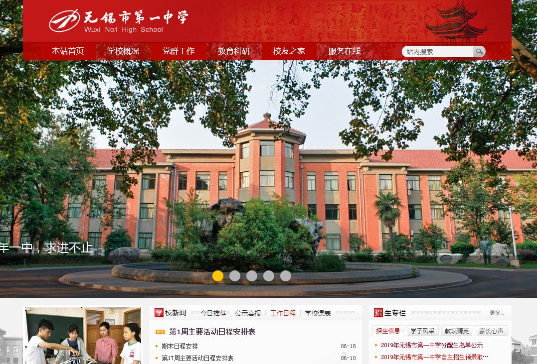 无锡市第一中学创建于清宣统三年(1911年),前身为无锡县立初等工业学堂,陶守恒为首任校长。随后百年间,学校历经坎坷,几度变迁:1925年,学校从初等工业学堂发展为商业学校,添办中学部;1927年,学校又从商业学校发展为普通中学,更名为无锡县立初级中学;解放后,学校正式定名为无锡市中学、无锡市第一中学,并于1953年被确定为江苏省首批重点中学、1998年被评为首批国标省级示范性普通高中、2004年转评为江苏省首批四星级普通高中。2007年,无锡市第一中学被英国剑桥大学正式确认为该校在中国地区的遴选中心之一,并被国家汉语推广办公室确定为江苏省六所国家级“汉语国际推广基地学校”之一。2011年,学校又获得了IBO国际组织的认可,成为国内为数不多的IB学校之一。百年沧桑,薪火相传。百年的办学实践孕育出了以“求进”为核心的一中精神。一百多年来,“求进”精神深深根植于这片土地之上,融入到每一个一中人的血脉之中:著名物理学家、中科院院士、原全国政协副主席钱伟长;著名法学家、原全国政协副主席罗豪才;全国人大常委会副委员长华建敏、蒋树声,我国“两弹一星”元勋姚桐斌,中科院院士钱临照、杨国桢,工程院院士张涤生、侯芙生、季国标、陈新、顾真安,国际著名美术大师、美国国家艺术院终身院士程及……一代又一代一中桃李,穿越历史的风雨,带着荣光与骄傲,走出一中,走向世界。他们践行的,是“博学、深思、笃行”的学风;他们弘扬的,是“读书、明理、求进”的校风;他们为一中学子树立的,是一个又一个“独立、协作、创造”的成功典范。学校被誉为“素质教育典范,优秀人才摇篮”。春风化雨,润物无声,传承着百年光荣传统,一中人将“为学生的终身发展奠基”作为教育理念,通过构建多元课程,打造高效课堂,以“轻负担高质量”的办学特色为导向,不断追求卓越,力争使每个学生、每位教师都能自由、全面地发展,从而收获成功、感受幸福。一中人用青春的风采,执着的追求,拼搏的精神,收获的喜悦,铸就着无锡一中今天的辉煌。百年一中,“求进”不止。