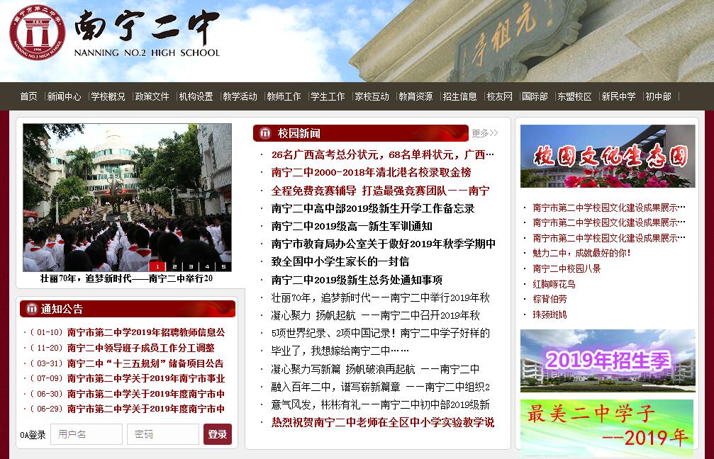 南宁市第二中学是南宁市教育局直属完全中学,中国百强中学,广西自治区首批重点中学,自治区首批示范性普通高中。前身为创办于1906年的南宁府中学堂,曾先后更名为广西省立第一中学、南宁中学、南宁高中等。1954年改现名。南宁二中现有两个校区:占地68亩的新民校区(初中部),占地453亩的凤岭校区(高中部)。现有99个教学班,共有学生5663人。校园环境优美,硬件设施一流。在百年的办学历程中,南宁二中形成“以人的发展为本,师生员工与学校共同发展”的办学理念,确定了“办知名学校,造福一方;创优质教育,回报社会”的办学宗旨,以“启牖智慧,活泼身心”为校训,为国家输送了数以万计的优秀毕业生。学校教育科研教学改革成绩斐然,先后获“全国师德建设先进单位”、“全国心理辅导特色学校”、“全国教育系统先进集体”、“全国民族团结进步模范单位”、“全国群众体育工作先进单位”等荣誉称号。自恢复高考以来,我校培养了25位广西高考总分状元,50位广西高考单科第一名。我校是广西录取北大清华人数最多的中学。我校连续15年蝉联南宁市高考最高奖项——高中毕业班工作卓越奖,是南宁市唯一一所自从设奖以来所有年度均获奖的中学。我校学子在各学科奥林匹克竞赛中成绩喜人,在“中国学科竞赛500强高中颁奖盛典”中,我校荣获了“全国最具影响力奖”、“全国最佳学校奖”、“全国卓越贡献奖”和 “全国最佳校长奖”。黄天明、赖柯吉同学成为至今广西中学生在国际学科奥赛中仅有的两位金牌获奖者。钟海宁、刘见灼、刘彦琳同学实现了广西中学生在物理、化学、生物该学科全国赛中一等奖零的突破。2014、2015年,2013级唐珑珂以优异成绩荣获第30届和第31届CMO(中国数学奥林匹克)一等奖,是广西选手在中国数学奥林匹克中获得的最高奖项。学校教职工共402人,其中教师360人,教授1人 ,正高级教师4人,高级教师123人,在职特级教师20人(不含聘用人员),特级教师人数居广西中学首位。累计有享受国务院特殊津贴专家4人,八桂名师2人,广西优秀专家4人,南宁市专业技术拔尖人才14人,南宁市优秀青年专业技术人才18人,南宁市新世纪学术和技术带头人19人,南宁市教坛明星11人,学科带头人77人,教学骨干211人。南宁市“21世纪园丁工程”(B类)导师团导师16人,国家级中小学骨干教师培养对象5人,广西A类培养对象27人,是现代化、生态化、数字化的国内一流、区内知名的示范性中学。