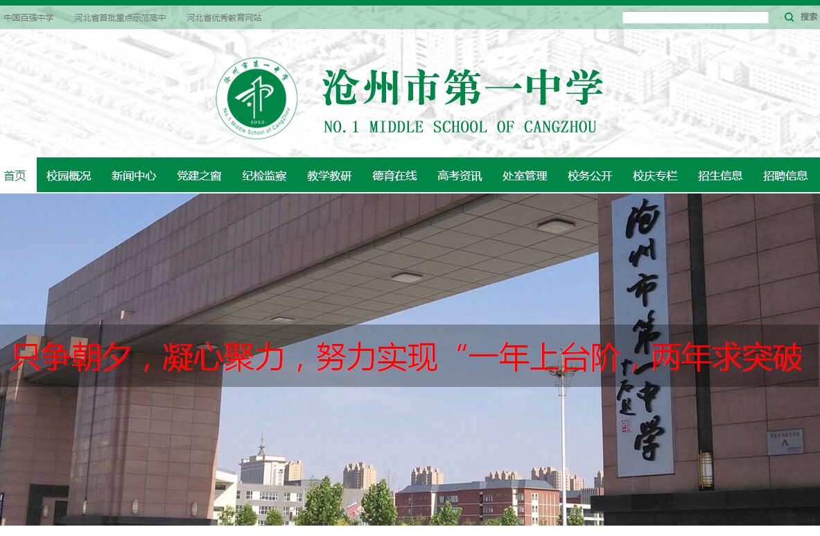 沧州一中始建于1913年。河北省首批重点示范高中,沧州市窗口学校。2014年8月,学校顺利实现整体搬迁,其新址位于狮城公园以南、河北工专以北、迎宾大道以西黄金地段,占地450亩、建筑面积18.1万平方米。新沧州一中建筑设计理念超前,是全市乃至全省最有特色的学校之一,是沧州市高级中学中设施配备最完善的一流学校,也是河北省范围内教育教学设施最完备的一流学校之一。学校办学规模逐步达到48轨、在校生7200人,学校实行全封闭、全寄宿、小班制管理新模式。力争通过三年的努力,把沧州一中打造成更具内涵、更具特色、更具竞争力的河北名校。1926年9月,学校建立了津南地区第一个中共党支部,因其光荣的革命传统,曾被誉为“津南革命策源地”。一百年来,我校培养出革命志士、专家学者及各个领域的劳动英才5万余人。培养出周恩来总理办公室副主任、国务院副秘书长许明(女),石化部长孙敬文,河南省委第一书记、二机部长刘杰,卫生部长高强,河北省政协主席赵金铎,河北省委纪检书记吴野渡,著名考古学家吴振禄,著名亚洲铁饼冠军李晓惠,著名现代画家贾又福等一大批杰出人才。学校紧紧围绕“质量一中、特色一中、活力一中、和谐一中、人文一中”的办学目标,进一步强化“高质量高素质并举,为学生一生幸福奠基”的办学理念。学校首创“校长负责制”“年级部主任负责制”“备课组长负责制”“班主任负责制”四制管理模式。学校以环境优美、设施完善、师资雄厚、管理规范、治学严谨、质量领先而享誉狮城内外、渤海之滨。学校全面推行分层次教学和动态化管理模式,努力做到“低进高出,高进优出”,让优秀的学生更出色,让一般的学生更优秀。珍珠班、实验班、普通班等各层次学生可以通过努力,升入上一层次的班级,动态化管理为学生搭建了平等竞争平台。2014年高考再创新高。本一、本二上线率雄居全市榜首。有5人达到北大、清华预录取线。本一上线1069人,本二以上上线1756人, 600分以上581人。应届生本一率64.8%。珍珠班本一率100%,实验班本一率81.2%。刘缘同学以636分成绩荣获沧州市文科状元。沧州一中先后获得了中国百强中学、中国百年名校、全国课改名校等160多项省级及以上荣誉称号。学校先后成为天津大学、中南大学等40多所名牌大学的优秀生源基地;包括北京大学在内的4所重点大学将一中确定为首批“中学校长实名推荐制”学校。学校被确定为首批河北省渤海渔村韩宝菊剪纸艺术培训基地。新殿堂散发着新气息,新百年积聚着新动力。新校区搬迁,使沧州一中摆脱规模限制阻碍,跨入飞速发展的“高铁时代”。在此大好形势下,沧州一中顺势而为,脚踏实地,苦干巧干,谱写学校可持续发展的新篇章。