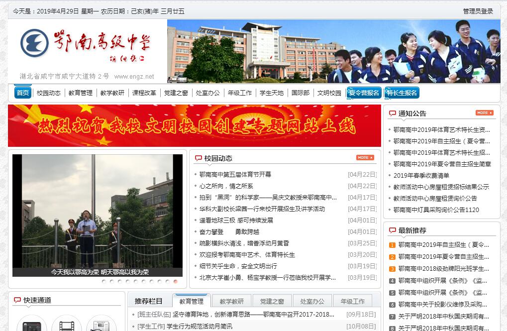 鄂南高中创办于1984年,是湖北省首批省级重点高中,湖北八校联考成员,原址位于咸宁市温泉笔架山路。2001年,经省人民政府教育督导室督导评估,成为省级示范高中。2002年,为满足广大人民群众对优质高中教育的需要,市委、市政府作出了在咸宁大道东段异地建设新鄂高的重大决策。经过一年筹备,一年建设,2004年6月新校园落成,新校园占地面积420亩,建筑面积9.5万平方米,实现了“规划高起点,设计高品位,建设高质量,环境创一流”的建设目标。教学区、生活区、运动区独立分置,布局合理,各区功能齐备,实用、够用、美观、安全。同年9月,新高一在新校园开学,2007年9月学校实现了整体搬迁。2009年12月,鄂南高中以较高评价通过省级示范高中复评。新校园占地面积369亩,建设面积9.8万平方米,校园布局合理,环境优美。至2013学年,学校有62个教学班,在籍学生4000余人;教职工242人;专职教师215人;特级教师13人(含退休),高级教师89人,一级教师51人。2008至2013年,鄂南高中教师参加优质课竞赛获全国奖5人,省一等奖28人,省二等奖39人,市一等奖67人;在省级以上刊物发表科研论文1000余篇。几年来,鄂高人以科学发展观为指导,不断提升办学理念,努力加强队伍建设,积极推进课程改革,不断提高教育质量,使学校获得了长足的发展。2001年,学校确立了“以主体性教育理念为导向,以培养学生自我教育能力和自主学习能力为重点,全面实施素质教育”的办学思想。面对社会发展的新形势,学校逐步认识到,学生的自我教育能力和自主学习能力已经不能完全适应未来社会对人的素质内涵的要求,严格地说,“重点培养学生的自我教育能力和自主学习能力”,它还只是我校培育人才的育人模式,并不能成为学校办学的灵魂,于是从2003年起,学校召开各个层次的座谈会,研讨学校的“主体性”育人模式和校训,研讨引领学校发展的办学理念。2007年,学校借民主评议的东风,大力查找学校自身存在的问题,认真钻研学校的办学方略,以评促教,以评促改,以评促建。2008年,学校认真深入学习科学发展观,充分认识到:科学发展观的第一要义是发展,核心是以人为本,学校坚持科学发展观,就是要以学生为本,构建和谐教育,建设荆楚一流名校。学校在科学发展观深入人心的基础上,确立了“一切为了学生的发展”的新的办学理念。新的办学理念,立足于学生在校的全面发展、充分发展,把学生看作学校生存之本,更关注学生未来的可持续发展,为学生的终身发展注入不竭动力。从而促使每一位学生全面、充分、终身发展和允许有差别发展,努力将学生培养为站在时代前沿的一代新人。一切为了学生的发展,这不仅是对学校传统的主体性教育理念的继承,也是新时期教育改革的召唤。坚持“一切为了学生的发展”的办学理念,践行全面构建“一体两翼”教育模式的办学特色,秉承“厚德博学 自主自强”的校训,实现“争创享誉荆楚、全国知名的国家级示范高中”的办学目标,共同构成了我校的办学思想——贯彻方针,规范办学,五育并举,德育为先。近几年,学校在这一办学思想的引领下,各方面的工作取得明显的成效,学校充满了生机和活力。办学思想、办学理念的确立,清晰了我们学校的办学思路,它似磐石,奠定了学校的办学之基,让学校的发展有着强大的后劲;它又似旗帜,似灯塔,引领着学校在创建国家级示范高中的征途上稳步航进。“全国五四红旗团委”“全国贯彻学校体育工作条例先进单位”“全国群众体育先进单位”“全国地理教学先进集体”“全国校园环境文化艺术建设先进集体”“全国学校营养工作先进单位”“湖北省文明单位”“湖北省青年思想政府工作先进”。“湖北省五四红旗团委标兵”“湖北省社会实践活动合格学校”“湖北省安全文明先进单位”“湖北省园林式学校”“湖北省校园管理先进单位”“湖北省体育先进单位”“湖北省规范化考点”“湖北省绿化合格学校”“湖北省城市园林式单位”“咸宁市先进基层党组织”“咸宁市最佳文明单位”“咸宁市思想政治工作十面红旗”“咸宁市计划生育先进单位”“咸宁市教学先进单位”“咸宁市平安校园”。《人民日报》《中国教育报》和中央电视台等多家媒体曾先后对学校办学进行了专题报道。改革开放以来,鄂南高中全面贯彻教育方针,形成了“以主体性教育理念为导向,以培养学生的自我教育能力和自主学习能力为重点,全面推进素质教育”的办学特色,积极探索“以德治校、科研兴校、民主管理”方式。学校办学成果显著,建校至今,每年高考升学率在90%以上,2000多名毕业生进入重点大学深造,数百名学子跨入了清华、北大、科技大等名校及留学海外,为国家培养和输送了大批高素质的人才。学校先后被评为“全国校园环境文化艺术建设先进单位”“全国部门造林绿化400佳单位”“湖北省文明单位”“省级示范学校”“省校园管理先进单位”“湖北省五四红旗团委标兵”“省安全文明先进单位”“省园林式学校”“省规范化考点”“省体育先进单位”。走进新的世纪,鄂南人肩负着“培育鄂南英才,造就华夏栋梁”的神圣使命,正朝着“建设荆楚一流名校,争创全国示范学校”的目标奋进!