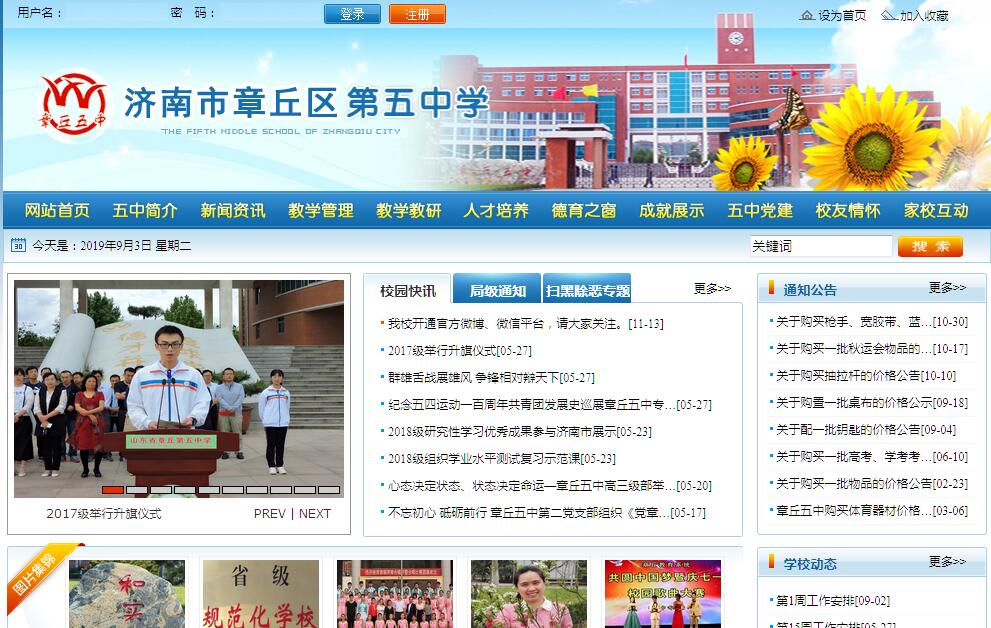 山东章丘地处齐鲁腹地,南依泰山,北临黄河,龙山文化从这里发祥,清照文化在这里绵延。章丘五中位于章丘区政府驻地中心地带,学校始建于1979年,于2001年由清华大学建筑学院设计扩建,目前学校占地348亩,建筑面积70083平方米,绿化面积99171平方米,学校按照现代化、园林化、学院化总体布局,是山东省最早的规范化学校之一。现有教学班72个,在校生近4000人。多年来,学校牢固树立科学发展观,胸怀“办人民满意教育”的教育理想,全面落实《国家中长期教育改革和发展规划纲要》。坚持“以师生发展为本”的办学理念,始终把“立德树人”作为学校教育的根本任务,全面推进素质教育。坚持“差异化教学 个性化指导 多元化发展”的教育方略,不断解放思想、改革创新、激活体制,走内涵提升、谋发展之路,逐步形成了“眼中有学生 心中有目标 胸中有策略”的提升教育教学质量的有效措施。坚持“领袖气质 团队精神 健康成长 和谐发展”的育人目标,通过实施教育科研带动战略,不断发展和完善学校的课程体系,为学生“全面加特长发展”提供了丰富的资源和广阔的舞台,极大地提升了办学质量和社会效益。多年来,学校始终坚持走“科研兴校”的发展之路,积极地进行实践探索。学校在教研教改的道路上,立足教学实践,坚持行动研究,从最初的布鲁姆的目标教学,到诱思探究教学论的研究,以及到科学价值取向的有效教学的研究,先后经历了初学理论的“目标教学”——浅层实践的“诱思探究”——理性反思的“有效教学”——创新发展的“高效教学”——个性指导的“差异教学”五个阶段。随着学校教学改革的不断深入,总结积累了大量的教学经验,形成了具有五中特色的教学系统,实现了教学方式和学生学习方式的转变与创新,极大地提升了学校教育教学质量。学校的教育教学改革在一定范围内产生了较大影响,15年、16年在学校分别召开了济南市教科研现场会、山东省第一届教师专业发展研讨会、全国科学取向教学论研讨会。2017年是新高考改革年,面对新的高考改革方案,形成分类考试、综合评价、多元录取的考试招生模式。在此情况下,学校提出“差异教学,多元发展”的育人理念,并以此为指导开展系列多元化、差异化、特色化的教学改革。这是我们在新形势下制定的新的教研发展方向。 在“和实立校 科研兴校 特色强校”的大旗下,我校高考一批本科上线连续十年实现了高速增长。2018年高考,我校取得了优异的成绩。我校李世铭同学和沈元钟同学分别以665分和663分的高分名列章丘前十,有70多名同学被211”“985”名校录取,自主招生线、艺体生、本科过线总人数位居区高中学校第二,名列前茅,与本届学生高一入学基础相比,高考成绩有了大幅度的提升。师生归属感、幸福感与日俱增,学校知名度、美誉度与时俱进。“梧桐树繁茂,引得凤凰来”,随着学校不断向知名高校输送人才的增多,近几年,许多“985”、“211”重点高校主动向五中学子伸出橄榄枝,我校被多所国家一流大学授予 “优秀生源基地”称号。我校的校本教研工作已初具特色,济南市及山东省教科院先后在我校举办了教科研工作现场会,中国教育报、山东教育等报刊杂志对我校进行了宣传报道,四川、云南、湖北、河南等外地部分学校曾多次派教师来我校学习。学校先后获得了全国教科研先进单位、全国教科研示范基地、山东省绿色学校、山东省电化教育示范校、山东省心理健康教育示范校、山东省教育科研重点实验基地、山东省教育家成长重点培养基地等多项殊荣。不甘平庸的五中人将会继续探索先进的教育教学管理规律,发扬传承好五中的“和实”文化,坚持“超越客观、超越过去、超越自己”的超越精神,抓住机遇,迎接挑战,努力把五中打造为济南教育的特色品牌。