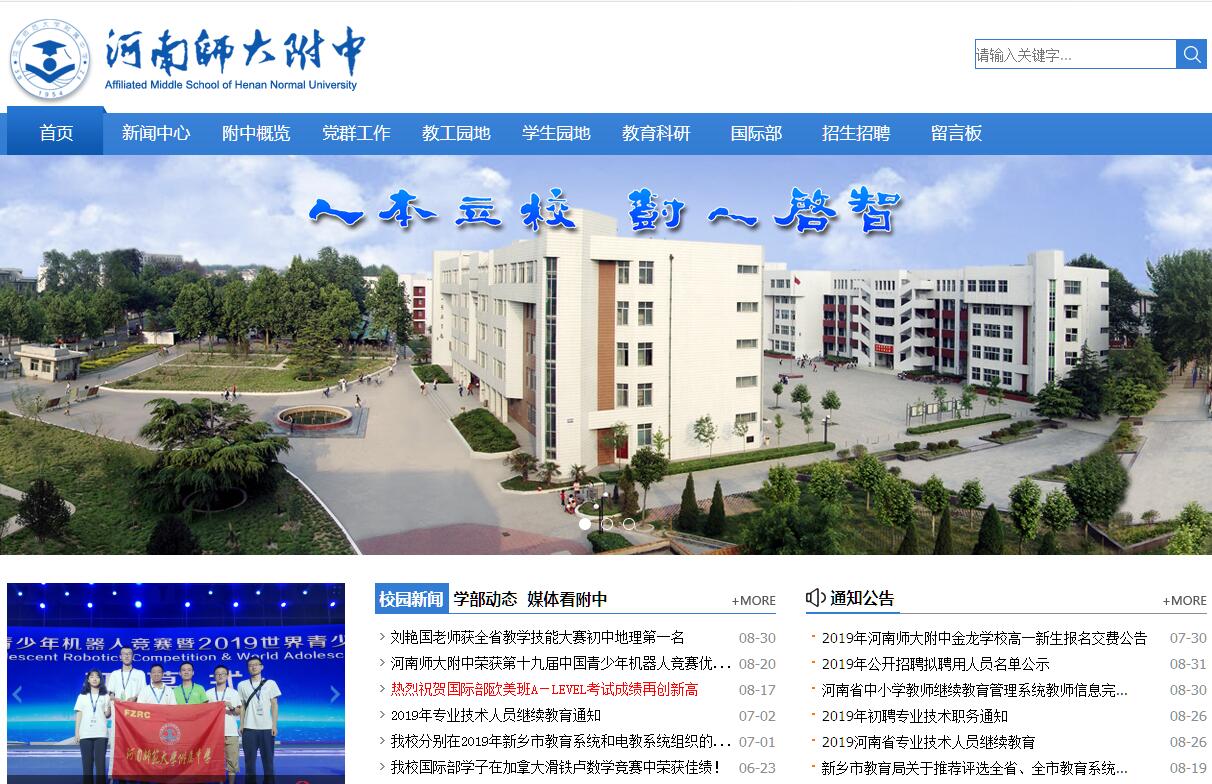 河南师范大学附属中学创建于1954年,是河南省教育厅直属的具有实验性和示范性的省重点中学、河南省窗口学校,是河南师范大学的教育实验和教育实习基地、中国教育学会实验学校、中央党校中共青少年党史教育活动基地。学校拥有一校四区的办学规模,除本部外,受托管理河南师大附中金龙学校、河南师大附中双语国际学校、河南师大附中实验学校。本部及金龙学校占地总面积18.7万平方米,建筑面积达11万平方米。建有26幢建筑及18处景观区,素有“花园式学校”美称。校园布局合理,功能区分明确,育人环境优美,学术氛围浓郁。现有教学班160多个,其中包括面向全省招生的高中实验班、宏志班、国际班12个,在校生8000多人。师资力量雄厚,拥有一支师德高尚、业务精湛、结构合理、富有创新意识和实践能力、热爱教育事业的教职工队伍,在校教职工468人,其中享受国务院特殊津贴专家、国家级骨干教师、中原名师、河南省名师、“百千万工程”人才等名师60多人,中小学正高级教师3人,高级教师110人,外教14人。在六十余年的办学实践中,河南师大附中逐步形成了自己深厚的文化底蕴、优良的办学传统、鲜明的办学特色。特别是近年来,以“人本立校,树人启智”为办学理念,以“校名·人福”为办学愿景,严格规范办学行为,积极实施素质教育,着力推进、实施“一主两翼全攻略”教育教学改革,全面提高教育教学质量,取得了骄人的办学业绩。学校的高考、中考成绩一直位居省、市同类学校前列,学科竞赛和科技、文化、体育等学科课外活动成绩显著。1990年以来,向北京大学、清华大学等全国著名重点高校推荐保送生400多人;信息学、数学、物理、生物等学科竞赛共1000多人次获得国家和省级以上奖励,370多人次获省级一等奖,50多人进入国家集训队,9人获得全国冬令营金牌。建校以来,共为国家培养了近4万名优秀毕业生,其中包括1980届高中毕业生、美籍华人科学家、美国科学院院士、中国科学院院士王晓东等一大批精英人才。骄人的办学业绩也赢得了各界的肯定与褒奖,六十年余间,学校先后受到国家级、省级表彰总计百余项次。1958年被首批列入河南省重点中学,1960年被评为全国文教系统先进集体,1978年重新被确定为省重点中学;2004年在河南省首批省级示范性普通高中评估认定中,名列全省第一名;2005年被评中华全国总工会为全国模范职工之家,2007年被评为河南省首批素质教育示范学校;2009年被人社部、教育部评为“全国教育系统先进集体”、教育时报首届“河南教育名片”学校,2010年荣获河南人民满意的十佳中学并再次名列第一,2011年获全国文明单位、中国素质教育先进示范校、中国最佳素质教育学校,2012年被评为全国五四红旗团委、中国最具影响力的百佳中学、河南省十大素质教育实践基地。2013年荣获河南省“五一劳动奖状”、被评为第十九届全国青少年爱国主义读书育人特色学校、被省教育厅确定为“河南省教师发展学校”。近三年来,学校获得的主要荣誉有: 2014年被省教育厅评为河南省普通高中多样化发展试点学校、河南省综合实践活动课程样本学校、河南省校本教研先进单位、河南省首批中小学心理健康教育示范学校,被中国计算机学会授予“全国信息学奥林匹克竞赛特色学校”称号,第十四届中国青少年机器人竞赛优秀学校,被河南报业集团评为全省基础教育最具影响力十大教育品牌,金龙学校被省公安厅、省教育厅授予“河南省消防安全教育示范学校”称号;2015年被教育部确定为全国青少年校园足球特色学校、首批全国中小学心理健康教育特色学校,被河南省教育厅评为全省首批普通高中生涯教育试点学校,被省高工委、省教育厅评为省文明标兵学校,被省教育厅、公安厅、综治办评为省级平安校园,被省爱卫会确定为省级卫生先进单位。2005、2007、2009、2011、2013、2015年连续六届入选 “中国百强中学”。2016年被河南报业集团、河南素质教育研究会评为河南最具影响力十佳典范学校。目前,在“2016—2020五年行动计划纲要”指导下,学校坚持“人本立校,树人启智”,落实立德树人的根本任务,重点围绕五大发展战略(四轮驱动战略、机制创新战略、文化兴校战略、质量强效战略、合力推进战略),落实八大重点工程(德育创新工程、教育科研工程、学科建设工程、魅力课堂工程、名师攀升工程、培优拔尖工程、艺体教育工程、智慧校园工程)。培养学生核心素养,促进全体学生全面发展,全校上下正以提高教育质量为主题,以综合创新为抓手,着力于“内涵发展、特色培育、品牌增值”,进一步完善管理体制,深化教学改革,狠抓师资队伍建设和校本教研,重视资优生培养;进一步提升集团化、多元化、国际化、信息化建设水平,不断提升学校整体教育实力,奋进在持续建设“中原强校、中国名校”的征程上。