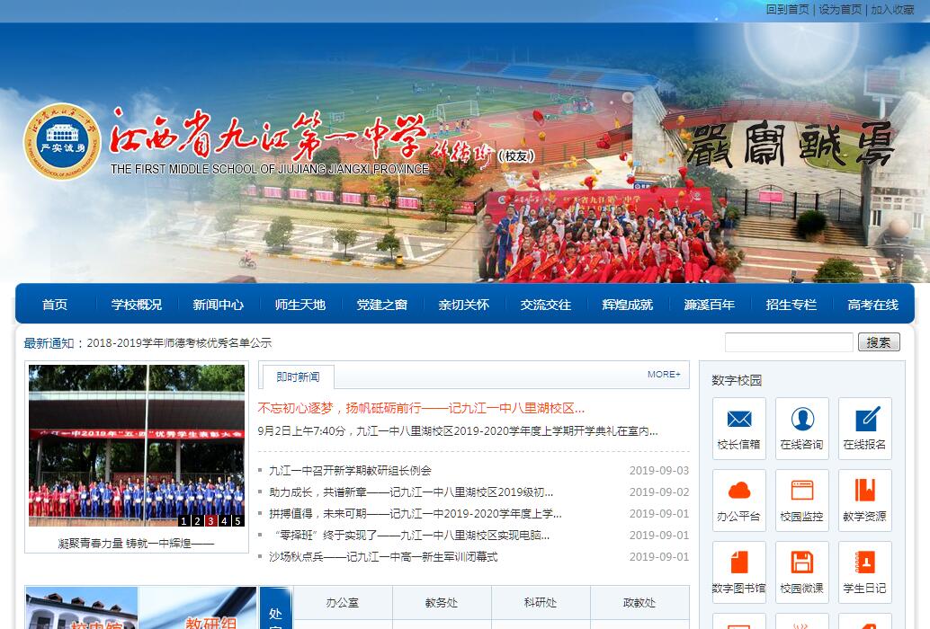 江西省九江第一中学(简称“九江一中”)享有“千载学府、百年名校”美誉,前身为宋明理学奠基人周敦颐所创办的濂溪书院,间接历史近千年;正式立校于1902年,直接历史114年。2011年九江一中八里湖校区落成并投入使用,九江一中跨入了“一校两区”时代。学校现有学生8000多人,教职工近500人,其中特级教师11人。一百多年来,学校共培养了6万多名学生,1990年以来,九江一中高考成绩一直保持在全省最前列。2013年,九江一中首次获得北京大学和清华大学校长实名推荐权;2014年奥赛成绩全省第一;2015年高考刷新九江教育纪录;2016年高考取得历史性辉煌胜利,录取北京大学、清华大学、香港大学和香港中文大学21人。九江一中的课程改革成效显著并成为省级样本学校。2010年原江西省副省长孙刚同志对九江一中课改工作作出批示:“九江一中课改思路很好,符合实际,成效显著,值得借鉴。”2013年,江西省委常委、省委秘书长(时任江西省副省长)朱虹同志调研九江一中课程改革情况。在“严实诚勇”的校训和“尊重民主、崇尚科学、善处平庸、追求卓越”治校办学精神指引下,九江一中坚持“一主两翼”办学战略,深入推进“管育学三三制”整体改革,形成了民主、和谐、诚信、进取的校风,敬业、爱生、求实、创新的教风,诚朴、勤奋、自主、上进的学风和勤勉、高效、廉洁、优质的政风,治校办学水平连续迈上新台阶。九江一中先后被评为江西省首批重点中学、江西省首批优秀重点中学和九江市唯一的示范性重点高中,是北京大学、清华大学等60余所全国著名重点大学的优质生源基地,先后获得了全国教育系统先进集体、全国百强中学、中国十大最具影响力金牌中学、全国“五四红旗团委”、全国中小学德育工作先进集体、全国课程改革实验先进学校、全国中小学心理健康教育特色学校、全国节约型公共机构示范单位、首届江西十大人民满意学校、江西省首批示范性普通中学和江西省文明单位等称号。