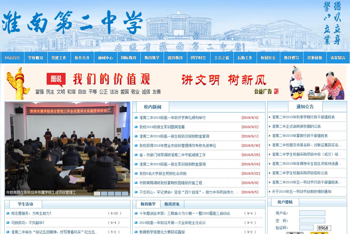 安徽省淮南第二中学是我市建校最早的中学,创办于1946年秋,前身为淮南矿路员工子弟学校, 1956年定名为淮南第二中学,1959年由省政府确定为首批省重点中学,1979年被省教委评定为首批办好的重点中学,2000年被评定为安徽省示范高中。学校为“联合国教科文组织俱乐部成员单位”,近几年来先后荣获全国群众体育工作先进单位、全国后勤管理工作先进单位、安徽省先进基层党组织、安徽省文明单位、安徽省工会工作先进集体、安徽省第一批节约型公共机构示范单位、安徽省体育专项特色学校、安徽省(篮球)体育传统项目学校、安徽省绿色学校、安徽省园林式单位等荣誉称号。教师队伍群星汇集,学校现有正高级教师3人,特级教师10人,省教坛新星7人,高级教师142人,省市级学科带头人40余人。建校以来,已培养5万多名优秀学子,如原陕西省省长程安东、原中国人民武装警察部队副司令员陈传阔等知名校友,还有一大批科学家、教育家和艺术家。学校坚持“育人为本,质量为重,文化为魂”的办学理念,坚持“德以立身,学以立业”的校训,积极推进新课程改革,教育教学质量稳步提升。涌现出淮南市十佳市民祝世伟,宋庆龄奖学金获得者谢倩,全省高考文理科状元王琼慧、桂程、黄群等一批优秀学子。在市委市政府大力支持下。淮南二中新校园于2012年9月建成并投入使用。新校园占地面积360亩,总建筑面积16万多平方米.新校园器宇恢宏,分区合理,环境优雅,配套齐全,设施一流,被有关专家誉为校园规划建设的典范。未来三年,淮南二中将坚持“规划引领、文化立校”的发展思路,确立“育人为本,质量为重,文化为魂”的办学理念,坚持“德以立身,学以立业”的校训,把“平民本色,精英素养”作为育人理念和办学特色,培养学生文雅、教师儒雅、学校高雅的气质,培养学生成为具有传统美德和现代公民意识的优秀人才,以教育场、教学场、文化场建设为重点,把学校建成“省内领先,国内知名”的省级示范高中。