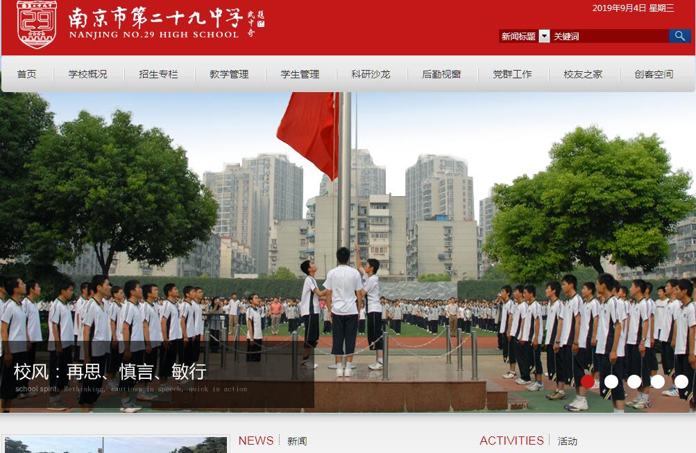用儒学文化与现代理念打造学校精神:“不辞寸土、海纳百川的精神;藐视困难、风雨前行的精神;内力驱动、自强不息的精神;敢为人先、创新发展的精神;志存高远、勇争第一的精神”。此外,“以生为本”是我们的办学宗旨。我们坚持“一切为了学生,为了一切学生,为了学生的一切”的宗旨,为学生的终身发展奠基。着力培养具有学校特质的“三气”:“心气、勇气、灵气”。心气,就是要志存高远,自尊自爱,独立不迁,追求卓越;勇气,就是要不畏困难,直面人生,敢于担当,勇于进取;灵气,就是要善于思考,博学敏行,识时应变,善于创新。六、一所彰显学生个性,不拘一格育人才,具有鲜明特色的学校。学校重视学生个性发展,认真贯彻全面发展的教育方针,积极整合校内外课程资源,全力为学生成长搭建舞台,在体育、艺术、文学、科技教育、儒学教育等方面都形成了鲜明的办学特色,使得我校形成了万紫千红的办学局面。1、体育:夺冠折桂。学校代表江苏省参加全国奥运知识竞赛,一举夺冠。校武术队在全国中运会上屡屡折桂。学校为体育界输送优质人才。校友惠若琪入选国家女排并荣任多届队长,校友吴豪川入选国家高尔夫球队,成为高尔夫国际明星。2、艺术:奇葩竞放。学校民乐团、艺术团在各级各类竞赛中先后获得全国青少年艺术成果展竹笛一等奖、全国少儿艺术大赛江苏赛区舞蹈一等奖,全国扬琴比赛一等奖等殊荣。校影像工作室制作的《城市CITY》等节目先后三次蝉联全国金奖。3、文学:激扬青春。学校文学教育全国知名,颜欢同学高考作文满分轰动语文教育界。近两年全国各类中学生作文大赛中,学校有200多名学生获奖,眭以宁获得江苏省作文大赛特等奖被南京大学提前录取;学生文章每年有数百篇在各种刊物上发表,谭丰雪成为江苏省青少年作家协会首批会员。2014年,我校参加首届全国中学生朗诵大赛,荣获高中组一等奖。2014年,在江苏省诗歌大赛中,全省有30万人参加,仅7个一等奖,我校便占得一席。4、科技:异彩纷呈。近两年,学校共有500余人次获省级以上大奖。学校机器人创作小组荣获国际机器人创作奥赛中国赛区一等奖。3名学生获全国青少年科技创新奖,晋京受到国家领导人接见。5名同学的创新发明分别获得国家专利。5、儒学教育:一枝独秀。作为省内独树一帜的“江苏省高中儒学经典课程基地”,学校致力于弘扬以儒学文化为核心精神的传统文化价值观,留住中国文化之根。建成了儒学经典课程体验中心(全国中学唯一一家),得到了国家、省市有关领导的高度评价。体验中心先后接待国内外3000人次参观访问,《江苏教育报》在2014年12月用整版篇幅对我校儒学基地建设进行介绍和推广。七、一所活力四射,堪称生活乐园、精神家园的诗意校园。学校布局精巧别致,教学、生活、休闲区域各自独立,相得益彰。教学区拥有一流的硬件设备,数字化实验室、录播教室、网络教育平台、远程监控中心、计算机房、图书馆等现代化教学设施配套齐全,让数字校园、书香校园的魅力尽显无余。生活区生活设施配置齐备,宿舍、食堂全部按照高标准进行改造,食堂达到南京市A级标准,宿舍全部采用智能化管理,淋浴、空调、自修教室、活动室一应俱全,标准的运动场可以让师生尽情挥洒汗水。校园环境因地制宜,精心独具,极富文化气息。学校建有“行知园”、“仁义园”、“仁智园”、“诚信园”、“赏心亭”等主题景点,亭台长廊,假山池沼,花木葱茏,四季常青,近百种名贵花木遍布其中,无不散发出浓郁的人文气息。学校继承和发扬儒家的诗教传统,鼓励师生做“诗意的栖居者”:用诗歌滋润心灵,用诗歌抒写情性,用诗的眼光看世界,用诗的色彩描绘人生。学校因诗教成绩卓著,被评为江苏省经典诵读示范基地。此外,各种体育和社团活动也为学生提供了广阔的张扬个性,展示自我的舞台:阳光体育大课间活动、体育艺术节以及形式多样的社团活动。八、一所既有群众口碑,又有上级奖杯,好评如潮的学校。学校的校史馆,陈列着从国家到省市的各类奖杯、证书,它们记载着各级领导对学校办学业绩的褒奖。建校至今,学校的发展始终得到各级领导的关心,国家、省市领导人多次莅临学校视察,南京军区司令员向守志等老一辈无产阶级革命家亲自担任学校校外辅导员。“欲穷千里目,更上一层楼。”学校教育教学质量和办学层次的提升得到了学生、家长和社会的一致好评。在2014年举行的行风评议大会上,学校获得了高达98.9%的满意率。“海为龙世界,云是鹤家乡”。七秩春秋,二十九中一路风雨,一路辉煌,将众多第一和唯一写在了自己的旗帜之上。我们相信,二十九中人是一只排云而上的仙鹤,也是一条腾云入海的蛟龙!在未来的岁月中,二十九中人将凌苍天,乘风浪,用忠诚与智慧,激情与壮志,托举起教育理想的太阳……