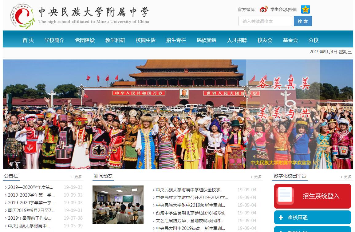 中央民族大学附属中学(以下简称:附中)是一所面向全国招生的公办民族高级中学,位于北京市海淀区,东靠中央民族大学、南邻北京舞蹈学院和国家图书馆,西接北京外国语大学、北连北京理工大学,四周高校林立,人文氛围浓郁,科技信息集中。附中前身为蒙藏学校,创建于1913年。学校培养了前国家副主席乌兰夫、著名诗人郭小川等众多各民族杰出人才,在国内外具有广泛影响。毛泽东主席、周恩来总理对附中给予了亲切关怀并亲自接见了学生代表,前总理温家宝曾为学校95周年校庆亲笔题词,党和国家领导人多次亲切关怀和视察附中。建校百年之际,习近平总书记、李克强总理来信和批示:民大附中自建校以来,培养了大批少数民族优秀人才,他们在各条战线上为人民解放、国家发展、民族团结、人民幸福作出了重要贡献。多年来,国家民委、教育部和北京市的领导和部门对附中的建设和发展给予了大力支持和帮助。附中现有专职教师110名,其中特级教师3名,高级教师52名;博士4名,硕士37名。附中拥有完善的校园网络系统,全部实现多媒体教学。现代化的实验室、微机室、电子阅览室、电子录课室、电子备课室、图书馆和体育馆、塑胶运动场等设施一应俱全。附中面向全国民族地区招收少数民族学生在北京就读高中,附中使用国家通用语言文字授课。2003年教育部发文批准附中少数民族学生毕业当年可以在北京市参加高考和录取。附中实行全寄宿、全封闭式管理,管理制度完备,生活设施齐全,学生有如在家一样的温馨、在家一样的安全;附中注重培养各民族学生之间团结互助、共同进步的同窗感情;注重学生素质的全面发展。近几年,附中苦练内功、内涵发展,办学能力日渐增强,教育教学质量逐年提高。2014年高考再创优异成绩,574人参考(含择校和共建生百人在内的全体学生),572人上了本科线,统招生一本上线率为100%; 650分以上138人,海淀排第三;600分以上403人,海淀排第二;录取清华、北大47人,人大、复旦、上海交大33人。400多人录取到“985”、“211”大学,另有多名同学考入国外和香港等名校。学校各项文体活动如火如荼,竞赛成绩捷报频传。2014年学生在参加各级各类学科竞赛中有582人次获奖,其中市奖388人次,国奖62人次,获北京电视台《状元榜》冠军。教师在课题、赛课、论文、竞赛辅导等获奖154人次。由于办学成绩显著,2011年附中被纳入国家级特色高中建设校的行列;2012年附中构建了“共美教育”课程体系,实施“混和式”培养模式的“共美教育”,并获得北京市自主课程实验学校和自主会考实验学校资格;2013年附中被授予首都“百年学校”光荣称号;2014年荣获国务院授予的“全国民族团结进步模范集体”、校长受到习近平总书记、李克强总理等党和国家领导人亲切接见和鼓励,2015年成为北京市七所高中优质教育资源统筹校之一。多年来,附中一直入选北京大学中学校长实名推荐、清华大学领军计划优质生源基地校、中国人民大学校长直通车计划、复旦大学“望道计划”的校长直推生资格、北京航空航天大学“中国心”、同济大学“苗圃计划”的校长直荐资格等。附中已成为高考北京前茅、高校认同、家长称赞、学生眷恋、社会满意的“品牌中学”,成为广大家长、学生信赖和首选的学校之一。