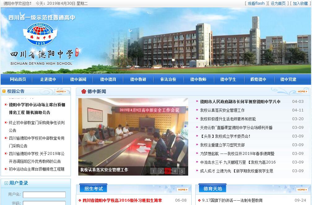 四川省德阳中学,始创于1939年抗战内迁的“国立六中二分校”,校址在德阳县城关外北文昌宫,即今德阳中学初中部所在地,首任校长苏郁文。1950年3月,由四所中等学校合并为德阳县初级中学。1952年经四川省教育厅正式命名为“四川省德阳中学校”,政府拨款在城北文昌宫原址修建新校舍。1960年获绵阳专区高考第一名。1972年,高中恢复招生,学制两年。1982年被省教厅列为首批“四川省重点中学”,高中学制改为三年,建立学校教育教学系列规章制度。1984年,先后设立办公室、政教处等机构,并成立读书指导小组。1986年,建立教职工代表大会制度。1987年,筹建通达电缆厂,开始职称评定工作。同年12月,举行首届艺术周书法美术作品展览。1989年,首次开展德育系列化教育。1994年,提出“强健、正直、博学、创造”的校训,在省内引起强烈反响。1996年通过省级文明单位验收。1997年成为首批四川省校风示范学校。1998年提出“不放弃每一个学生”的教育观念。2001年9月,玉泉路新校区正式投入使用。2002年6月跨入“国家级示范性普通高中”行列。2013年被省教育厅评定为“四川省一级示范性普通高中”。赞曰:昔有文昌故宫,今为德阳中学。始于抗战三九,名于建国之初。传七十载薪火,历曲折之变迁,乃于2001拓玉泉校区,2008逢灾后重建。创国重,立品牌,发展至今,双校齐盛,享誉四方。闻德中当年,高人韵士,卧虎藏龙。崇文重道,立德树人。在陋巷而乐诗书,居斗室而忧天下,风雨飘摇而志节不移,世风不古而情怀弥坚。今我德中师生,当继先贤之学魂,明道正德,发扬蹈厉,兴民族之科教,创巴蜀之名校,诸君勉乎哉!学校教育教学设施齐备,配置精良,初中部享用着一所老牌重点中学全部的教育资源,理化生实验室达到国家Ⅰ类标准,有专用音乐室、美术室、练功房、两个学生机房、两套多媒体教学系统、两个阶梯教室,全部开通了校园网,有设施完备的食堂和学生公寓,400m标准田径运动场,配套设施完全满足了教师教学手段现代化的需要。在“教学生成人、促学生成才、助学生成功”的办学理念的指导下,我校德育工作始终坚持“立德树人”“环境育人”的工作思路。结合贯彻落实中共中央、国务院下发的《关于进一步加强和改进未成年人思想道德建设的若干意见》以及《中学德育大纲》,本着与时俱进的精神,提出德育内容要紧贴时代,形式要丰富多彩、方法要与时俱进、载体要力求创新。建立起党委领导、主管校长负责,政教处、年级组实施、班主任为核心的纵向管理和校工会、教研组、团、队、会、校、家、社横向协调的德育管理机制,逐渐形成了以常规过程管理为中心,以主题活动为载体,以特色文化引领,以社会主义核心价值体系和科学人生观教育为主线,建立以培养合格公民、健康人格品质志存高远的社会主义事业建设者和接班人为目标的渗透型德育教育模式。1、高处着眼,构建科学的德育管理运行机制。2、低处着手,强化养成教育,抓好校风建设。3、创新德育模式,彰显德育特色。我校德育在长期的摸索中,走出了一条“常规教育活动坚持不懈、传统教育活动富有特色、大型主题活动搞出实效”的德育工作新路子,也推动我校德阳工作迈上了更高的台阶。由于德育工作求真务实,我校“严谨、平等、和谐、奋进”的校风得到发扬光大,校园呈现出一派生机勃勃的大好局面,我校全体师生还将以与时俱进、开拓进取的精神,为追求至善人格、至善人生做出不懈努力。德阳中学面向全国广纳贤才,推行“能者上,平者让,庸者下”的激励机制。拥有一支结构合理、学科配套、业务精良、师德高尚的教师队伍。学校现有教职工419人,专任教师377人,其中全国优秀教师6人,享有国务院特殊津贴专家1人,教育部曾宪梓教育基金会优秀教育工作者1人,特级教师6人,省学术技术带头人1人,国家级骨干教师3人,省市劳模、优秀教师137人,68位教师研究生毕业或研修生结业,中级以上职称教师已成为学校教育教学主力军。教师队伍年龄结构合理,百分之八十以上教师都参加了课题研究。近年有20多位教师在全国省市优质课竞赛中获得一等奖。治学严谨,敬业爱生,锐意改革,是德中教师的突出特点。正是由于教师队伍整体素质高,德阳中学在激烈的教育竞争中,勇往直前,挺立潮头,不断地叙写着德阳基础教育的辉煌篇章。在这里,教育者就像辛苦耕耘的农夫,怀揣着一份对生命成长的守望,平等地善待每一位前来接受教育的学生,为他们提供合适的土壤和需要的养分,静待他们扎根出苗、拔节开花。在这里,没有心灵的沟通、没有爱的投入,就没有真正的教育。教育是一种文化浸润心灵、促进人全面生长的活动。学校应当高度关注文化氛围的营造,理解学生成长中的需求与烦恼,尊重学生在课堂教学中的主体地位,唤醒学生的生命活力和学习兴趣,让学生真正成为学习的主人,愿每一位学生在这里都获得成就感!在这里,教师的“自我实现”体现着教师的人生价值,也体现着学校的内在活力。学校应当高度关注作为“人”的教师的幸福指数,为教师创造适合他们生存发展的公平、公正的软环境,点燃他们的奋斗热情,提升他们的生命质量,努力让每一位教师过上有尊严的专业生活!倘若把学校视为一棵不断成长繁荣的大树,所有在这里相遇的教师和学生都是血脉相连的枝和叶。他们永怀仁爱之心,沐浴