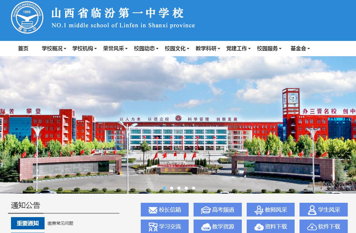 山西省临汾一中是一所拥有120多年历史的三晋名校。始建于1896年,前身为晋山书院,同年在晋山书院的基础上扩建为平阳中学堂,其后几经更名,1950年定名为山西省临汾第一中学校。临汾市政府于2010年投资近5亿元择址新建,2011年8月从鼓楼西街搬迁到滨河西路北段一中路,现在学校占地面积455亩,建筑面积15万余平方米。主要有教学楼6栋,能容纳220名的学生报告厅6栋,能容纳730人及300人的学术报告厅各1个,学生公寓楼9栋,实验楼2栋,图书艺术楼、学生餐厅、行政楼各1栋,一个400米的田径运动场、一个300米的田径训练场及12个篮球场、8个排球场、2个网球场及其他符合班级使用的羽毛球、兵乓球等小型运动场地。为建设园林化校园,把临汾一中建设成为教师宜居乐教、学生阳光乐学的精神高地,在张杨管校长的带领下,我们实施了校园绿化工程,先后规划开发了莲花池、植物园、石榴园、樱花园、玉兰园等各类精品小园林,修建紫藤花架、凌霄花架、蔷薇花架及益智亭、崇德亭、向善亭、尚美亭、立行亭各类景观小品,其中更有姚奠中、樊习一等30余名著名书法家挥毫泼墨,给崭新的一中注入了丰厚的人文气息。现校园绿化总面积13万多平方米,生均绿化面积超过30平方米。学校各种功能教室齐备、先进,校史馆、荣誉室、文体馆、游泳馆、图书馆、实验室、学生发展指导中心、音乐美术专用教室等设施设备配套齐全,充分满足师生学习需要。学校师资力量雄厚,办学规模在临汾首屈一指。现共有84个教学班,在校生4200余人。全校教职工417人,其中专任教师326人,特级教师5人,正高级教师6人,副高级教师104人。近年来,随着学校青年教师培养工程的启动和深入,新入职的青年教师逐渐成长和成熟,现有一大批青年教师已成为学校教育教学的中坚力量。学校以“育创新人才,办三晋名校,创中华一流”为总目标,秉承“以人为本,以德立校,科学管理,创新发展”的办学思路,在全校师生精诚团结、共同努力下,先后荣获“市级名校”、“山西省重点中学”、“山西省示范高中”、“山西省教育系统先进集体”、“全国教育系统先进集体”、“全国重点大学暨‘211工程’大学生源基地”、“全国素质教育先进示范校”等系列荣誉称号,成为名重三晋、誉满四海的一流名校。学校每年凭借文化课达二本B以录取线的比例占到96%以上,进入“985”和“211”“双一流”院校的学生达到600余人,2000年后考上清华、北大的学生百余人。截至目前,我校先后成为清华大学、中国人大、天津大学、南开大学、武汉大学、哈尔滨工业大学、西安交通大学等30余所“985”名校生源基地。学校在关注教育教学质量的同时,更关注学生的养成教育和综合素养,文体、科技类活动丰富多彩。我们紧紧围绕培育和践行社会主义核心价值观这条主线,落实“立德树人”的基本要求,坚持管理育人、班级育人、环境育人、活动育人、服务育人,不断提高德育工作的整体效果。以加强学生自我管理、自我评价、自我教育为手段,以主题班会、大型讲座为阵地,以入学教育、社团活动、文化节、艺术节、科技节、体育节、感恩周、元旦联欢等活动为平台,引入量化考核、班级评比、文化熏染、家校共建机制,全方位、多形式地弘扬践行社会主义核心价值观,培育民族精神教育,加强传统美德、文明礼仪和行为习惯养成教育。在科技教育方面,我校以信息技术和通用技术研究性学习课程开设为基础,组建机器人小组,参与省内赛事,连续多年在青少年科技创新大赛和中国青少年机器人大赛活动中被评为先进集体。在全国中学生数学、物理、化学、生物、信息等奥赛中,有多名学生获得省一等奖,部分同学进入省队或获得清北降分录取。在艺体方面,我校先后被评为全国体育传统项目学校、全国啦啦操实验学校、全国国防教育特色学校、全国青少年校园篮球特色学校、全国创新作文教育实验基地。在学生社团方面,临汾一中秉持大力培植学生综合素养,服务学生全面健康成长的目标,先后成立尧声文学社、商社、校园之声广播站、学生联盟论坛、青年志愿者协会、微力量、浣熊心灵成长俱乐部、跆拳道俱乐部、星海艺术团、悲鸿书画社、创客俱乐部、朗悦社、影视文学欣赏协会、新竹文学社、英语协会等15个学生社团。从临汾一中走出去的学子,因为学习品质和习惯好,综合素养和创新能力强,来自清华大学、北京大学、天津大学、中国科技大学、国防科技大学、中南大学、华中科技大学、郑州大学、东北大学等大学纷纷发来贺信或喜报,好评如潮。临汾一中秉承古老尧乡的博大文化,浸润秀美汾河的千古灵气,在市委、市政府的亲切关怀下,在上级主管部门的大力支持下,在以张杨管校长为核心的校领导班子的带领下,全校上下精诚团结、不忘初心、砥砺前行,将使临汾一中驶上领先三晋、名气全国的快速发展车道。
