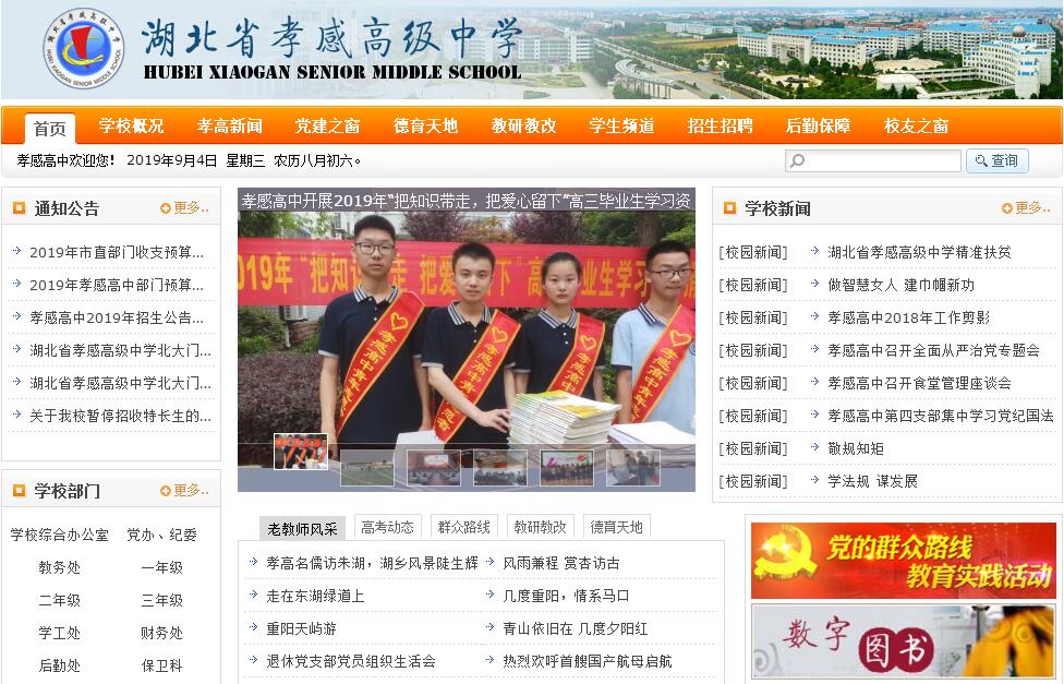 湖北省孝感高中位于湖北省孝感市,解放初期就是省级重点中学,是湖北省示范学校、湖北省教育科学研究实验中学,湖北八校联考成员。学校成立于1946年,1978年恢复重建,1998年被湖北省政府教育督导室评为“省级示范学校”。2002年9月,整体搬迁至交通西路。截至2011年5月,学校占地300亩,建筑面积10万余平方米,共有在岗教职工386人,在校学生6000人,开办90个教学班,专职教师306人。截至2015年1月,学校每个教室配有空调、多媒体设备,拥有各种学生活动室、功能室;学校建有学生宿舍4栋、学生公寓4人一间,普通宿舍6-8人,均配有书桌、书橱、盥洗间、空调、热水器等设施。截至2013年10月,学校图书馆建筑面积2000多平方米,馆内除设有基藏书库、外借书库、学生阅览室、教工阅览室、过刊资料室、相关管理室等成龙配套的功能库室,馆外还交叉配有电子阅览室、教材室等。共有纸质图书62000余册、电子图书50万册、报刊杂志160多种,各阅览室(含电子阅览室)座位总计520个。每年还新增纸质图书生均超1册。2016年高考,普通文理科过一本线人数共计1092人。其中理科过一本线1006人,文科过一本线86人;600分以上411人;获孝感市文理状元;同时,孝感市理科前十名占9名,文科前十名占7名。2010年,在全国高中数学竞赛中,1名学生获得全国一等奖、10名同学获全国二等奖、7名同学获全国三等奖。在孝感市首届中小学生作文擂台赛中,7名同学获一等奖、5名同学获二等奖、4名同学获三等奖。1名学生湖北省第三届中学生英语口语竞赛中获高二组一等奖。在2010年全国高中化学竞赛中1名学生获全国一等奖、6名同学获全国二等奖、2名同学获全国三等奖。在2010年全国中学生生物联赛中,2名同学获全国二等奖、6名同学获全国三等奖。在2010年全国中学生地理奥林匹克竞赛中,4名同学获省一等奖、2名同学获省二等奖。在2010年全国信息学奥林匹克竞赛中,1名学生获全国一等奖。2名学生获第25届湖北省青少年科技创新大赛青少年科技创新成果一等奖。2014年5月,4名教师参加市“课内比教学”比武活动获一等奖。6月28-30日,学校承担的教育部课程教材研究所“十二五”规划重点课题高中子课题《新课程高中化学教科书实验改进的研究》取得成果29件,获得省级奖项5项,经课题鉴定小组研究鉴定,认为学校化学课题成果达到一级水平。