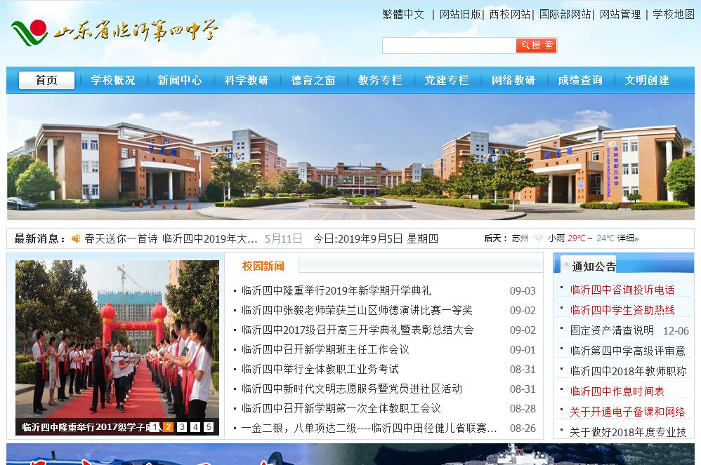 临沂四中创办于1973年,是山东省规范化学校、山东省普通高中教学示范校、全国特色化高中。占地287亩,总建筑面积12万7千平方米。现有93个教学班,学生5600余人,教职工478人。学校师资力量雄厚,有国优教师、特级教师4人,省市教学能手、齐鲁名师22人,硕士研究生54人。学校实验楼、科技楼按国家一类标准配备实验仪器,有多媒体教室、语音室、微机室、主控室共11口。图书楼藏书50余万册,藏书量全市第一。着眼于素质教育发展的需要,学校高标准建成通用技术教室、音乐教室、美术教室、书法教室、史地教室、大型舞蹈室共15口。生活区拥有可满足6000人同时就餐的三层多功能学生餐厅。运动区有大型全塑胶400米跑道,足球场、篮球场、排球场及其他体操场地器械齐全。学校按照“全力促进师生发展,共同打造幸福家园”的总体目标,努力营造“风正气顺心齐、科学优质高效”的浓厚氛围。一是抓人心,聚士气。以严格为本,以公平为基,让教师感受到职业尊严,极大地提高了学校的向心力和凝聚力。二是抓体制明责任。秉承“从细从严、致高致远”的管理理念,实行“小单元、低重心、少层次”的级部责任管理制,教育教学秩序得到极大转变。三是抓规范建秩序。学校从严查手机入手,规范学生行为,达到了“干干净净、整整齐齐、安安静静、板板正正、平平安安”的管理效果。四是抓课堂提效率。全体教干推门听课,扎实推进课堂改革,提高了教学效率,教学质量大幅度提升。学校坚持用育人教育促进升学教育,通过差异教育保护学生的学习个性,提出了“让乔木长成最好的乔木,让小草长成最好的小草”的育人理念,制定了“尊重人格,挖掘潜能,承认差别,彰显个性”的育人策略。近两年全市高中学校管理教学座谈会、兰山区中小学教学管理研讨会相继在我校举行,学校连年被评为“普通高中教学工作先进学校”、“普通高中教学工作优秀人才培养先进学校”等。学校继续加大对国际部的管理力度,探索班级分层教学模式,积极引进外教、名师,把国际部打造成了四中办学的一个亮点。国际部首届26名毕业生共获得62份美国大学录取通知书,其中世界排名前50位大学的录取通知书有22份。我们坚持因材施教,成立了青少年科技创新和学术研究小组,通过科技创新拓宽了学生的成才渠道。学校荣获“临沂市青少年科技创新市长奖组织奖”,被评为“山东省科普示范学校”,被中国科协确立为“全国科普教育基地”。每年有几十名同学获国家级、省赛区各类竞赛一、二、三等奖并具备了高考自主招生资格。西城校区已进入完全规范和特色初显的时期,现有45个教学班,在校学生1830人,教职工181人,实现了从幼儿园到高中一贯制的精英教育。学校将在现有成绩的基础上继续坚定“精品学校、精良团队、精致管理、精英教育”的办学目标,攀登全市乃至全省基础教育完全学校的新高地。学校以“尊重规律办教育,从细从严抓管理,依靠科学提质量,以人为本促发展”为办学思想,进一步尊重教育规律,树立大教育观,培养教师浓郁的教育情怀,使教师具备职业良心、职业操守和职业理想,保持健康向上的精神风貌;进一步从细从严抓管理,规范学生行为,切实抓好学生的常规管理,强化学校督查和级部自查力度,实行每天一通报,每周一小结,每学期一总结的反馈制度,按时进行级部、班级德育效果评价,着力创设良好的学习环境;进一步依靠科学提质量,狠抓高效课堂建设,确立科学的教师发展策略和学生发展策略;进一步以人为本促发展,落实全员育人导师制,实行师生结对帮扶,全方位育人,加强交流沟通,继续建立健全多元化、个性化、激励性评价机制,定期开展“学习之星”、“进步之星”、“文明之星”、“特长之星”、“感动之星”等评选及表彰活动,做到以良好的校风熏陶学生,以严谨的师风影响学生,以优秀的服务关爱学生。站在新起点,追求新跨越,学校将凝神聚力,真抓实干,为“建文化家园,走育人之路,办优质教育,创齐鲁名校”而努力奋斗。