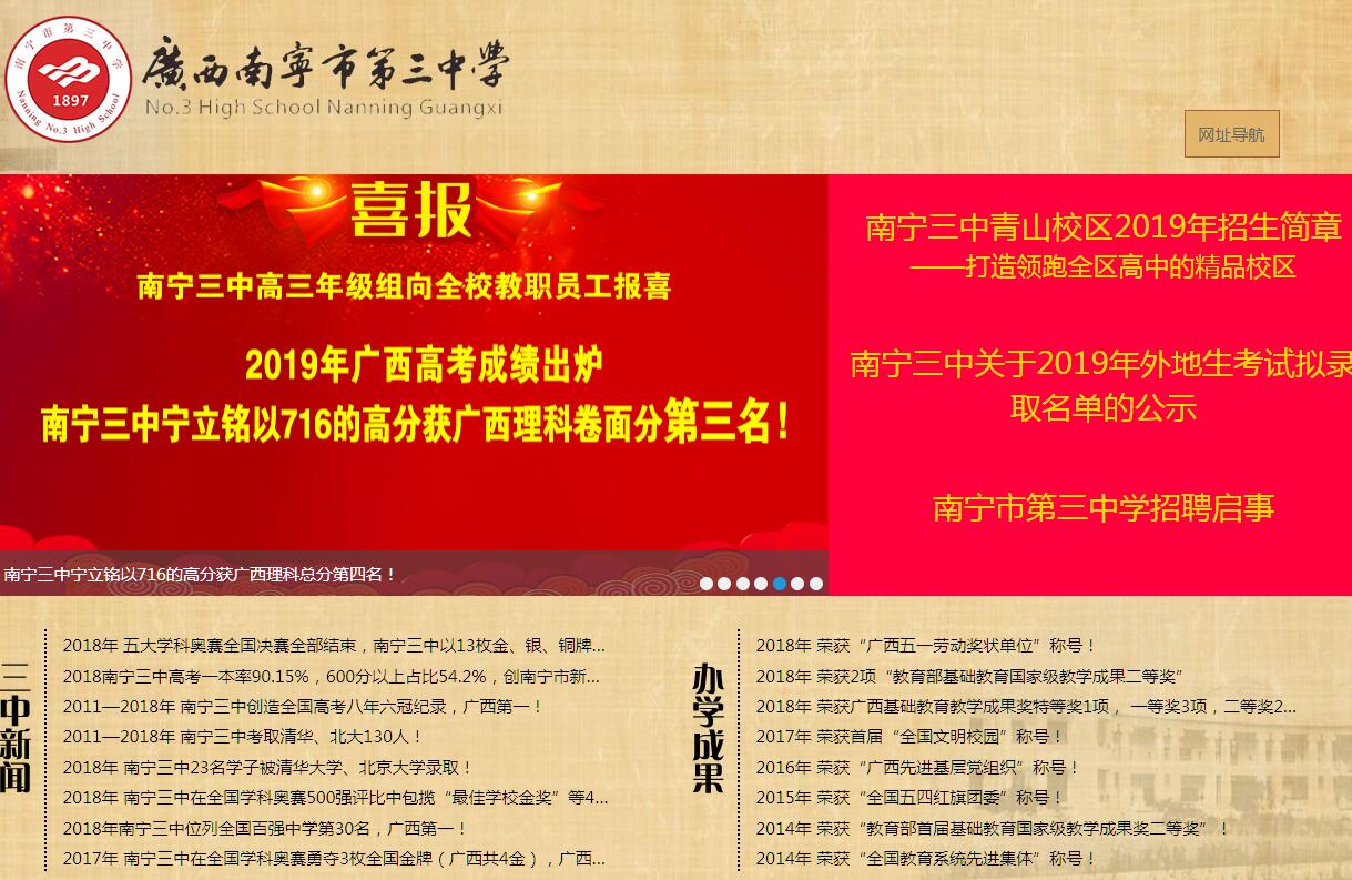 广西南宁市第三中学前身可追溯到1897年维新人士余镜清创办的“乌龙寺讲堂”,迄今已有120年历史,学校办学历史悠久,横跨三个世纪,两个甲子,见证了中国近现代及当代教育史。在坎坷漫长的办学历程中,曾九易校名,更因战乱辗转多地办学,薪火相传,文脉绵远,从未中断。学校秉承“保国爱生”的教育传统,曾先后提出“敦品力学”“明耻教战”“勤奋学习,立志报国”等激励人心的校训,最终形成“真·爱”教育的独特办学思想及“德育为先,文理并重,崇尚一流”的鲜明办学特色。一八九七年“乌龙寺讲堂”办学肇始,一九二八年定址南宁市高庙坡,一九五四年奉命迁校埌边,南宁三中从此落户于巍峨青山北麓,旖旎南湖之畔。近年来,南宁三中顺势腾飞,先后开办初中部青秀校区、高中部五象校区、初中部五象校区,加之三美学校,目前学校占地总面积已经530935平方米,在校学生8000 人,多校区齐头并进,各具特色,各美其美,南宁三中已打造成广西空前强大的基础教育集团,一艘广西基础教育的庞大航母正劈波斩浪,高歌前行。南宁三中各校区建筑美轮美奂。教学设施、生活设施、运动设施全区全国一流,各校区文化底蕴深厚,环境古朴优雅,书声雅韵,绕梁不绝。莘莘学子,勤学上进。学校师资力量雄厚,名师辈出,拥有黄河清、杨泰金、李晓翎、韦屏山等一批在全国全区有较大影响的教育教学专家。目前全校教师636人(加上教辅人员共有830人),有正高级教师1人,高级教师 127人,享受国务院特殊津贴 2人,国家级骨干教师培养对象12人,广西21世纪园丁工程A类培养对象22人,全国优秀教师3人,南宁市教坛明星8人,学科带头人60人,教学骨干185人,在国家、自治区及南宁市各类优质课比赛中获奖者不计其数。学校校风严谨,学风淳厚,始终走在新课改的前沿,拥有严密的课程体系,除国家课程外,还开设了丰富的地方选修课程及校本课程,突出培养学生创新能力,实践能力。学校历年高考成绩显著,尖子生、一本率长期名列广西前茅,2008年以来共培养出广西高考总分状元6 名,每年向清华大学、北京大学等国内外名校输送大批优秀学子,数学、物理、化学、生物、信息学等学科奥赛成绩在广西独领风骚。学校先后被北京大学、清华大学、南京大学、华中科大等一流高校授予“优秀生源基地”。南宁三中以其卓越的办学成就,厚重的文化积淀,鲜明的办学特色吸引了全区优秀学子,成为莘莘学子神往的求学殿堂。南宁三中在社会上享有崇高的声誉。学校先后获“全国教育系统先进集体”“全国教育技术实验学校”“全国群众体育先进单位”“全国五四红旗团委”等国家级荣誉和“广西优秀基层党组织”等自治区、南宁市荣誉称号。在党的十九大精神鼓舞下,南宁三中人将与时俱进,不忘初心,砥砺前行,继续创造新的辉煌。