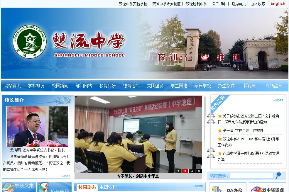 四川省双流中学具有悠久的办学历史、丰富的办学经验。1940年由时任四川省监理主席蒋中正先生批建,国民党元老于右任先生题写校名;原国民党军事委员会副委员长、爱国将领冯玉祥曾在此作抗日动员演讲,并向青年学生面赠《学生救国问答》一书。1996年成为省级重点中学,2002年成为国家级示范校,2009年,“四川省双流中学教育集团”成立。2013年,成为首批“四川省一级示范性普通高中”。2016年,成为成都市首批领航高中项目学校。四川省双流中学有优异的办学业绩。近年来,双中共为国内外高校输送合格新生20000余名,其中为清华、北大、复旦、人大等一流学府输送新生1800余名,上本科线人数年年超过千人,位居成都市同类学校前茅,培养出省、市、县高考冠军17名。四川省双流中学具有优美的校园环境、温馨高雅的校园文化、现代化的教学设施。目前,学校占地130余亩,建筑面积79587.6平方米,8跑道400米塑胶运动场1个,图书馆面积1192 平方米,藏书126132册,多功能活动厅2992 平方米,实验室及功能室面积6000余平方米。教室80间,每间教室均配备电子白板及多媒体系统,有高规格的学生公寓和学生食堂。四川省双流中学现有在校学生3500人,70余个教学班,在职教职工381人,其中:全国优秀教师1人,省优秀教师4 人,特级教师(校长)7人,高级教师200多人,各级各类名师200余人。根据学校文化顶层设计,为实现育人目标,学校提出打造“精英教育”特色品牌,建设符合双中育人目标的“一个目标、二元导学、三分课堂、四类课程”特色课程体系。“一个目标”,让课程更好地服务于学生成长。通过国家课程校本化,校本课程多元化,培养学生的精英意识,让学生最终成长为具有意志力、领导力、记忆力、领悟力、想象力和创造力的社会精英。“二元导学”,以课堂为阵地,提高教师教学针对性——目标、活动、评价,增强学生学习参与度——预习、互动、训练。学生不但学有目标,学有路径,学有方法,学有信心,而且最终实现老师“鱼渔双授”,学生“鱼渔双收”的目的。“三分课堂”,分层设班、分类走班、分疑网班。全校各年级实施走班制教学(分层设班和分类走班);构建好分疑网班平台(学校自主开发,现已上传300多个微课课件),真正做到提高教师教学的针对性,增强学生学习的参与度。“四类课程”,统筹国家、地方、学校三级课程,构建学校以“修身立德(仁)”“认知素养(智)”“气质涵养(雅)”“和谐共融(和)”为中心的课程体系。学校可供学生选择的校本课程有100多门。学校还将继续开发优秀校本课程,通过专家审核,确定为校本必修课程。总之,通过国家课程校本化,校本课程多元化,培养学生的精英意识,让学生最终成长为具有意志力、领导力、记忆力、领悟力、想象力和创造力的社会精英。凭借扎实的教学功底、稳健的教学风格和突出的教学成绩,四川省双流中学获得了家长的肯定和各级教育部门的高度认可。四川省双流中学先后荣获中国百强中学、全国基础教育名校、国家级体育传统项目学校、建国六十周年四川省十大名牌院校、中国师德建设示范单位、21世纪中国素质教育先进示范学校、全国学校文化建设金奖单位、中国西部名校、全国巾帼文明岗、全国群众体育先进单位、全国优秀传统文化进校园项目试点学校、四川省校本研修示范学校、成都市教师发展基地学校等殊荣。由于在普通高中教育教学工作中成绩突出,连续几年被成都市教育局评为“优秀学校”。在校训“仁”、“智”、“雅”、“和”的引领下,四川省双流中学实行“二元导学”,致力于“双商教育”。同时,根据国家要求、双中特色和学生需求稳步推进新课改,不断地加强课程建设。为了让每一个孩子更全面地发展,四川省双流中学先后开设了“职业生涯规划”、“日语”、“小吃制作”、“《红楼梦》欣赏”、“茶艺”、“笛箫吹奏”等上百门精品选修课程,同时还组织了舞蹈社、话剧社、汉服社、动漫社等各具特色的社团。近年来,四川省双流中学本科上线率、一本上线率节节攀升,同时艺体教育齐头并进。为了实现德智体美全面发展的育人目标,四川省双流中学精心组织了一年一度的元旦表演、运动会、国庆大合唱等大型活动,同时也积极策划社会实践活动。 “双中少女合唱团”“双中女子垒球队”“双中射箭队”“双中田径队”“双中健美操队”“双中跆拳道队”“双中啦啦操队”多次夺得国内国际大奖和全国冠军;学校训练培养出国家二级以上运动员120余人,有35件学生美术作品入选四川省九年制义务教育教材。四川省双流中学的学生不仅获得国内高校的高度评价,而且还得到了许多国外名校的垂青。四川省双流中学已经与澳大利亚奥本中学、爱尔兰都柏林工业大学等国际知名学校建立了友好合作关系。