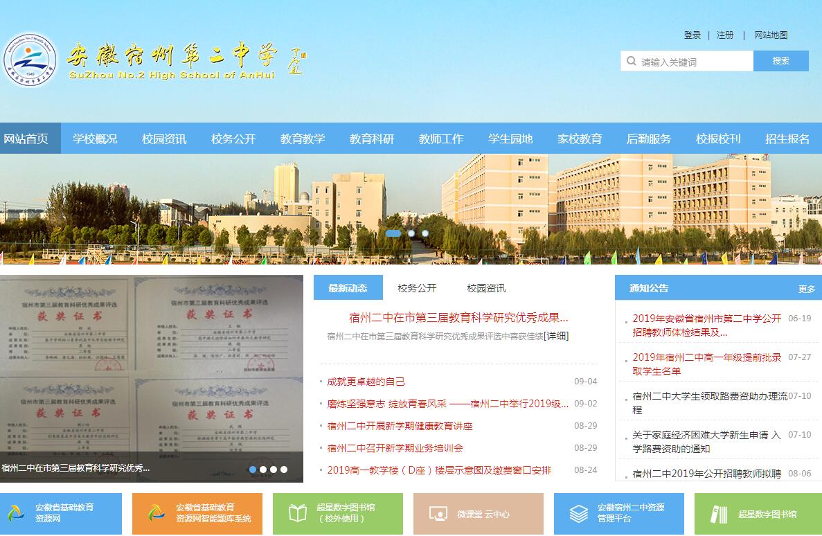宿州市第二中学始建于1940年,前身是私立崇真中学。建国后,由人民政府接管,迁址扩建,逐渐发展壮大,成为宿城名校,1978年以来,乘改革开放东风,学校实现了跨越式发展。1985年晋升为省重点中学,1999年评定为省示范高中并由县级管理上划归市级管理。现为全国现代学校联盟行动计划首批加盟学校、全国特色学校、全国教育科研先进集体、全国家教名校、全国青少年普法教育先进单位、安徽省文明单位、安徽省教育系统先进集体、安徽省基础教育课程改革先进单位、安徽省创新特色高中试点学校、安徽省体育特色学校、安徽省艺术特色高中联盟常任理事学校。宿州二中原老校区占地不过百亩,2006年市委、市政府决定在市经开区建设占地240多亩二中新校区,2009年新校区建成投入使用。学校面积扩大了3倍。高中部1992年以前每个年级是4个班,1992年以后逐渐扩大招生规模,至2009年每个年级已达到35个班。每届毕业学生由原来的200多人增至2000多人,增加了10倍。2013年9月,在市委、市政府的坚强领导和大力支持下,宿州二中实现了初、高中分离,集中精力办好高中,学校面貌更为之一新。学校现有105个高中班,在校学生5762人,在岗教职工394人,专任教师348人,其中正高级教师3人,特级教师5人,高级教师156人。国家、省、市级学科带头人及骨干教师35人。近年来有5位教师参与高考命题,数十位教师在全国、省优质课大赛中获奖;教师在国家级核心期刊发表专业学术论文400余篇,专业化水平不断提高。目前学校研究的国家级课题6项、省级课题16项、市级课题30余项,有20多项教科研成果获得国家、省、市级奖励。新二中教育教学设备、设施功能齐全,为莘莘学子提供了可靠的生活、学习保障。学校创新教育模式,促进学生特长发展,在教育部中国教师发展基金会、省教育厅、省侨联、市教体局大力支持下,举办珍珠班、卓越人才实验班等特色班。学校扎实推进素质教育,积极开展学生社团活动。夏荷文学社、紫芦文学社、春雷话剧社、碧柳书画社、天地人地理社团、摄影协会、校园足球俱乐部等40余个学生社团先后成立,社刊陆续定期出版发行。春雷话剧社学生成功演出了《雷雨》《罗密欧与朱丽叶》、茶馆》《哈姆雷特》《日出》等经典话剧,受到我校师生和社会各界的广泛关注。学生在实践中提高了综合能力,发展了个性特长。全校上下和衷共济,锐意进取,教育教学成绩斐然。近年来各类学科竞赛获国家、省、市级奖励超过600人次;全国青少年科技创新大赛和艺术类比赛获国家、省、市级奖励130多人次。2015届、2016届高三珍珠班获得省级学科奥赛、科技创新大赛奖项达106人次;高考上一本线率平均为96%。学校先后为清华、北大等“985”高校输送了大批优秀新生,本科达线率稳居宿州市前列,多次荣获市政府贺电和嘉奖。龙潜大泽蓄势飞,站在新起点上的宿州二中正实现着又好又快的发展。