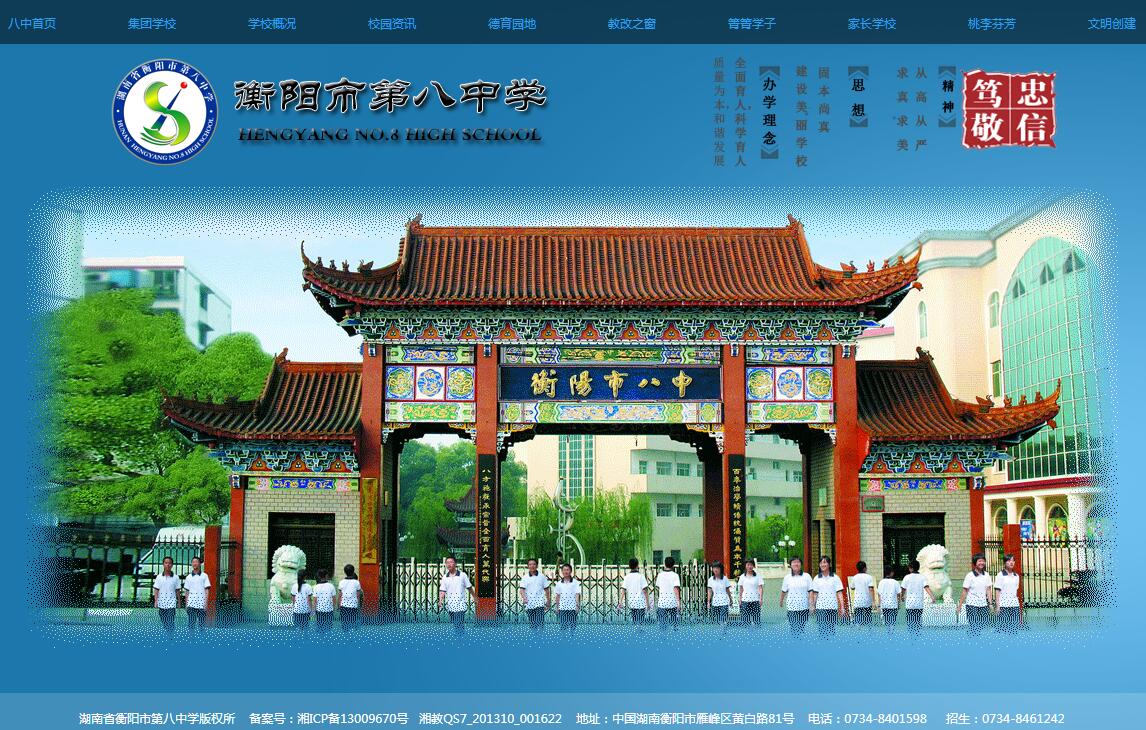 | 网站简介: 湖南省衡阳市第八中学创建于1907年,其前身为私立成章中学,素有“湘南名校”之称。自1959年起,该校曾先后四次被省教育厅定为省属重点中学,1994年成为湖南省首批挂牌重点中学, 2002年被评为全国现代教育技术实验学校,全国百所知名重点中学。2003年在湖南省首次教育督导评估中,综合得分位居全省第三,被誉为“湖南省重点中学的领头羊”。2004年成为湖南省首批挂牌的省示范性高中。2005年、2007年两度被评为“全国百强中学”,成为湖南省享有此誉的五所学校之一。百年的发展,演绎成学校“全面育人,科学育人;质量为本,和谐发展”先进的办学理念,严谨精业、合作创新的教风,博学慎思、明辨审问的学风,锤炼出自信自强、团结奋进、敢当第一、勇创一流的八中精神和从高从严、求真求美的八中校训。学校成为了一所教风正,学风浓,质量高,家长依赖,学生喜爱,人民满意的学校,被誉为“温馨的校园,成才的摇篮”。 |