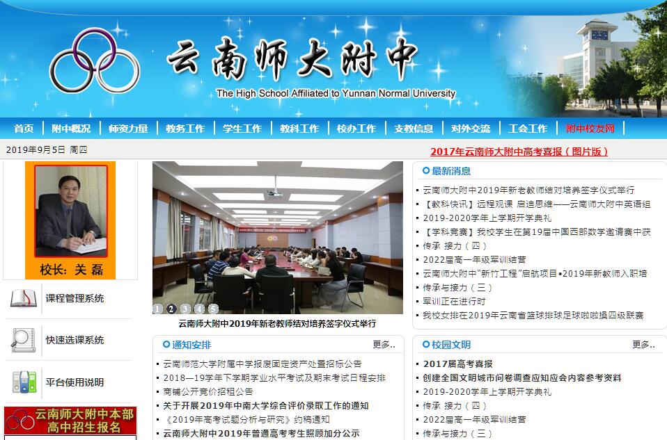 云南师大附中是一所历史悠久、治学严谨、学风浓厚、人才辈出、在省内外基础教育界享有盛名的省属一级一等完全中学,是云南省科技教育的示范学校,是国家基础教育重点科研课题基地学校,是全国现代教育技术实验学校,是中国教育学会高中教育专业委员会、全国部分大学附中协作体、全国知名中学科研联合体的理事单位,是全国民族团结先进单位、全国教育系统先进集体。云南师大附中创建于1940年11月21日,前身是“国立西南联合大学师范学院附设学校”,简称“联大附校”。1942年中、小学分开设置,改名为“国立西南联合大学师范学院附属中学”,简称“联大附中”。抗战胜利后,组成西南联大的清华、北大和南开三所大学复员北返,1946年更名为“国立昆明师范学院附属中学”。新中国成立后,人民政府接管,1950年改名为“昆明师范学院附属中学”。1984年“昆明师范学院”更名为“云南师范大学”,附中随之易名为“云南师范大学附属中学”。学校地处昆明市高新技术开发区洪源路36号,占地面积160亩,建筑面积7万多m2。校园布局合理,设计精巧,环境优美,四季鲜花盛开,营造了一个优雅、舒适的育人环境;设施设备齐全,功能完善,有配备了各种现代化教学实验设备、气势恢弘的教学综合楼,现代化程度很高的信息中心,适合学生发展特长的音体馆,功能齐全的生活服务综合楼,温暖舒适的学生公寓;另有达到国家标准的塑胶田径运动场、篮球场、排球场;馆藏图书59679万册,电子图书3万册,书刊杂志220种,报纸20多份;实现了教育、教学和管理网络化。这里已成为有理想的教师实现个人价值的舞台,万千学子放飞理想的乐园。学校现有52个教学班,学生人数近3198人;教职工有333人,高级教师148人(其中特级教师13人),一级教师129人,硕士研究生66人,省、市级学科带头人、骨干教师55人,先后有20多位教师接受了中小学骨干教师国家级培训,形成了一支品德高尚、业务精湛、治学有方、为人师表、优秀稳定的教师队伍。建校至今,历尽沧桑,数迁校址,名随世易,血缘不变,精神永存。经过几代附中人的不懈努力,形成了“求实、认真、团结、进取”的校风;“严格要求、科学管理、勤奋好学、勇于探索、团结协作、以身作则”的领导作风;“严谨治学、开拓创新、诲人不倦、为人师表”的教风;“严格广博、勤奋好学、勇于探索、追求不息”的学风。 学校一贯重视学生的全面发展,本着“一切为了学生的健康成长,一切为了学生的终身奠基”的思想,以育人为根本,以教学为中心,以质量为核心,全面实施素质教育,要求学生“先学会做人,再学做学问,不仅要学会,关键要会学”,做到“做人、求知、健体、办事”协调发展。结合学生兴趣特长,开设了形式多样的活动课和选修课,学生社团活动和文化活动丰富多彩。78年来,桃李芬芳,硕果累累,为国家培养了5万多学子,造就了一大批栋梁之材。其中有为新中国的建立抛洒青春热血的席淑筠、郎宝媛、庄任秋烈士;有参加抗美援朝的魏兆德等19位英雄战士;有著名作家罗广斌、宗璞;有著名数学家朱永津;有中国科学院院士万哲先、戴汝为、严陆光;有我国自己培养的第一位计算机女博士谭小南;有省级干部齐怀远、朱志辉、戴光禄;有全国青年十杰优秀企业家郑天一,优秀企业家黄思烈;还有全国优秀共青团员王佳,上海大学生十大风云人物吴媛媛,昆明“十大杰出青年”曹军、文镇、郝亚敏等一大批优秀同学。在不同历史时期,不同领域,数以万计的附中学子为国家做出了突出的贡献,为学校赢得了荣誉。恢复高考以来,学校的教学质量一直保持云南省领先地位,为高一级学校输送了大批优秀人才,有600多名学生考入清华、北大深造,有30多名学生考入香港大学,培养了38名云南省高考状元;在全国学科竞赛中,学生成绩斐然,有69名同学获云南省第一名;为西藏培养了250多名学生,为我省20多个少小民族培养了1000多名优秀学生。为开拓学生视野,树立全球化意识,培养具有国际眼光的人才,我校先后与泰国朱拉隆功大学附中、澳大利亚墨尔本威斯理学院、美国伏蒙特学校、英国家林学校、印度圣泽维尔学校等结为友好学校;多次接待缅甸、泰国、伊朗、日本、美国、英国、瑞土等国和港澳台地区的教育参观访问团。为满足人民群众对优质教育的需求,发挥附中在云南基础教育的引领和辐射作用,我校先后创办了“云南师大实验中学”和“云南师大附中呈贡校区”,为我省基础教育办学模式改革提供了宝贵经验;按照“服务全市,带动全省”要求,一直选派骨干教师、学科带头人到全省14个地州讲课、培训教师,与广南一中、梁河一中等兄弟学校建立智力扶贫关系,促进了当地教育质量的提高。多年来,学校的办学成绩得到了国家、云南省、昆明市和云南师大的肯定和嘉奖。硝烟弥漫,迎来了学校的诞生;峥嵘岁月,见证着学校的成长。在新的教育改革大潮中,我们将进一步解放思想,更新观念、抓住机遇,认真贯彻落实《国家中长期教育改革与发展规划纲要》,加强干部、党员和师资队伍建设,不断深化教育教学改革,积极探索全面实施素质教育的有效途径,促进学校提升内涵、科学发展,朝着“省内领先、全国一流、世界知名”的方向而迈进,为国家培养更多更好的德、智、体全面发展的社会主义建设者和接班人!