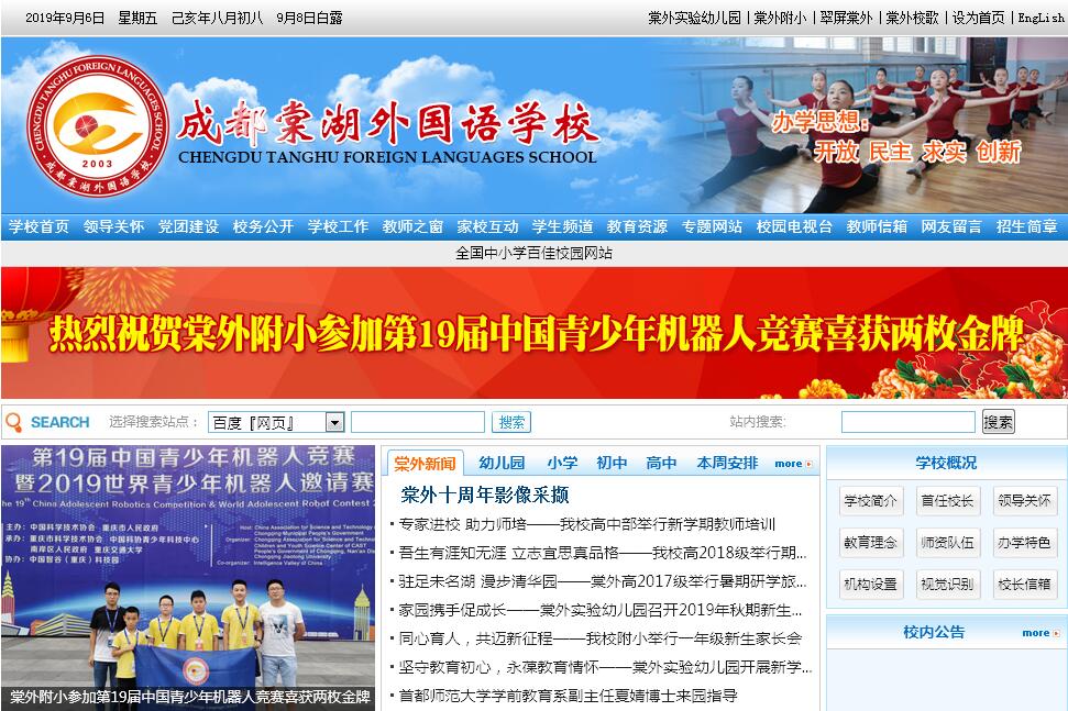 成都棠湖外国语学校(简称“棠外”,原名四川双流棠湖中学外语实验学校)是经四川省教育厅批准、于2003年建成的一所全寄宿制现代化股份制学校,包括幼儿园、小学部、初中部和高中部(含国际部)。学校坐落在双流西南航空港经济开发区核心地带,毗邻双流国际机场,距成都市中心8公里,紧邻机场高速、成雅高速,交通方便快捷。校园被四川大学、西南民族大学、成都信息工程大学等高校的新校区和中科院产业园区环抱,科学文化氛围浓郁,被人们誉为“大学怀抱中的学校”。校园占地近300亩,环境优雅,设施一流。建有现代化的教学楼、科技实验楼、信息技术中心、艺术楼、科技馆、机器人创新工作室、创客中心、电子图书馆、音乐厅等。学校在“仁、德、志、譞”的校训和“六会一长”(会做人、会求知、会生活、会审美、会健体、会创造、有特长)的育人目标的引领下,全面贯彻党的教育方针,深入实施推进素质教育,立德树人,坚持多元办学、因材施教、精细化管理的教育模式,让每一位学生都能有所进步和提高,建校十几年来取得了丰硕的教育教学成果,赢得了家长的认可和社会的广泛赞誉。学校先后被评为“四川省文明单位”“四川省一级示范性学校”“全国首批示范性外语特色学校”“全国先进民办学校”“全国关心成长模范学校”“全国基础教育改革示范学校”“全国素质教育典范单位”“全国教育科研先进单位”“全国百强特色学校”“全国特色建设先进学校” “四川省阳光体育示范学校”“四川省艺术教育特色学校”“首届成都最美校园”。