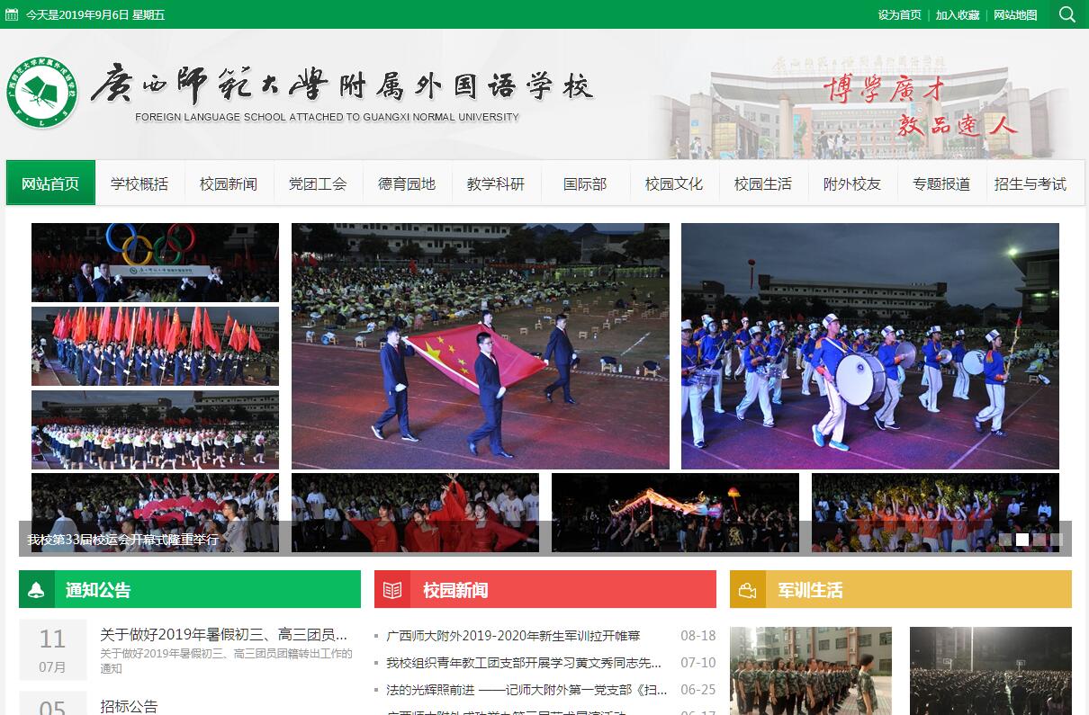 广西师范大学附属外国语学校位于“山水甲天下”的桂林市,创建于1984年。学校校园占地面积240亩,现设有初中部、高中部和国际部,共86个教学班近5000名学生,有教职工500余人。现任校长文国韬,中学特级教师,广西师范大学教育硕士生导师,北京师范大学在职教育与经济管理学博士,中国创新人才教育研究会常委理事,广西高中课程改革委员会专家,桂林市政协委员,先后被评为自治区优秀教育工作者、全国素质教育先进工作者、全国科教先进校长、广西壮族自治区劳动模范、广西壮族自治区优秀教育工作者,2015年被评选为教育部首批中小学名校长领航班培养对象。学校办学三十多年,成绩斐然。学校先后荣获“清华大学新百年领军计划”资质学校、“北京大学中学校长实名推荐”资质学校、“广西示范性普通高中”、“广西示范性特色学校”、“全国合格外国语学校”、“国家汉语国际推广中学实习基地”、“创新教育示范科研基地”等称号,是清华、北大、复旦、南京大学等三十多所全国著名高校优质生源基地,2014年被评为“全国教育系统先进集体”。学校拥有一支“敬业乐教、爱生善教”的高素质教师队伍,在职教师300多名,来自全国二十多个省市;其中在职特级教师8人,硕士研究生60余人,中高级教师占全校教师比例为85%,本科和研究生以上学历的教师为100%。学校以“博学 广才 敦品 达人”为校训,“以人为本、全面发展、崇尚一流、追求卓越”为办学思想,以“外语学校的生命力,在于整体水平的提高”为办学理念,实践“有效思维课堂 绿色全人教育”的教育教学观,以文化为引领,内涵为重点,制度为保障,队伍为依托,课程为载体,创新为动力,努力提升办学品质和综合效益,不断推进学校健康持续发展,教师师德水平和专业素养有效提高,学生全面而有个性地发展。学校积极探索德育新路子、新途径,形成了“博学 广才 敦品 达人 ”绿色全人教育课程体系和“一、二、三、四、五”特色德育模式。即突出一个核心:以爱国主义为核心;明确二个素养:以培养公民素养和国际理解素养为两翼;探索三条途径:以理性、情感和体验教育为育人途径;养成四种习惯:以培养学生良好的学习习惯、生活习惯、行为习惯和思维习惯为抓手;实现五个目标:以教会学生学会做人、学会学习、学会生活、学会合作、学会审美、学会创造为培养目标。努力开创学校德育工作新格局,为学生的全面发展、个性发展、和谐发展和终身发展奠定坚实的基础。学校积极推进课程改革,重视课题研究,坚持科研兴校,走内涵式发展道路,科研成果显著。2000年以来,学校承担和参与了51项市级、省部级重点教育科研课题研究,80多位教师代表广西参加全国各类优质课竞赛获奖,在省级以上刊物公开发表论文300多篇,出版专著或教辅读物200多部。学校学生参加各学科的全国、全区奥赛和青少年创新大赛,共有2000多人次获一、二、三等奖,获全国奥赛省级赛区一等奖以上的有219人,学生代表广西参加奥林匹克总决赛取得了19银24铜的优异成绩。学校注重教学改革,教学质量逐年提高。参加高考19年来先后近180人考入清华大学、北京大学,1000多人考入复旦大学、浙江大学、上海交通大学、中国人民大学、中国科学技术大学等全国“双一流”大学,200多人考入国外知名大学。在2018年的高考中,我校实现了高考十九连冠!一本率达98.0%!创广西历史新高。文理科总分平均分居广西第一,14项单科平均分,我校9项获得广西第一。周君柔同学以总分676分高居2018年广西高考文科榜首,黄子苗同学以总分671分获得文科第二名。刘嘉联同学以考分693分位列广西高考理科第8名。我校考生546人,总分600分以上学生人数达336人,占61.5%,处于广西绝对领先地位。2018年,中考全A人数、一等人数和学科平均分继续领跑桂林市,实现了23连冠。作为外国语学校,学校的英语教研教改和教学特色突出,硕果累累。2000-2017年参加全国中学生英语能力大赛成绩突出,有近2000人获得全国特等奖、一等奖。近年来,学校对外交流频繁,先后与美国北卡罗来纳州独立高中、布鲁姆高中和德国Friedrich-List-Schule高中缔结为姐妹学校,组织教师和学生代表团出访了美国、英国、加拿大、澳大利亚、德国、法国、瑞士、意大利等国家。2014年秋季,广西师范大学附属外国语学校携手广西高捷加拿大国 际学校,强强合作,引入美国、加拿大顶级国际教育资源,灵活整合对接ACT-GAC全球评估证书课程、美国大学预科AP课程、加拿大不列颠哥伦比亚省高中 课程,隆重开设“国际高中综合实验班”(以下简称“实验班”)。实验班引入西方国家多元高中课程和优质教育资源,与中国高中课程充分对接融合,旨在培养 “学贯中西、会通文理、具有国际视野”的高素质人才。2015年3月,广西师大附属外国语学校正式被授牌成为全广西唯一的ACT-GAC教学考试中心和桂林市唯一青少年托福考试考点。学校始终坚持“特色铸品牌,创新谋发展”的办学思路,科学规划愿景,不断提高学校的教育教学质量和整体办学水平,努力造就有理想信仰、有家国情怀、有国际视野、有责任担当,主动学习、善于思考、勇于创新、勤于实践的现代高素质学生群体,为高一级学校输送更多的素质全面、文理兼优、外语拔尖的优秀人才!为培养德、智、体、美、劳全面发展的社会主义建设者和接