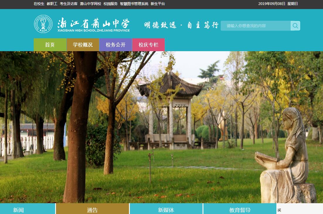 浙江省萧山中学是一所有着近80年办学历史沉淀,散发浓郁书香,锐意创新的省首批一级重点中学,学校基于“品质萧中”的办学理念,注重传承与创新,心存薪胆,奔竞不息,不忘初心,砥砺前行,坚持走“德育立校,科研兴校,质量强校”的办学之路,办学质量高位提升,是培养优秀人才的沃土,打造卓越学子的摇篮,是具有美誉度的浙江省一级普通高中特色示范学校。学校占地180余亩,建筑面积8.5万余平方米。校园依城傍水,翠竹挺拔,香樟成林,自然风光尽显大气风流,人文景致流蕴翰墨书香。学校拥有符合标准、设施齐备的教室85间,专用教室35间,各类资源教室159间。学校图书馆面积达5000余平方米,有各类阅览室9个,藏书13万余册。高精尖的实验设施、标准化的体育场馆、丰富的图书馆藏,为学生们动手实践、放飞梦想提供了广阔的舞台。学校智能化的校园网络体系,先进的智能设备、智慧的数字校园系统,实现了对教育教学的全方位网络支持,通过线上线下、课内课外等形式,实现资源共享,依托“互联网+”智慧校园,尽享学习的便捷和高效。萧中教师孜孜不倦、追求卓越、尽善尽美的“工匠精神”久积弥厚,已经形成了一支具有良好的师德修养、先进的教育理念、厚实的专业素养、出色的科研能力的品质教师队伍。其中全国优秀教师1人,省特级教师5人,省优秀教师、教坛新秀12人,市优秀教师、教坛新秀77人,数理化生等学科金、银牌教练7人,区教育高层次人才30人,高级教师以上职称136人,还有不断涌现出的省市劳动模范、浙江省中小学师德楷模、省市级援藏支教先进等众多先进个人。从全国各地引进的金牌教练、优秀教师,正不断提升着这支队伍旺盛的战斗力。浓郁的学习环境,优良的学生品行,影响着一代又一代萧中学子,而缤纷的课程为学生的成长提供了多元化的发展路径。近年来,高考成绩高位提升,学校每年都有750位左右(近90%)的学生进入全国重点大学深造,其中有一半左右学生被985、211等国内著名高校录取。2016年高考,我校两位学生分别获得杭州市文科第一名、杭州市理科第二名的优异成绩。学科竞赛一年一个台阶,2014年全国物理竞赛决赛获得一枚银牌;2015年全国化学和物理竞赛决赛分别获得一银一铜两枚奖牌;2016年,全国中学生生物竞赛获得国家级金牌1枚,全国中学生生物学、物理学、化学竞赛(浙江赛区)一等奖10人。同时在人文素养、科学研究、文体特长等各类竞赛中脱颖而出。2014届张寒城同学在《数学通报》上发表的论文获得第七届“丘成桐中学数学奖”国内二等奖;2018届沈寒暑同学获得全国第十九届新概念大赛一等奖;2016届俞祎同学获得第五届浙江省十大校园新锐写手一等奖第一名。连续多年在省教育厅公布的高校新生体质健康测试数据中,学校居全省高中学校体质健康测试总分平均值前5名之列;每年均有十几位学生被中国美院等著名艺术院校录取,有十多位体育特长生作为高水平运动员被上海交通大学、华中科技大学等国内著名高校录取。学生活动丰富多彩。学校活跃着27个学生社团,其中“红帆文学社”扬帆三十年连续多次获得全国校园文学优秀社团称号,“萧中XTV”直播校园文艺节创下点击量达112万奇迹且连续两年被评为省中小学优秀校园电视台,“萧中志愿·Innoheal”团队自费远赴贵州边远山区调研留守儿童心理问题,展现了萧中学子敢于社会担当的精神风貌……一年一度的由学生自主设计、组织的科技节、心理节、体育节和文艺节等活动也为学生提供了施展才华与能力的广阔舞台。学校围绕“品质萧中”的核心理念,把“工匠精神”注入育人的血脉,坚持品质立校,打磨管理细节,谨记“心存薪胆,奔竞不息”校训,着力打造“高品位、高质量、有特色,省内领先、国内一流的示范性高中”,学校品质得到了极大的提升,是首批浙江省一级重点中学,省文明学校、省文明单位,省一级普通高中特色示范学校、杭州市首批“美丽学校”。融入主城区以来,萧山中学以“体现世界名城风貌的现代化国际城区”审视自我,以教育国际化为愿景,加强与韩国、美国、德国等名校的友好合作与交流,引入国际先进教育理念,通过举办国际名校直通班,共享教育资源,助推学生升入剑桥大学等国际名校,拓宽学生的国际视野。